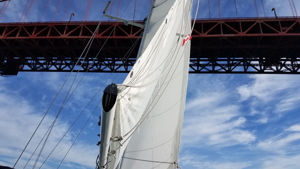 Determined NOT to sacrifice the first nice day in a while to doing JOBS, we just installed the new anchor bow roller (10-minute job) ans went for a sail. With the new main and stack pack due for install this week, this was (hopefully) the last time we’ll raise the old mainsail.
