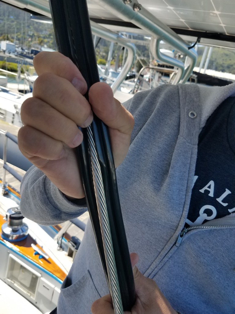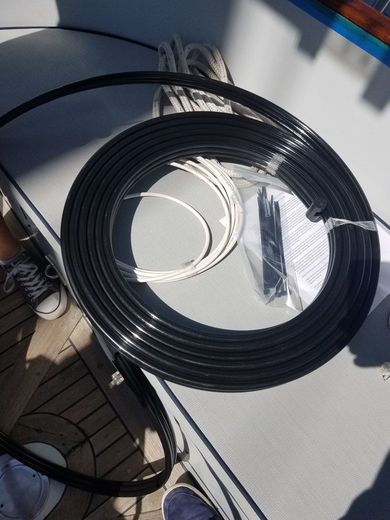 With a good SSB Radio on board, and a Kenwood tuner, the only thing missing was an aerial. This was taken down when the mast was off foe refurbishment and painting, and the standing rigging. Most unfortunately, this coincided with the sudden passing of the previous owner, and the SSB antenna was never replaced. We actually got a repair allowance in the purchase agreement for this, and FINALLY, we got this ordered, and installed.