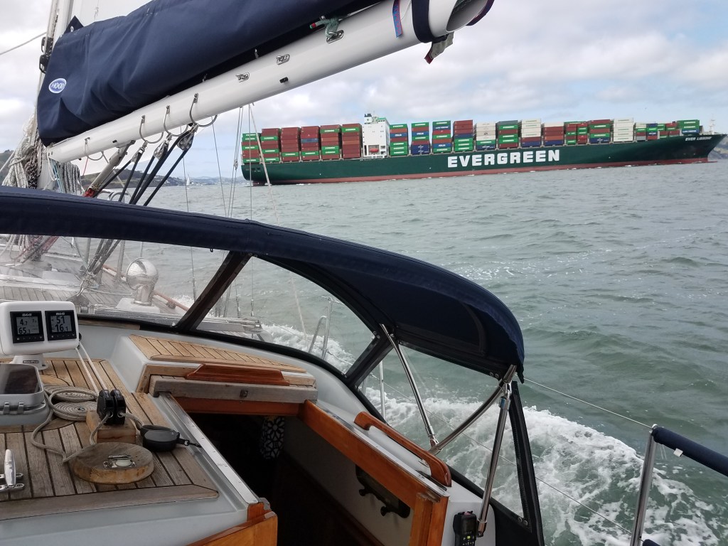 Sunday – 5/5/2019 The wind was nice and blowy and we were looking to get Boundless out for a romp, but avoid the SailGP craziness, so we headed across the city, and the out of the way up towards Red Rock before the racing started. We took in a reef, and then swapped the headsail for the staysail as the wind settled in. A trip under the Richmond Bridge we turned to head back against the last of the flood, tacking around the bridge to avoid a big ship heading north.