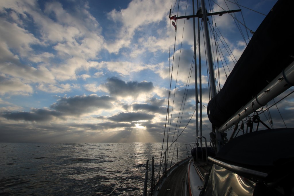 The sun tried to rise out of the clouds today but didn’t quite make it. It was cloudy and overcast all day with very light winds. We sailed, motored, sailed, motored. Overall a very grey day, with variable wind but some ominous looking clouds at times.