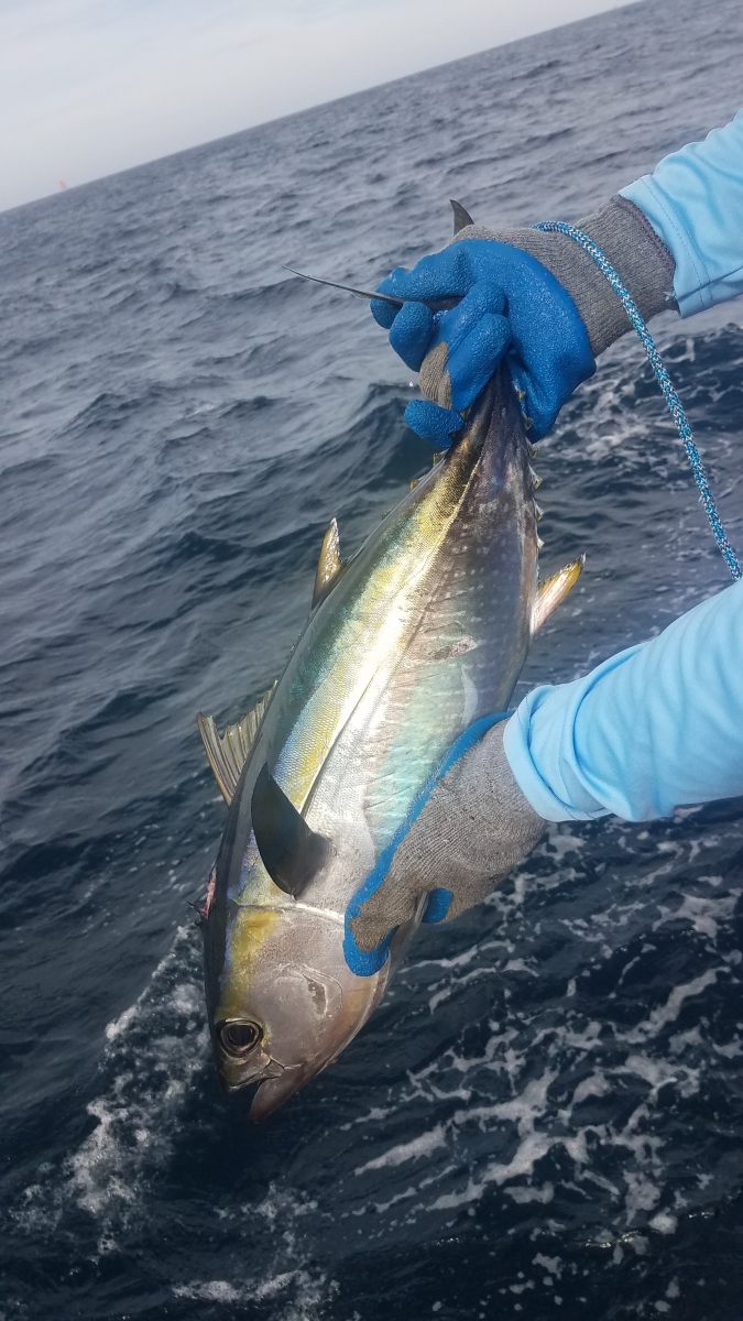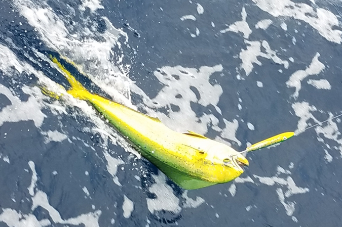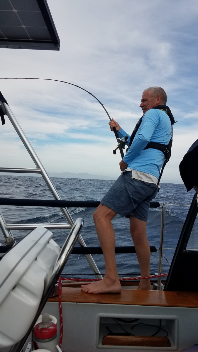 Around noon we cast out the hand line and within 3 minutes had caught a yellow fin tuna. Within 5 minutes we had it in the fridge in fillets for dinner. About 3 minutes later we had a bite on the fishing line with a different lure and as it was brought it we were excited to see we had FINALLY caught a dorado. We were so pleased. We decided that despite having to sail all night we were going to grill the dorado on the barbeque as we sailed and just make sure we didn’t lose it overboard.
