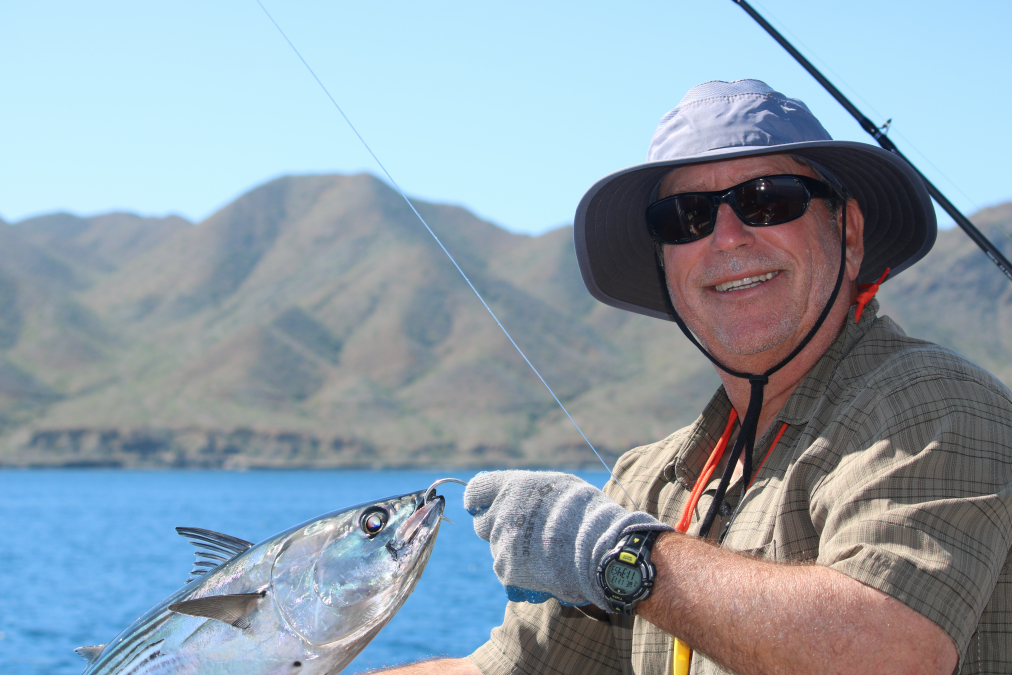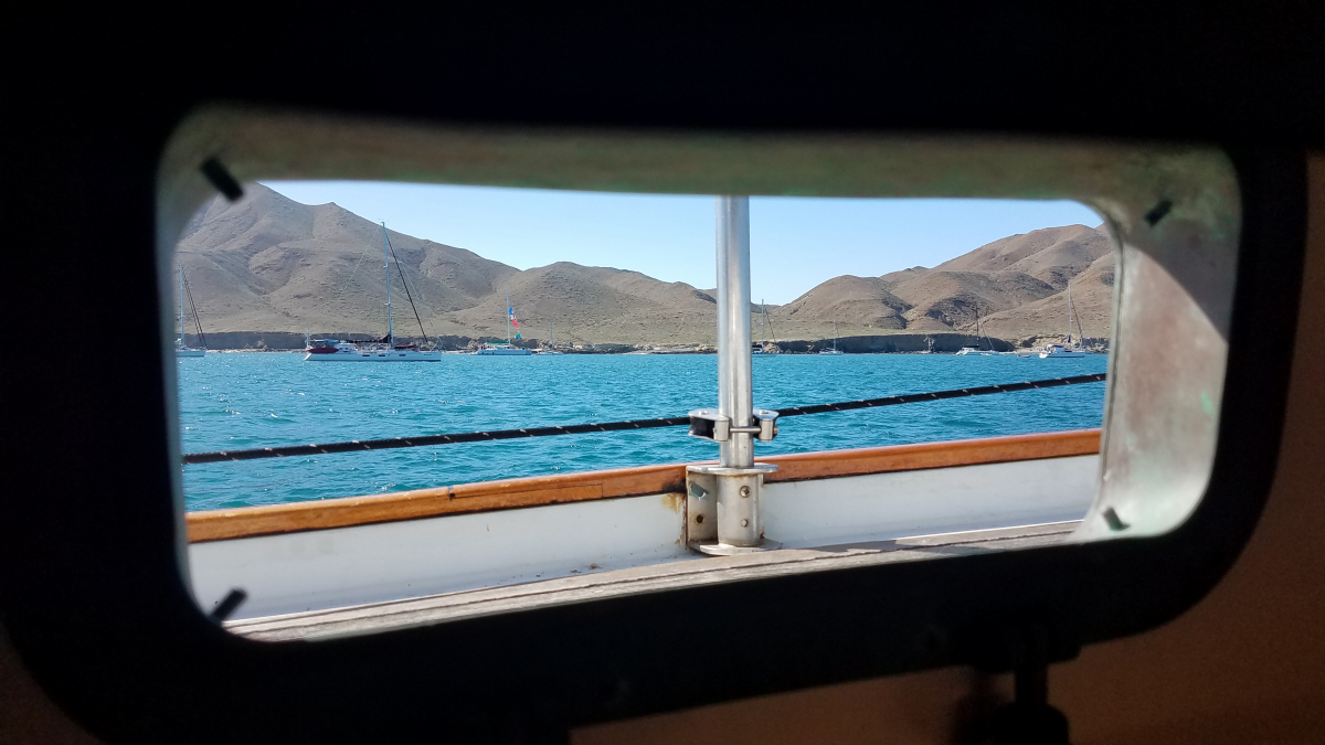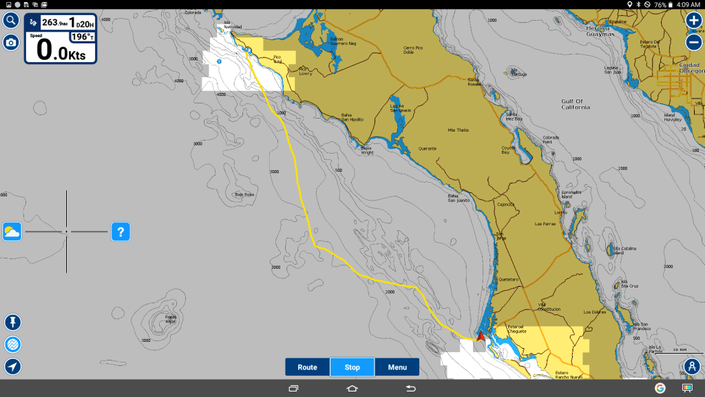 As night fell we had to decide whether to slow down and enter Bahia Santa Maria during sunrise or to keep going our course and enter at night in the dark. Most mariners usually won’t enter an unknown port at . We discussed this and decided that because we were part of the Baja Fleet, we could always wait and follow another boat in, or we could “hove to” outside the bay and wait until sunrise. We decided to go for it and then follow a Baja veteran boat into the bay. The moon was getting fuller and brighter after our very grey day and it was lighting the way for us to follow.