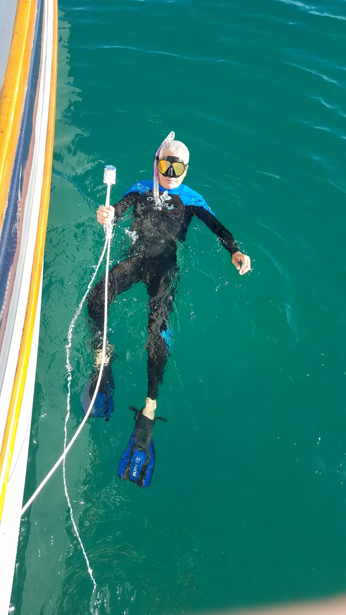 Dropping the hook, we took a walk on the beach, then Colin donned his wetsuit for a test and even cleaned the very slight growth on the waterline. A FIRST … being able to peer through crystal blue water to see our chain snaking along the bottom leading to our anchor buried in the sand.