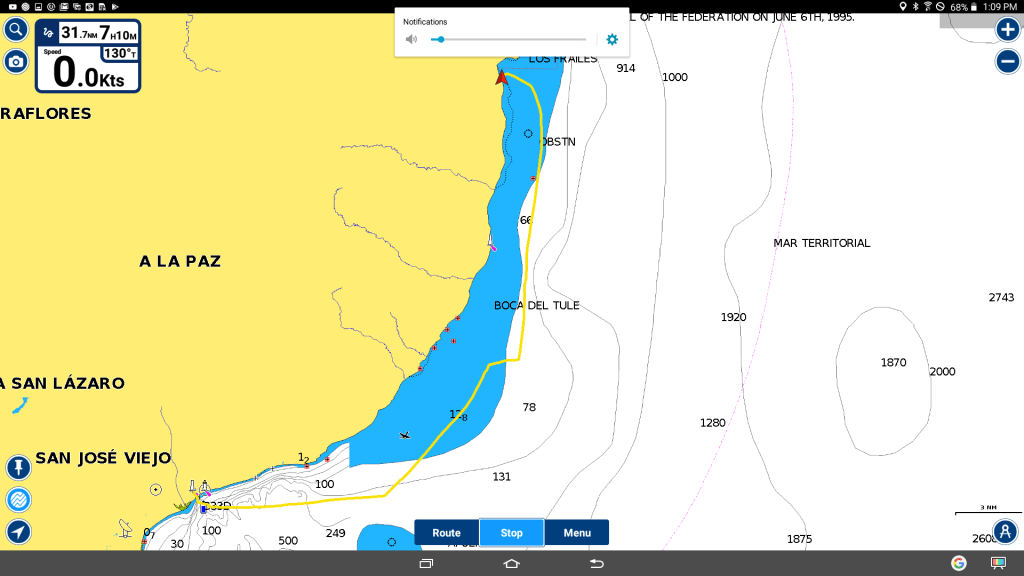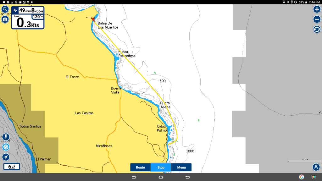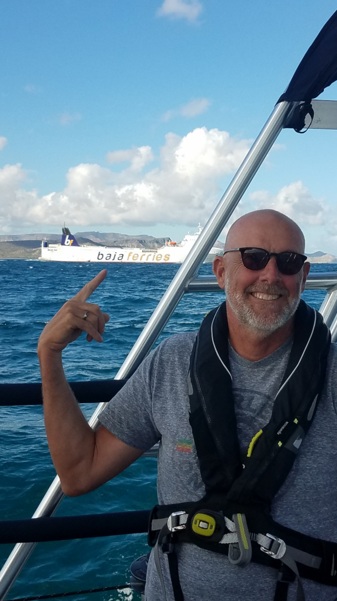 We set out early with the anticipation of this being the final leg of our trip from San Francisco to La Paz, and had breakfast of coffee and toasted muffins (alas, this is the last of the Trader Joes jam). With good wind we raised the sails and found ourselves finally, after a month of downwind, going to weather, chomping along rounding Arena de la Ventana and into the Cerralvo Channel with a knot or more of current in our favor. Once in the channel the chop developed and created a spirited sail. The fishing yielded one skipjack which was released and one fish that took off with our prized dorado-catching lure. With a couple of tacks (our first since San Francisco), and some motor sailing to keep progress through the worst of the chop, we found ourselves rounding the entrance into Bahia de la Paz, meeting the Mazatlan ferry in the narrowest section of the cut.