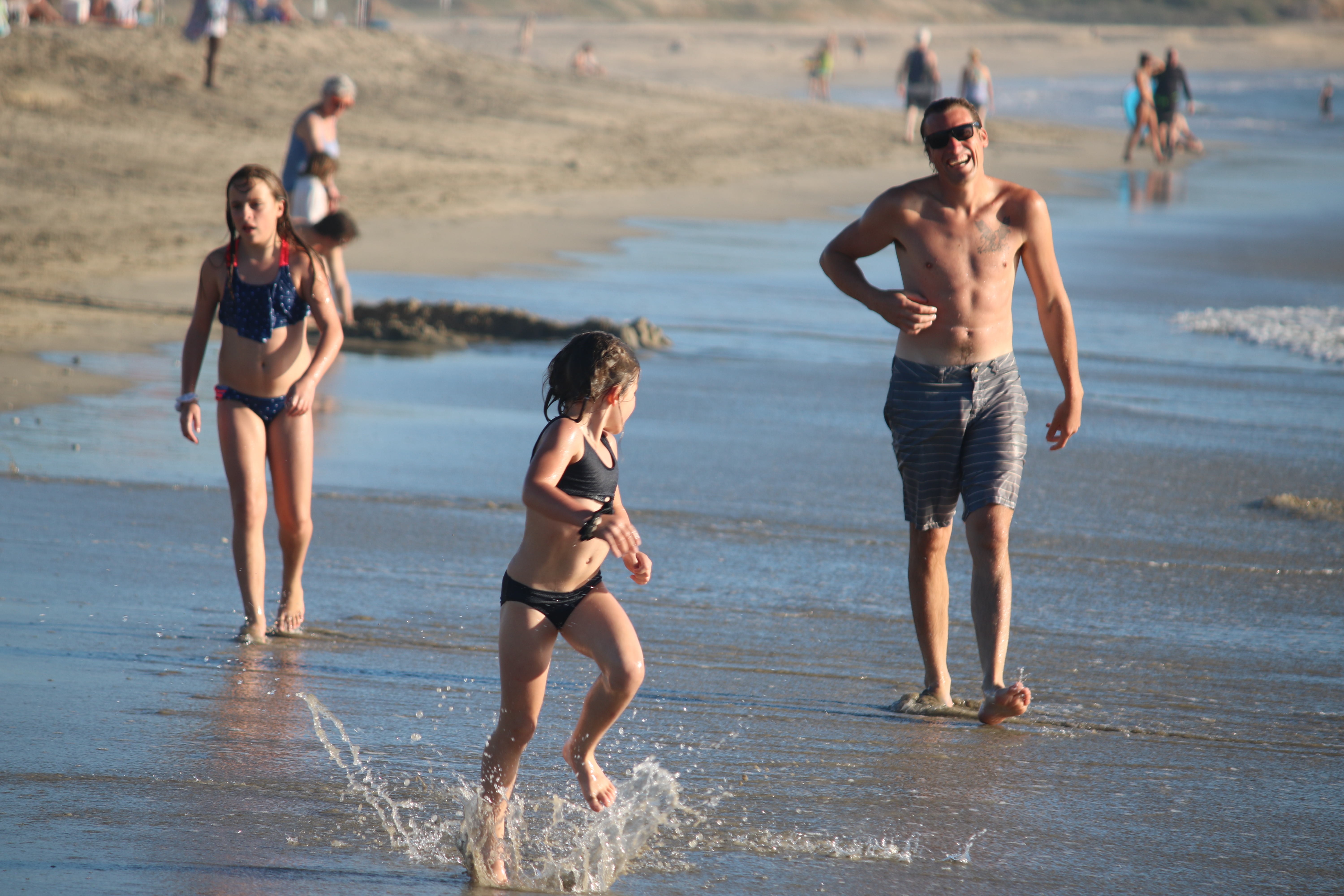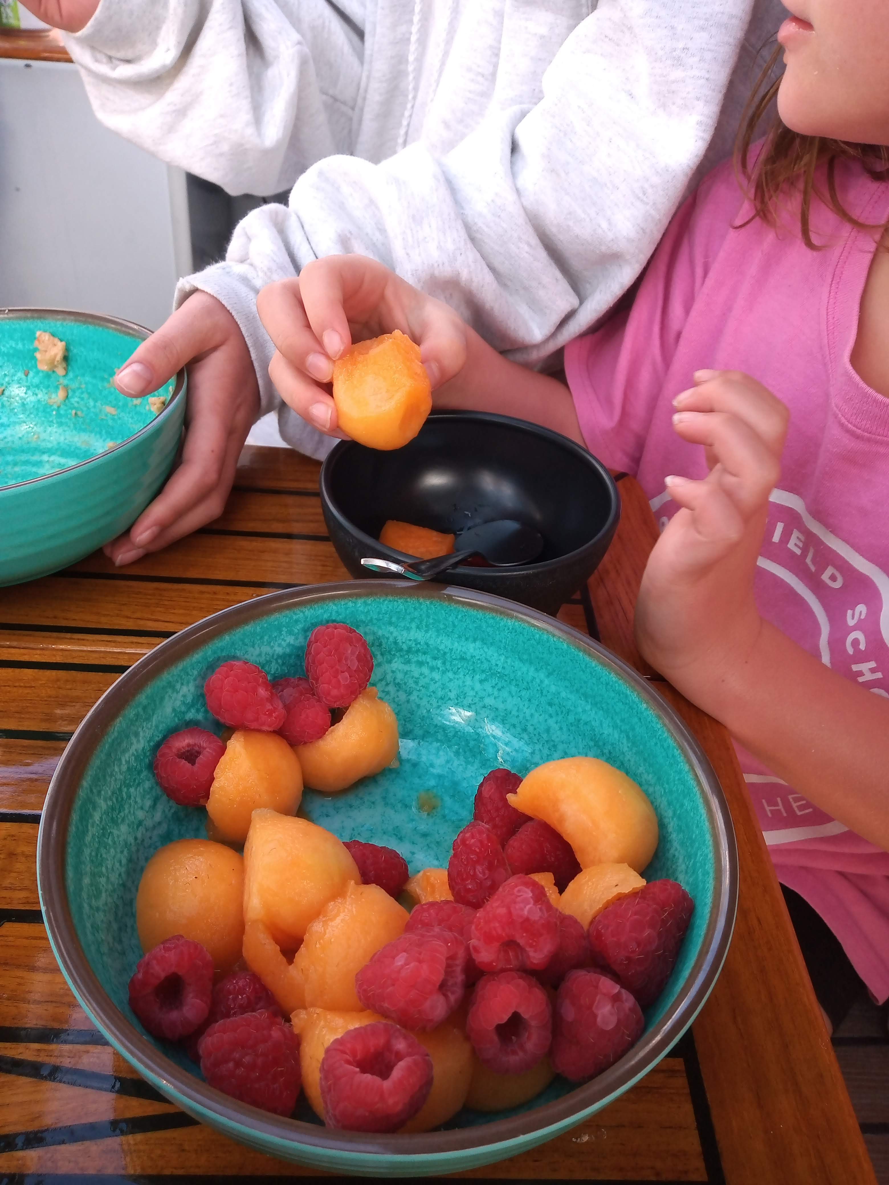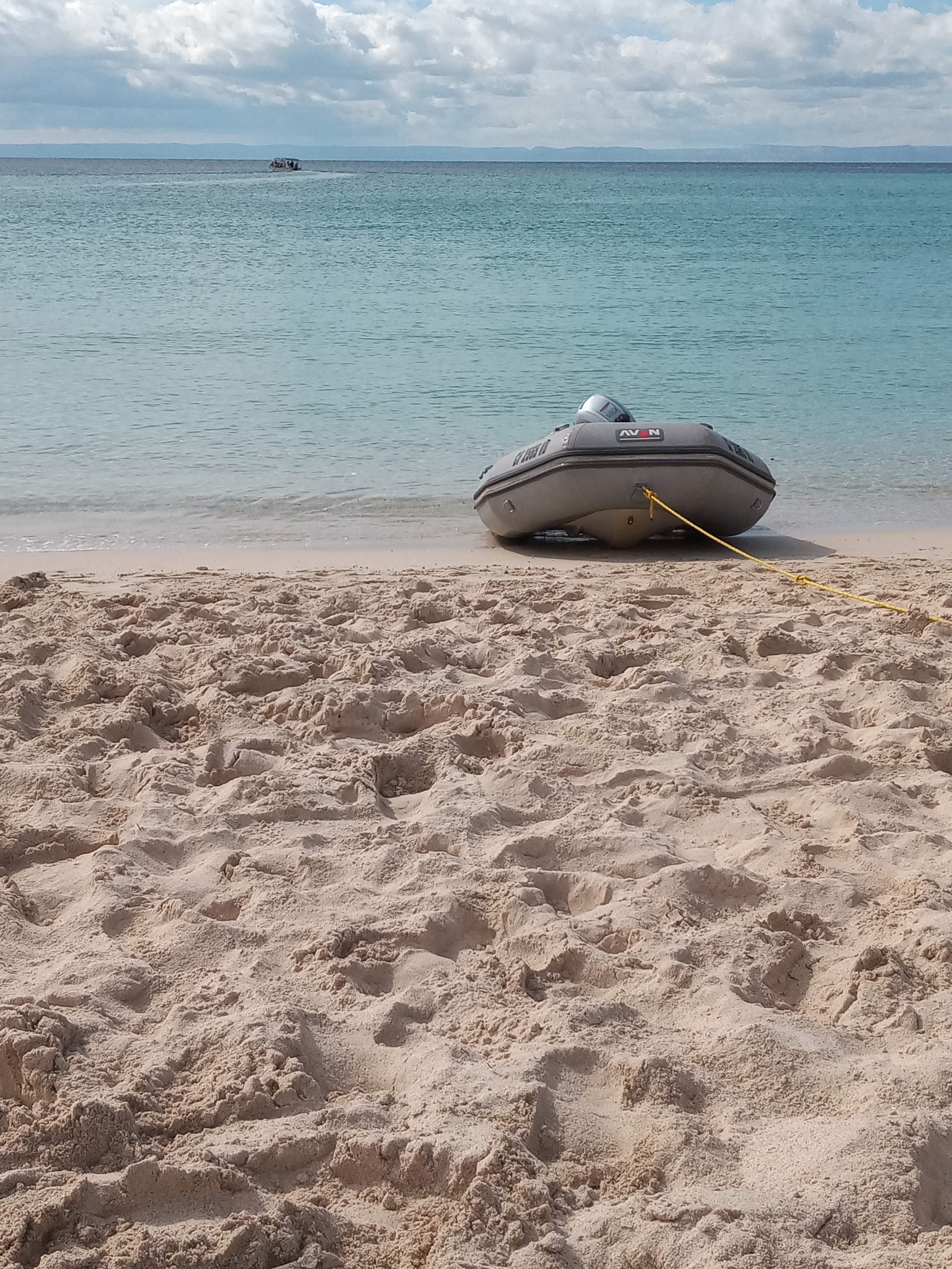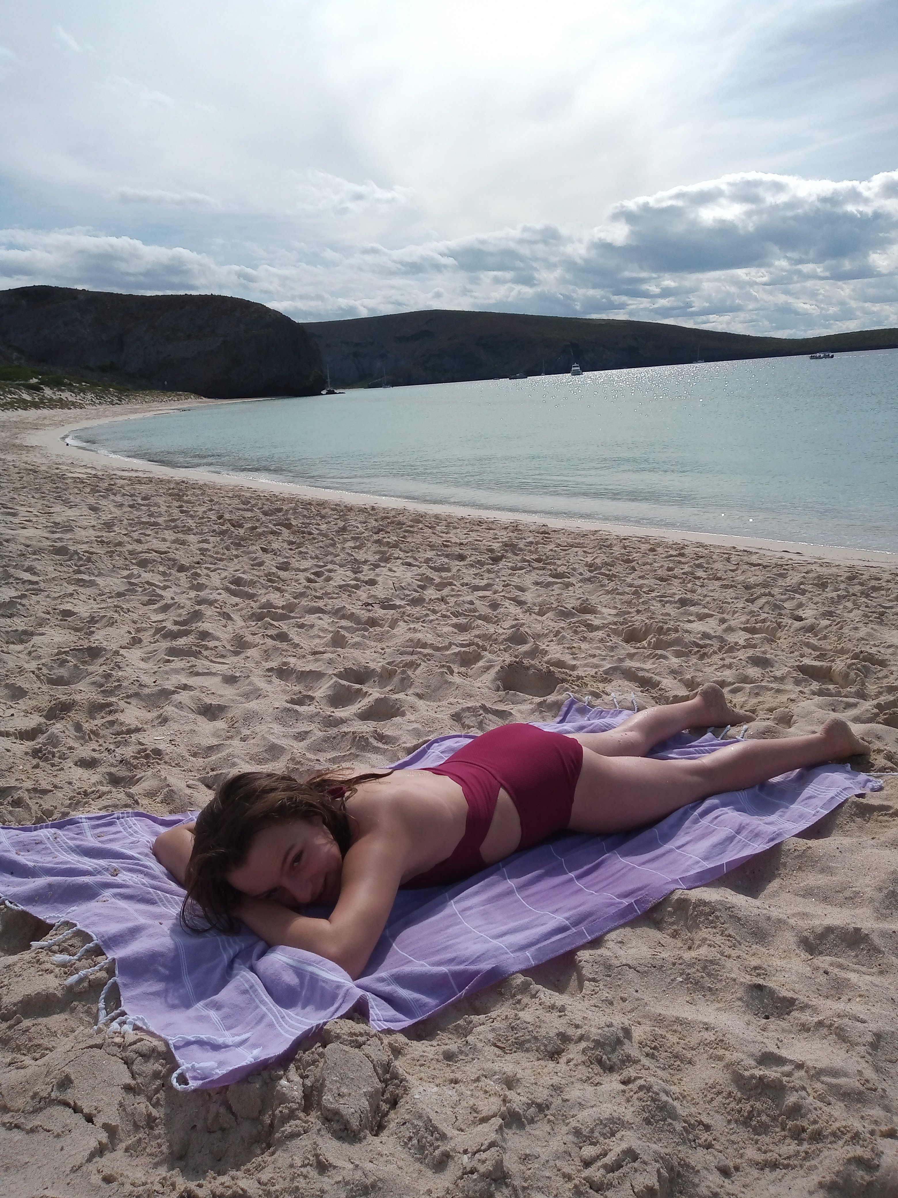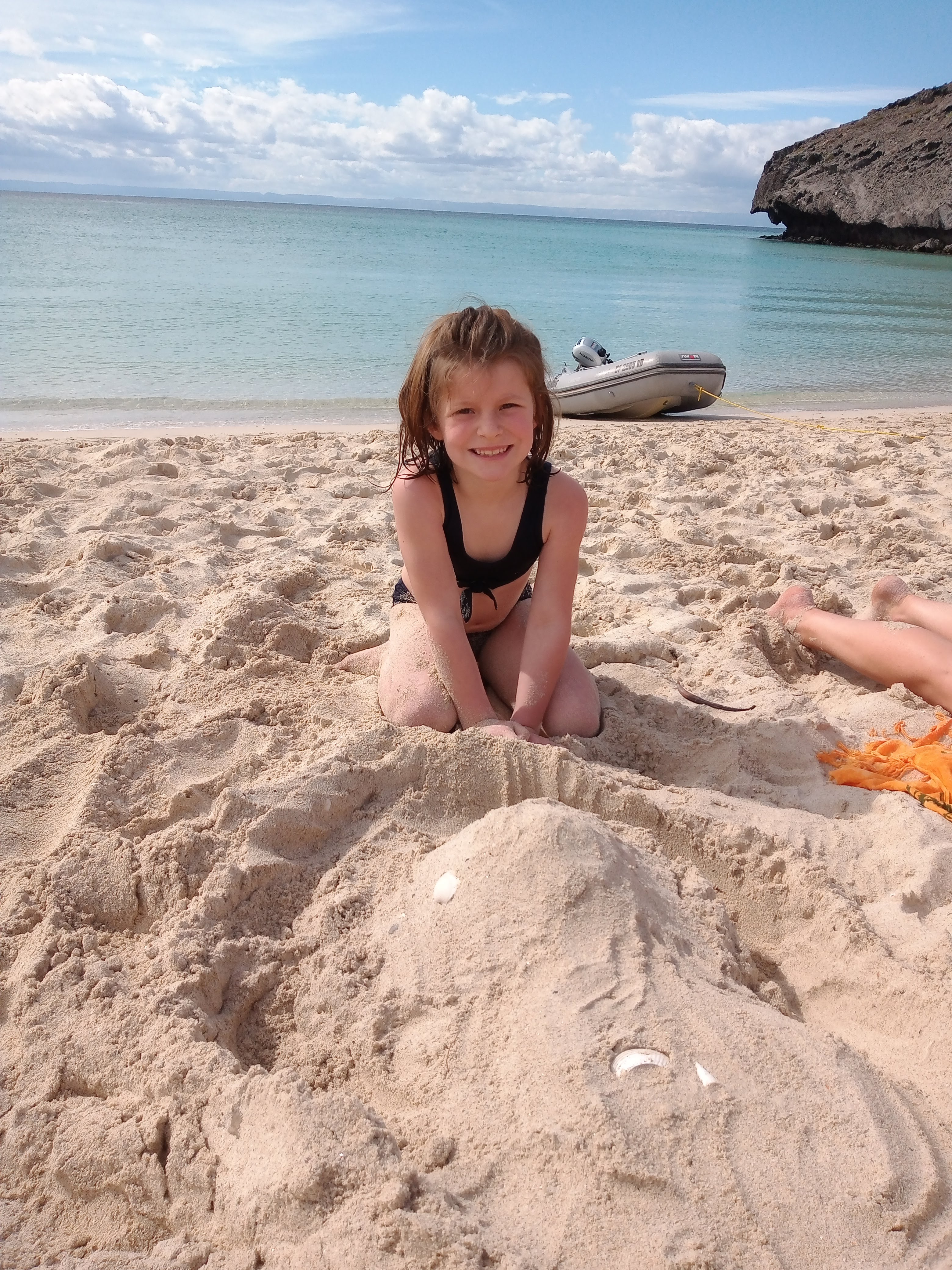 Thursday 1/9: We had a very pleasant night on board, but woke up to grey skies and an albeit peaceful, beautiful surroundings, so we headed out with the plan of getting back to Balandra to enjoy some afternoon sun. Will, determined to catch a fish had three lines out. We spent a fun afternoon on the beach, with the girls much more comfortable playing with the snorkel kit. Will, Maddie and I (Julian) took a dinghy ride around the point to the deserted beach (deserted other than the ever-present pack of four dogs we have seen a number of times), and had a great time exploring the rocky shore, with fish, bright orange crabs and a crystal clear view of the sandy floor.