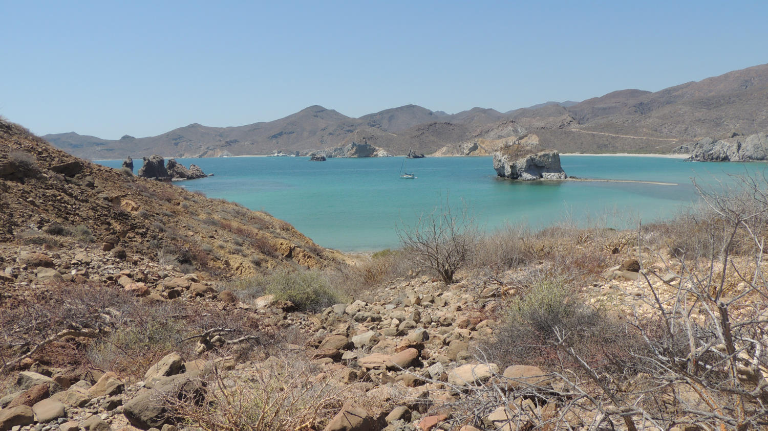 We pretty much sailed off the anchor, and after 30 minutes the wind filled in nicely, so we enjoyed a spirited beam reach up to San Juanico. The fishing improved, and, to our astonishment, we caught two striped bonito, and kept one. San Juanico is a large bay and the north part is particularly pretty with anchorage possible amongst some dramatic pinnacle rocks, however, we had experienced fairly healthy southerlies over the last few evenings and chose the less attractive, but better protected south end, along with three other boats already there including Totem. We had a chat with Jamie from Totem on the VHF and agreed to meet the next morning.