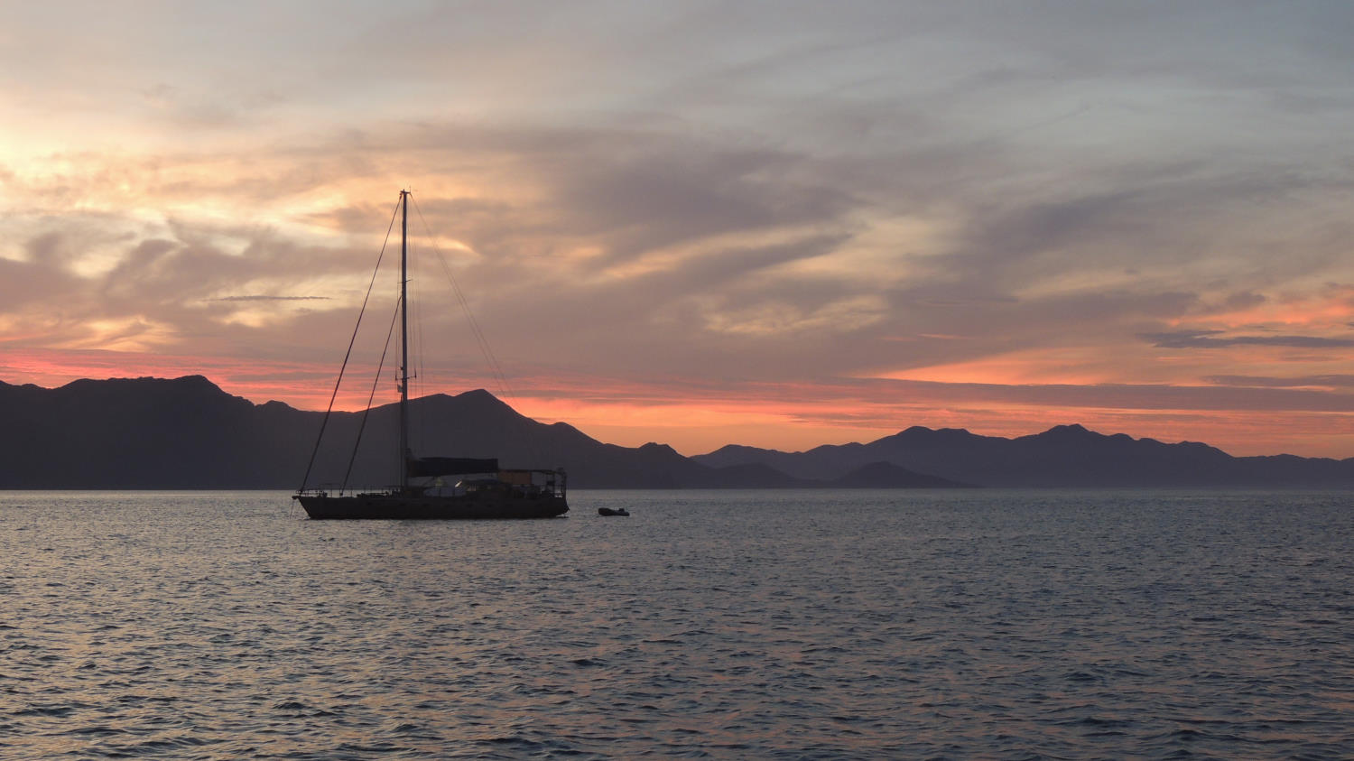 Of course as soon as we got the spinnaker down the wind abated and the poled out jib was not going to get us to Bahía Concepción by dark, so we motored and sailed, to make our way. The water at this part of the Sea of Cortez is not protected by any islands and the sea state more resembled some lovely friendly ocean rollers, which made for a really enjoyable sail. The turn into Bahía Concepción late in the day was beautiful, and still under sail, we rounded the headland and into the bay. The Santo Domingo anchorage is a wide bay and, although less dramatic than most, is very pretty. A lovely night, warm wind, stars, and a crescent moon.