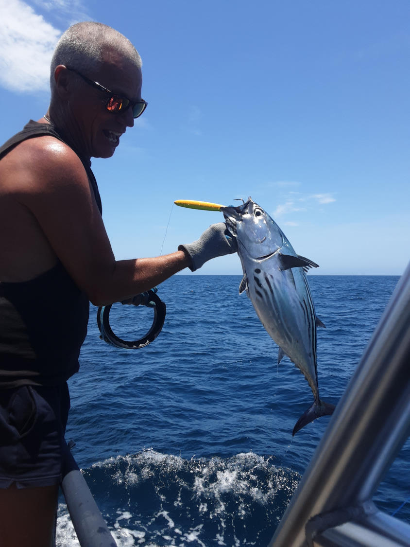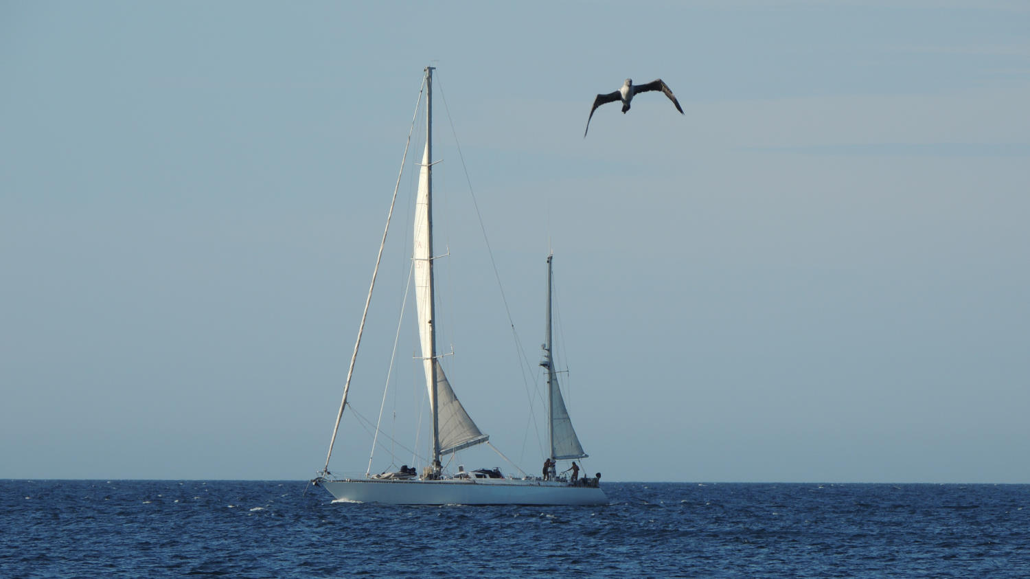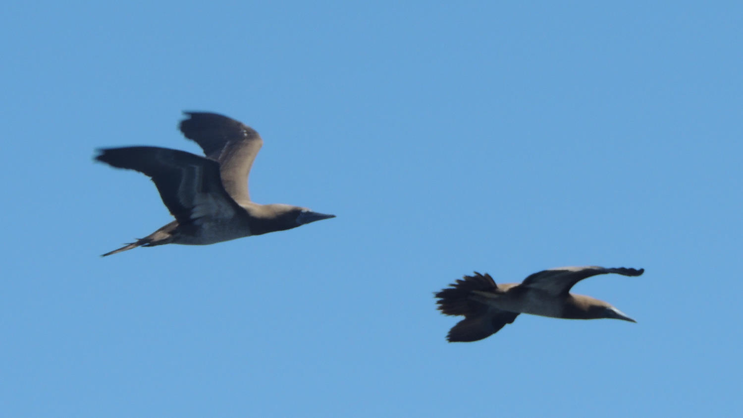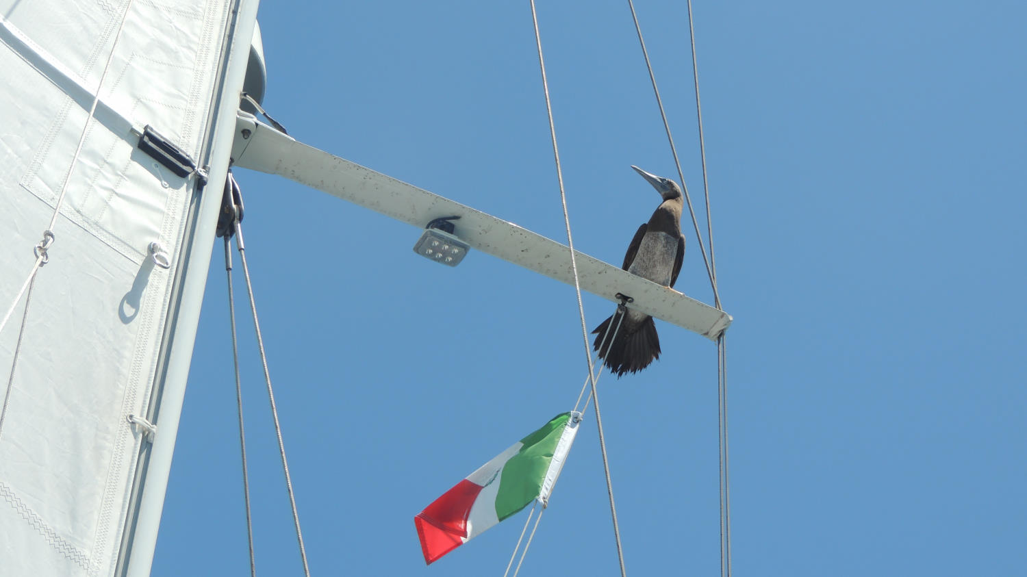 After a short motor, the wind soon filled in and we got the spinnaker up and had a great run for a while. With the wind backing more, we successfully poled out the tack of the asymmetrical to windward and continued until the boat was surfing along in a building 16 knots. We were joined by a group of birds who were clearly enjoying playing in the draft off the sails (we think these birds are brown boobies). the birds also showed interest in the lines we were trailing, and given the pelican experience, the lines were quickly pulled in.