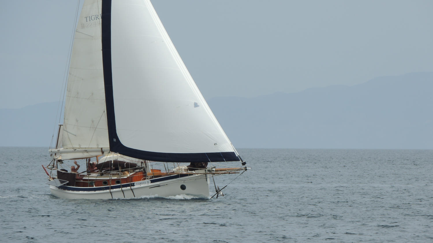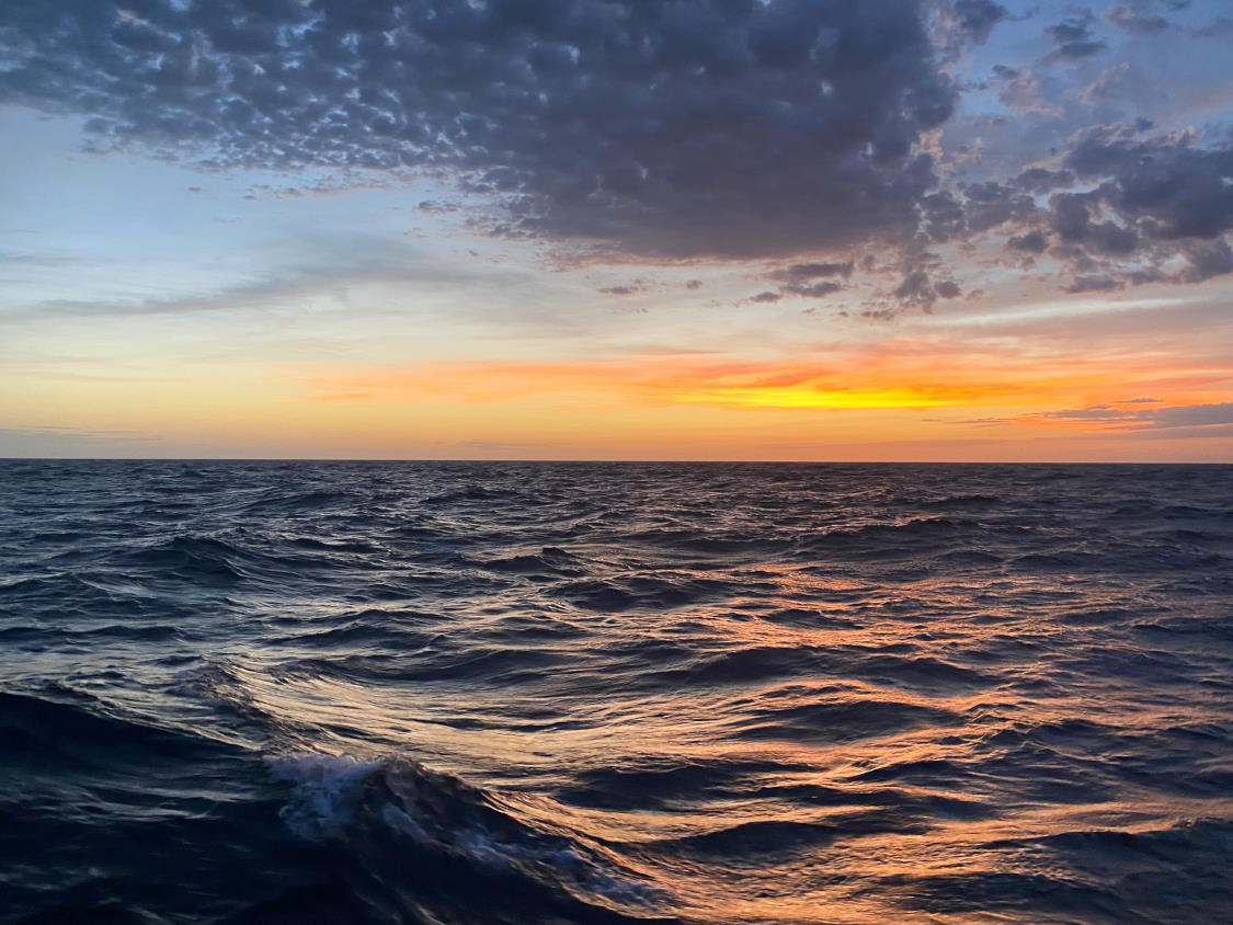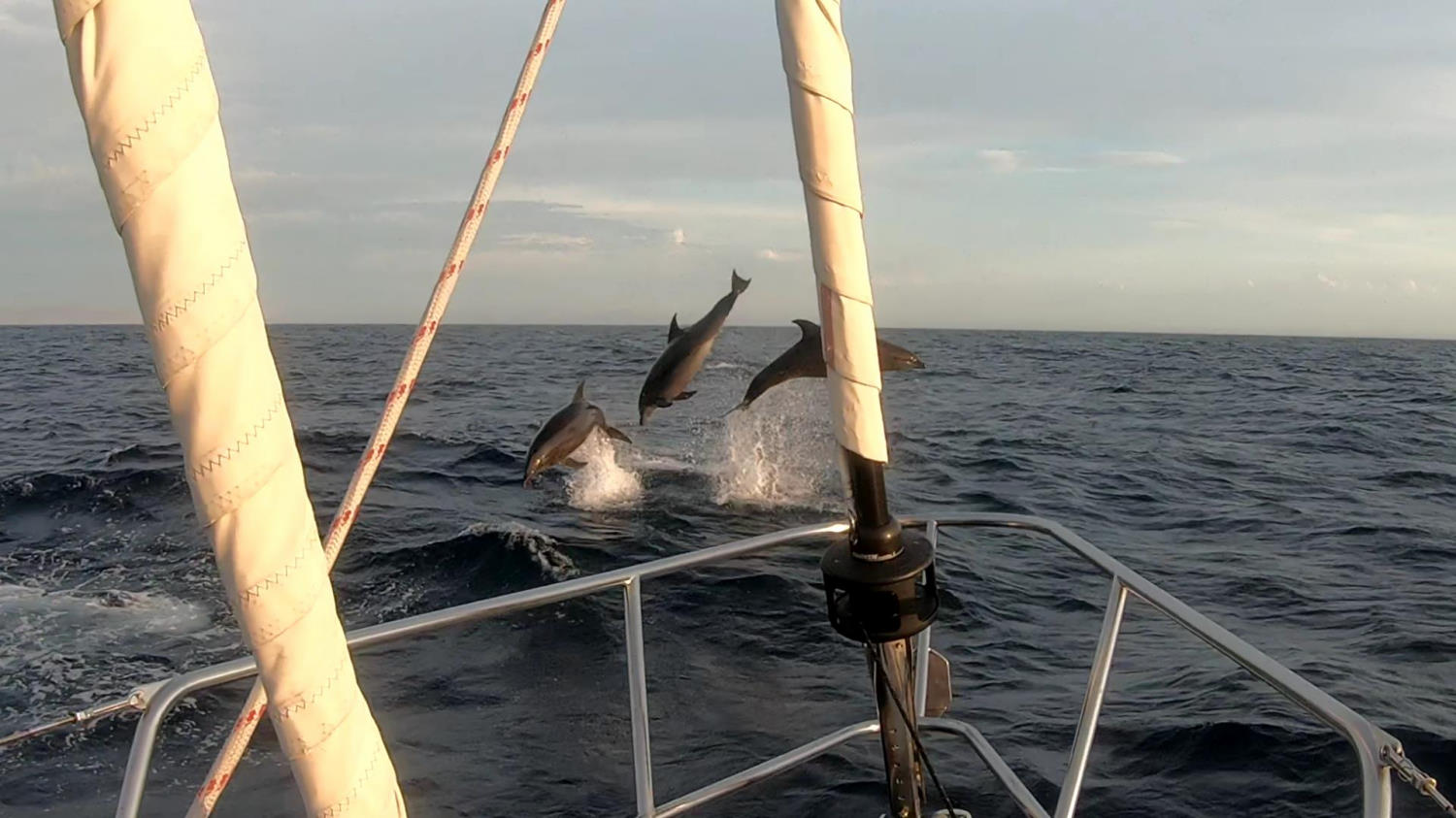 Fortunately, dawn came (not too soon) and the lightning disappeared, leaving us with a windy sail with choppy seas, from behind or on our quarter. We sailed the whole day with a reef in the main and saw winds consistently 20 – 25 and gusting higher. Just as we were settling into the lovely morning sail, we were visited by dolphins and treated to a short but spectacular display including a ‘Seaworld’ three-dolphin leap.