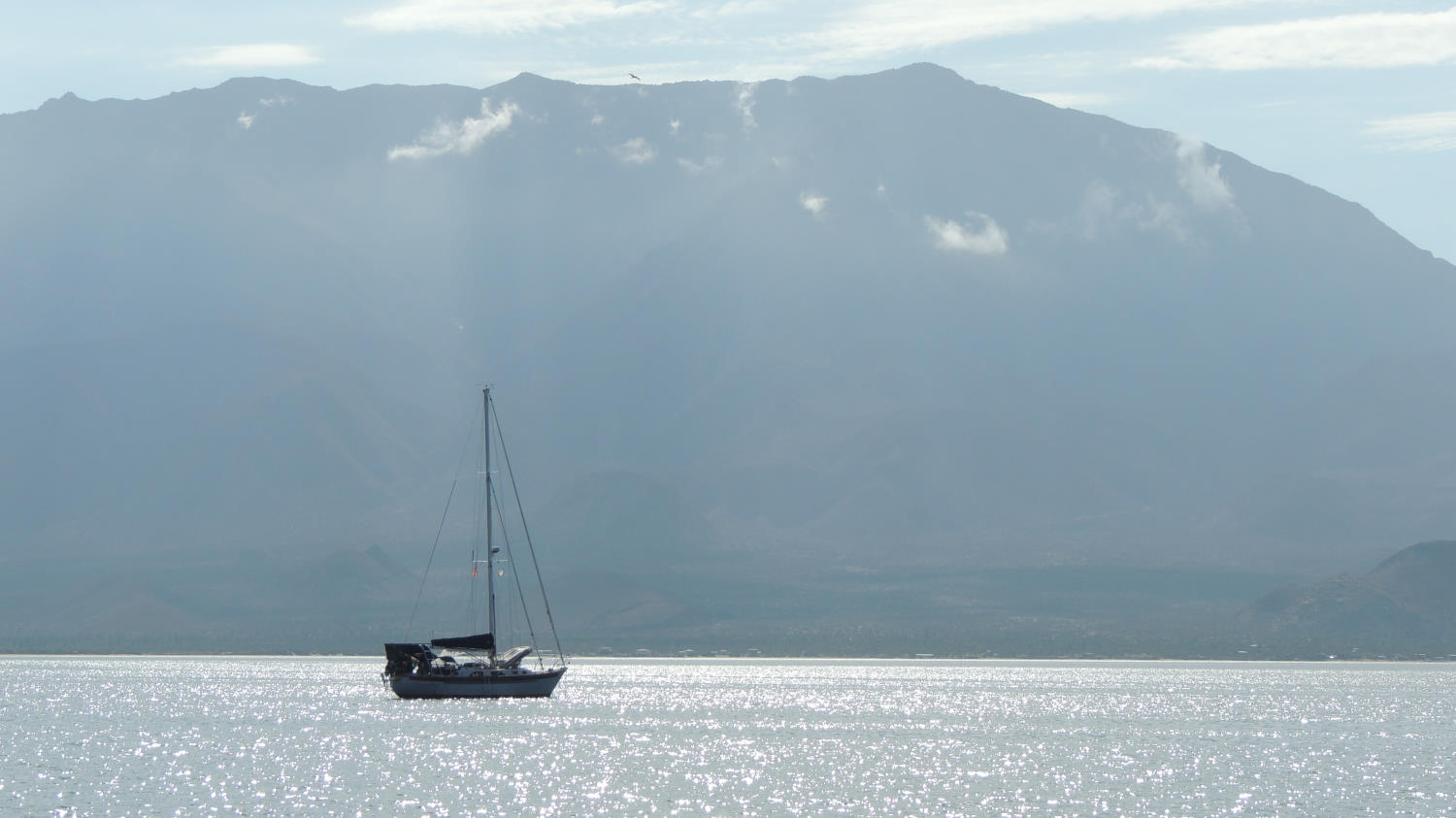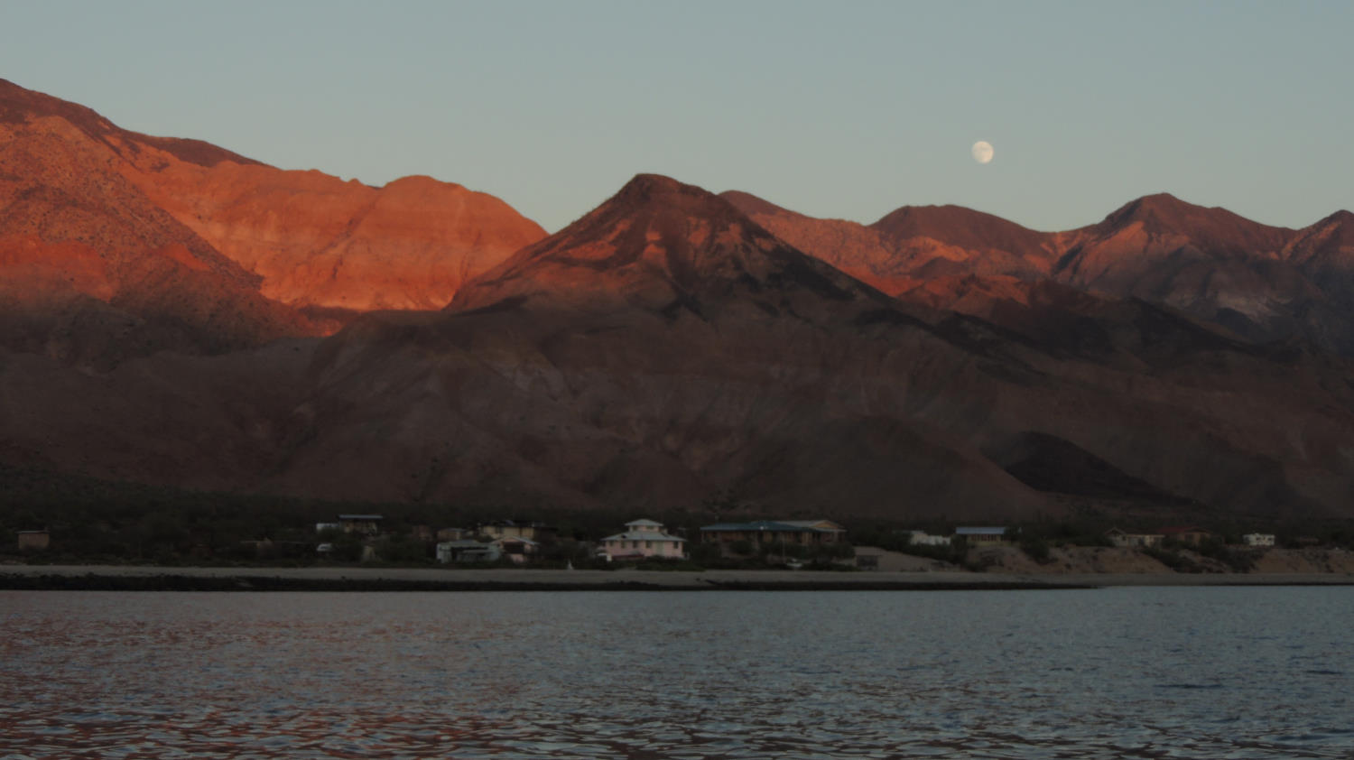 With no fresh vegetables remaining, we headed for the tiendas of Bahía de Los Angeles village, and had a pleasant downwind sail around the point, passed the entrance to Don Juan, and through Los Gemelos islands (the twins). On entering the BdLA however, the wind picked up and we saw some ominous clouds to the south, and, thinking we would probably not go into the village until the following day anyway, we opted for the southerly protection of La Mona, and enjoy the 7+ knot sail down to the south end of the Bay. Of course, within a few hours, and after twelve drops of rain, the whole thing had passed and it was a beautiful evening, and we were left hearing SUNPIPER and DOGFISH chat on the radio about meeting for Tacos (dammit!). La mona was very pleasant however, Julian took a short walk on the beach in front of the vacation homes, and the big moon rising over the hill was quite the sight.