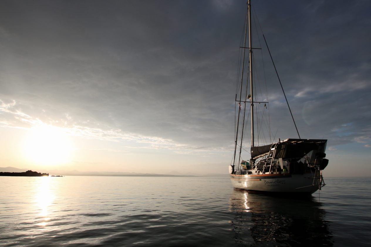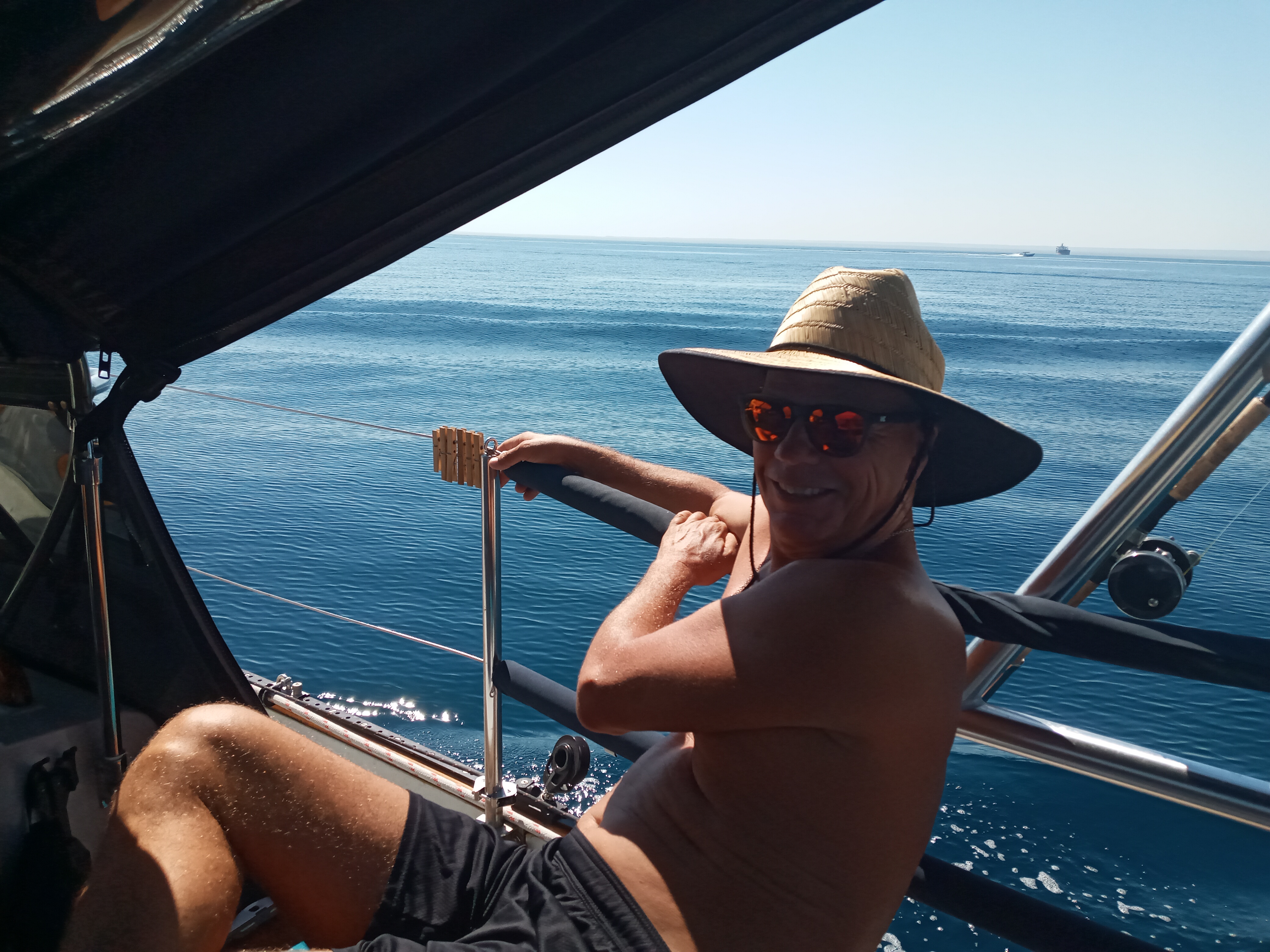We woke just in time to see Sans Souci heading out under sail in a light breeze towards the rising sun. There was a change in the temperature with some approaching weather and for the first time since we arrived back in Mexico in June, Colin went looking for a hoodie. We left about an hour later and enjoyed great wind all the way, traveling at a nice 6 – 7 knots for a good while. We caught two more bonita (thrown back) and lost yet another lure, this time from the rod along with a whole bunch of line.