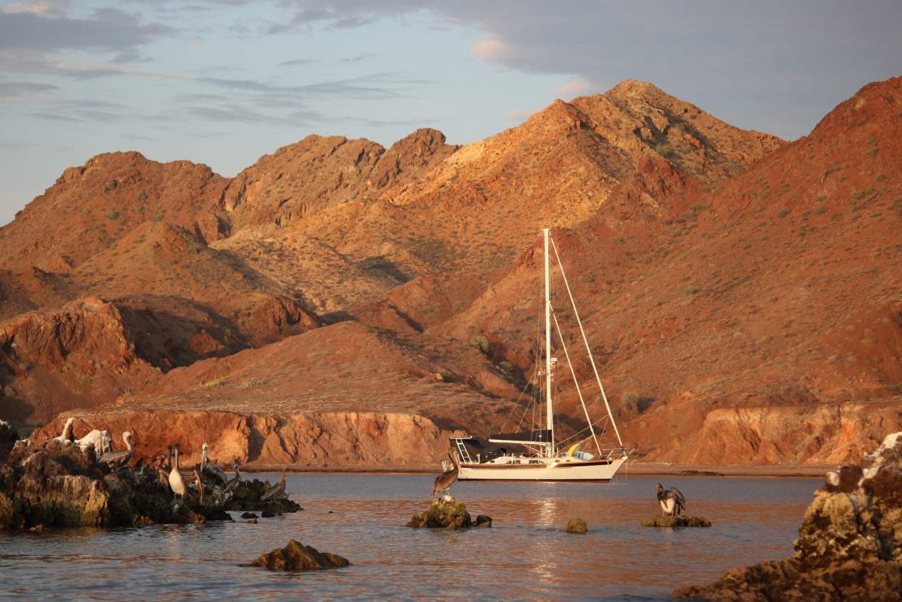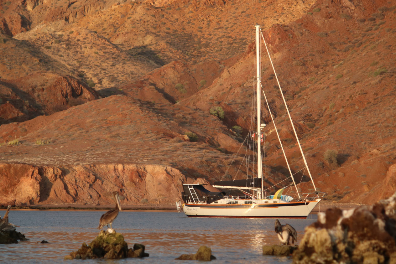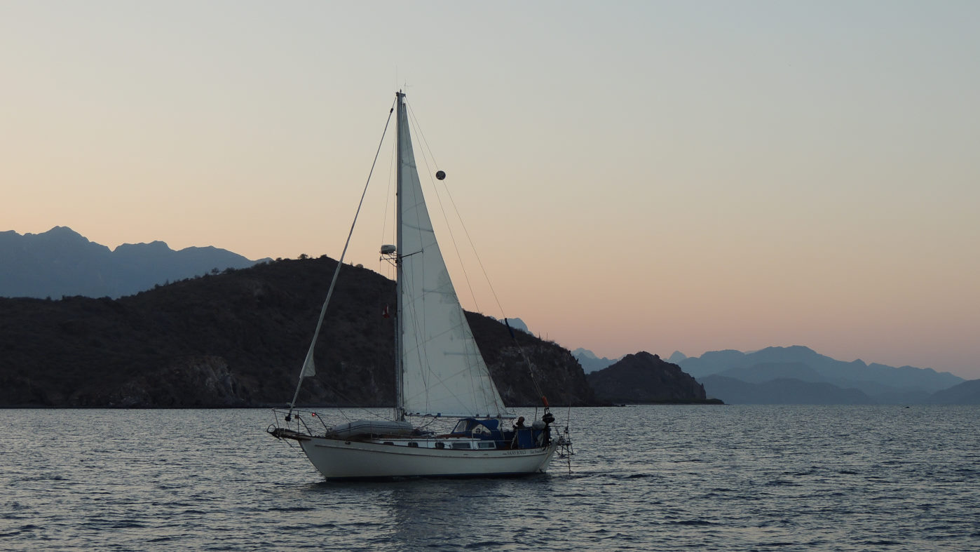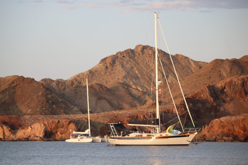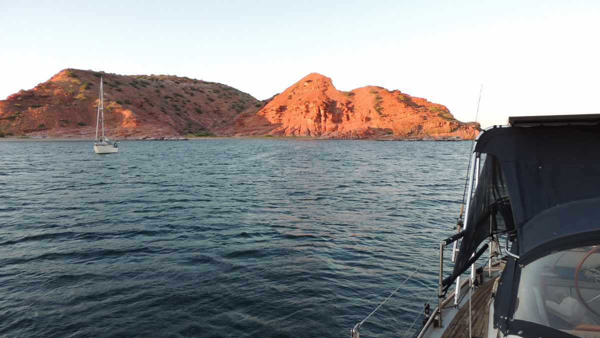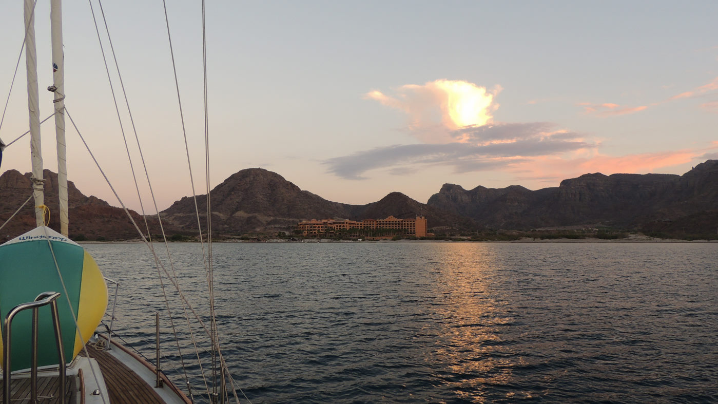 As soon as we cleared the wreck site buoy, we killed the engine and tacked our way out of the bay, enjoying a very pleasant sail, past the rugged landscape of Isla Carmen, and the jagged profile of Isla Danzante. We motored the last few miles and with the promise of dinner at the resort, we waited for San Souci, who had battled to beat their way out of the Puerto Salinas anchorage, and then sailed onto their anchor in Candeleros as the light was fading, just in time for us to collect them and head to the resort for some well earned restaurant food and cocktails.