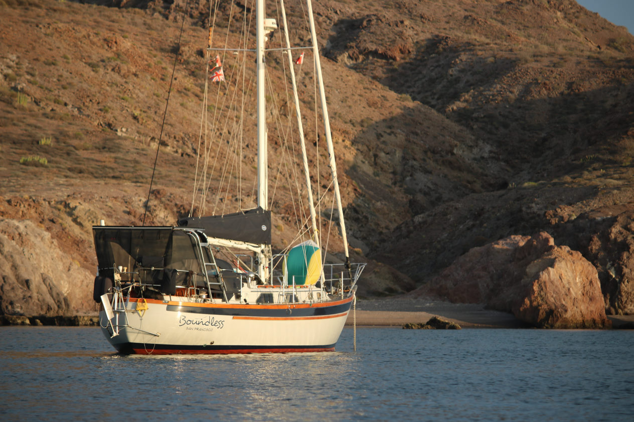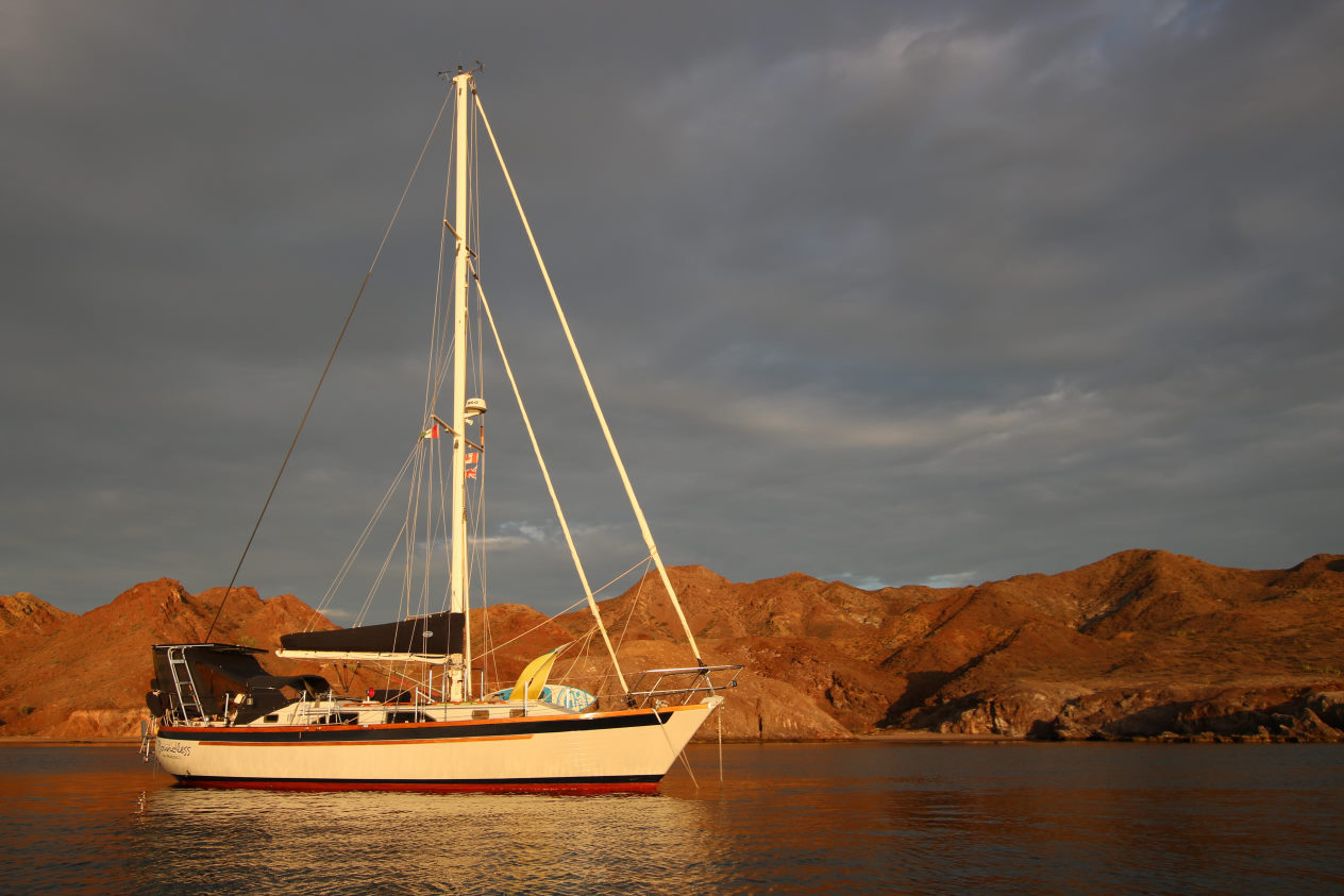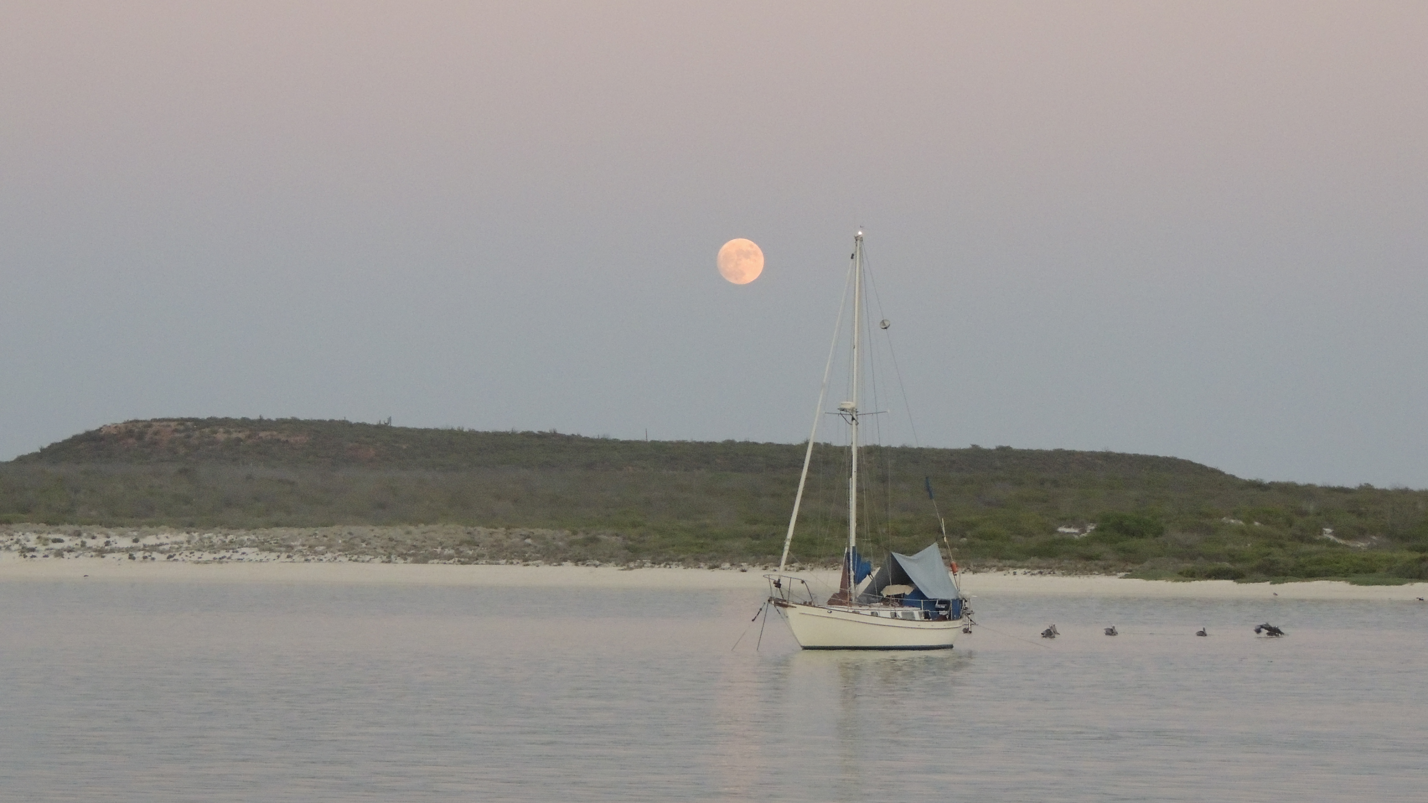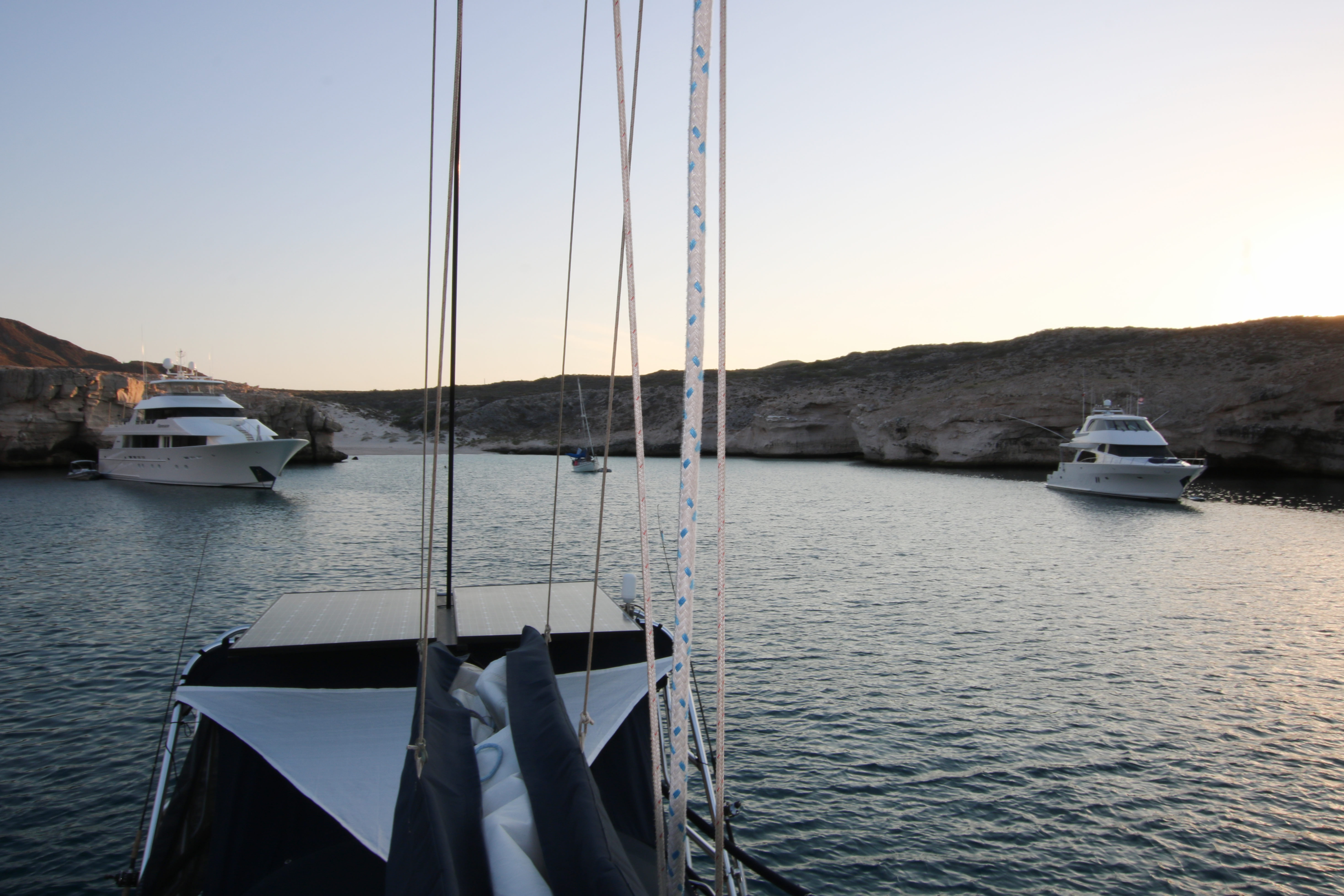 As soon as we cleared the wreck site buoy, we killed the engine and tacked our way out of the bay, enjoying a very pleasant sail, past the rugged landscape of Isla Carmen, and the jagged profile of Isla Danzante. We motored the last few miles and with the promise of dinner at the resort, we waited for San Souci, who had battled to beat their way out of the Puerto Salinas anchorage, and then sailed onto their anchor in Candeleros as the light was fading, just in time for us to collect them and head to the resort for some well earned restaurant food and cocktails.