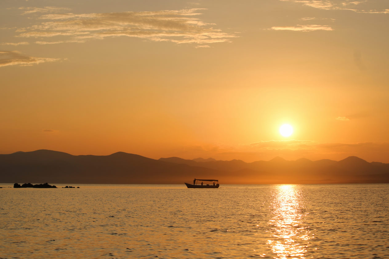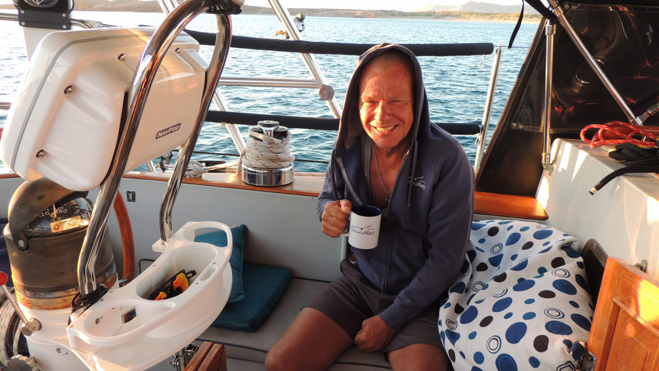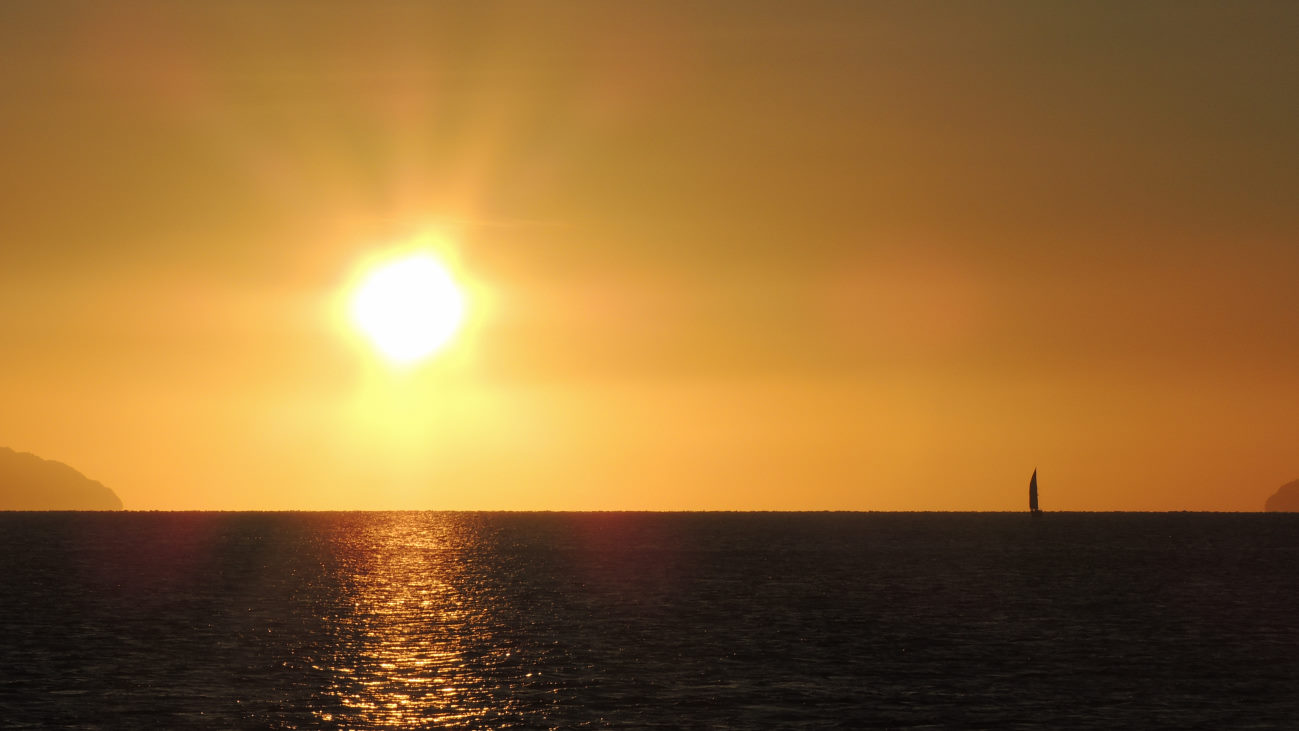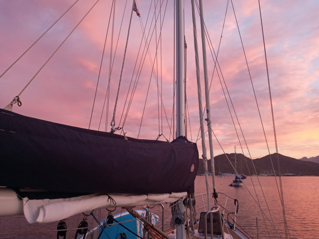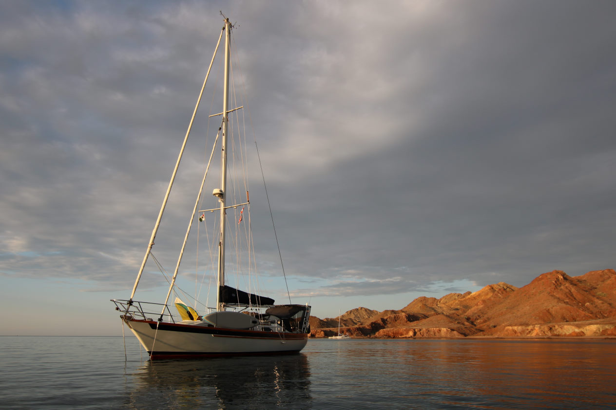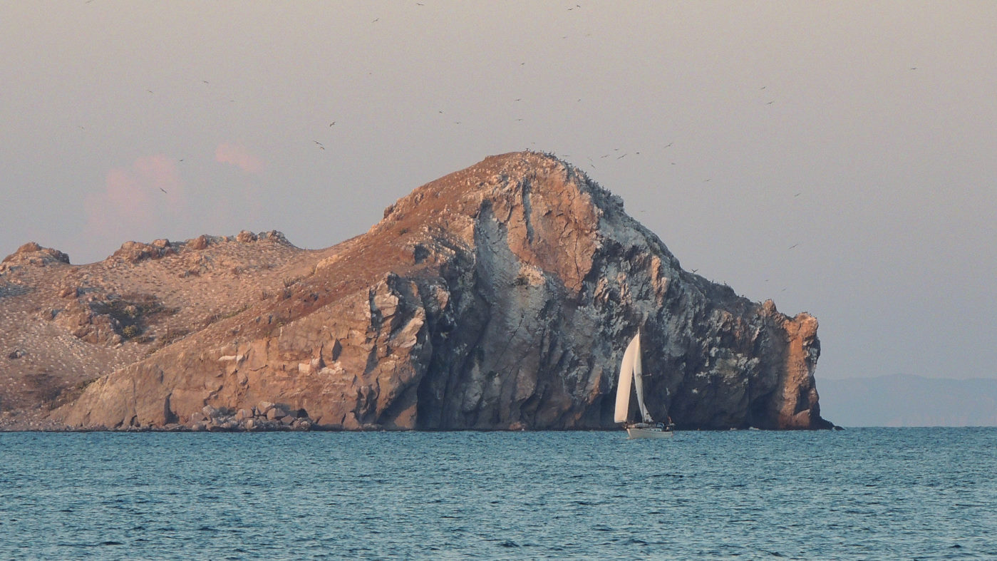As soon as we cleared the wreck site buoy, we killed the engine and tacked our way out of the bay, enjoying a very pleasant sail, past the rugged landscape of Isla Carmen, and the jagged profile of Isla Danzante. We motored the last few miles and with the promise of dinner at the resort, we waited for San Souci, who had battled to beat their way out of the Puerto Salinas anchorage, and then sailed onto their anchor in Candeleros as the light was fading, just in time for us to collect them and head to the resort for some well earned restaurant food and cocktails.