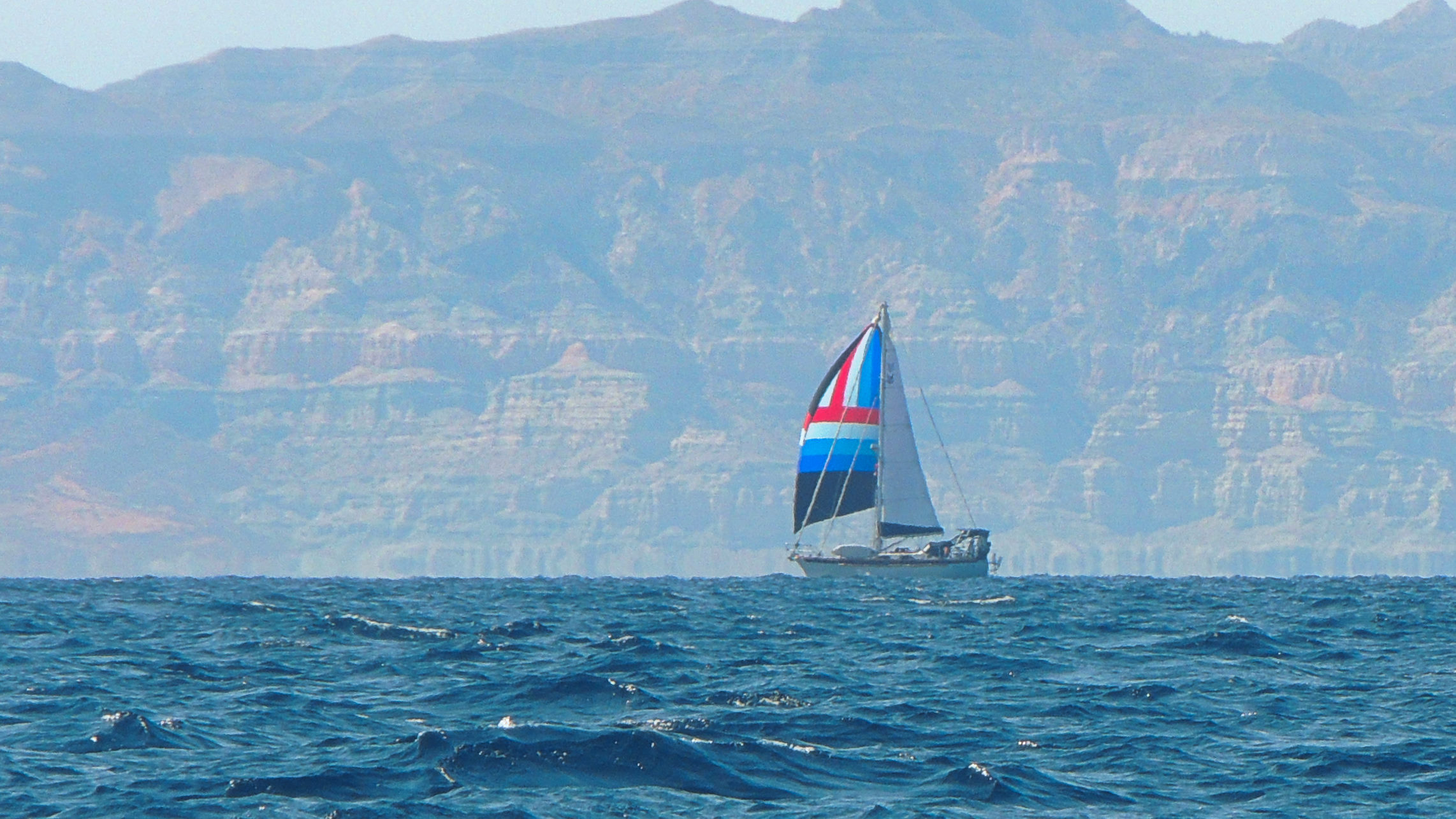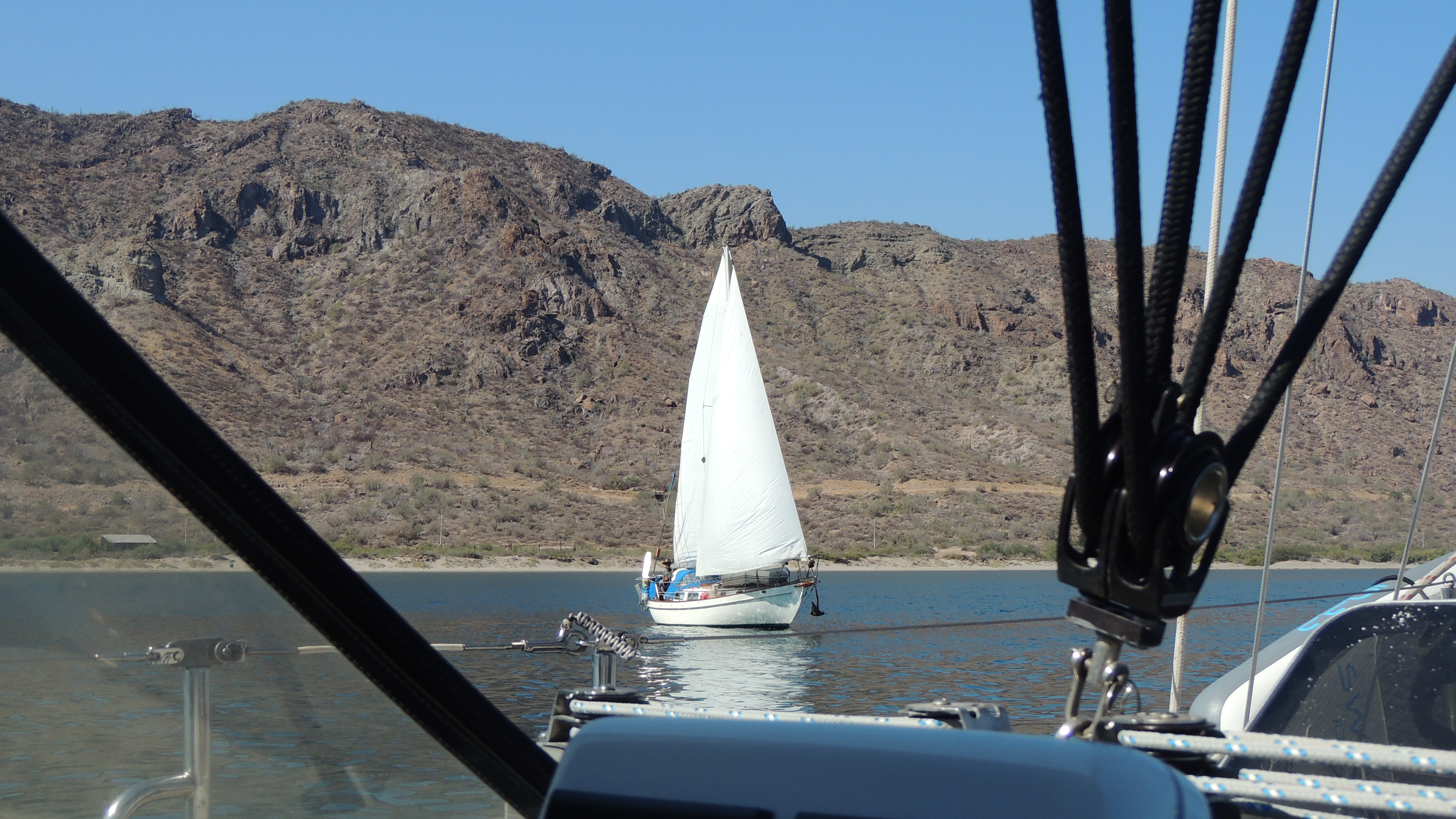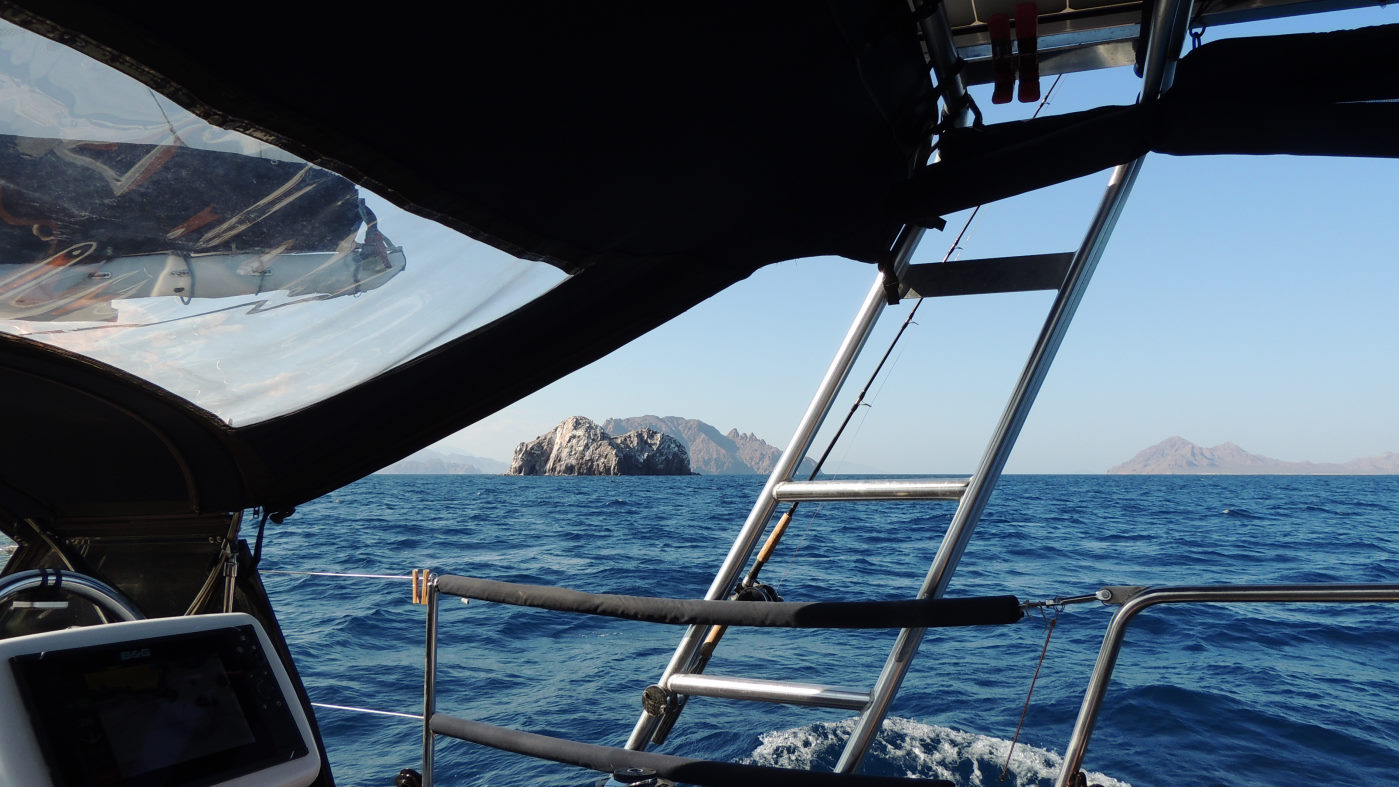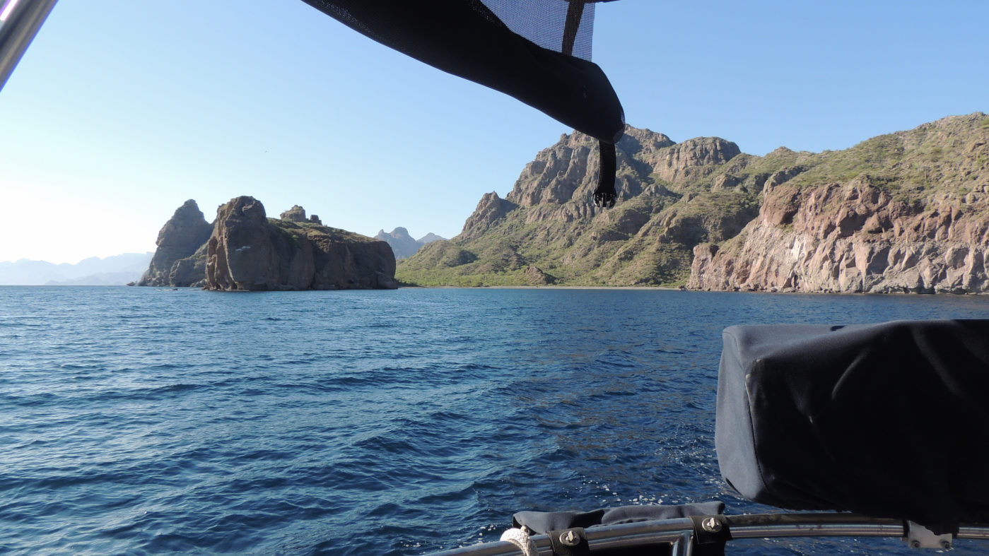 The Defender package on board, we motored out around the north reef off of San Marcos and then enjoyed a pleasant sail south. We had bought a few new fishing lures in Santa Rosalía, and had three lines out. The only excitement from those lines however was one bite from something very large, that flipped out of the water behind us, and then disappeared, taking our new lure with it. While we could your this as the loss of a massive catch, it was more likely the result of a poor knot attaching the lure to the line than the size of the fish. Live and learn!