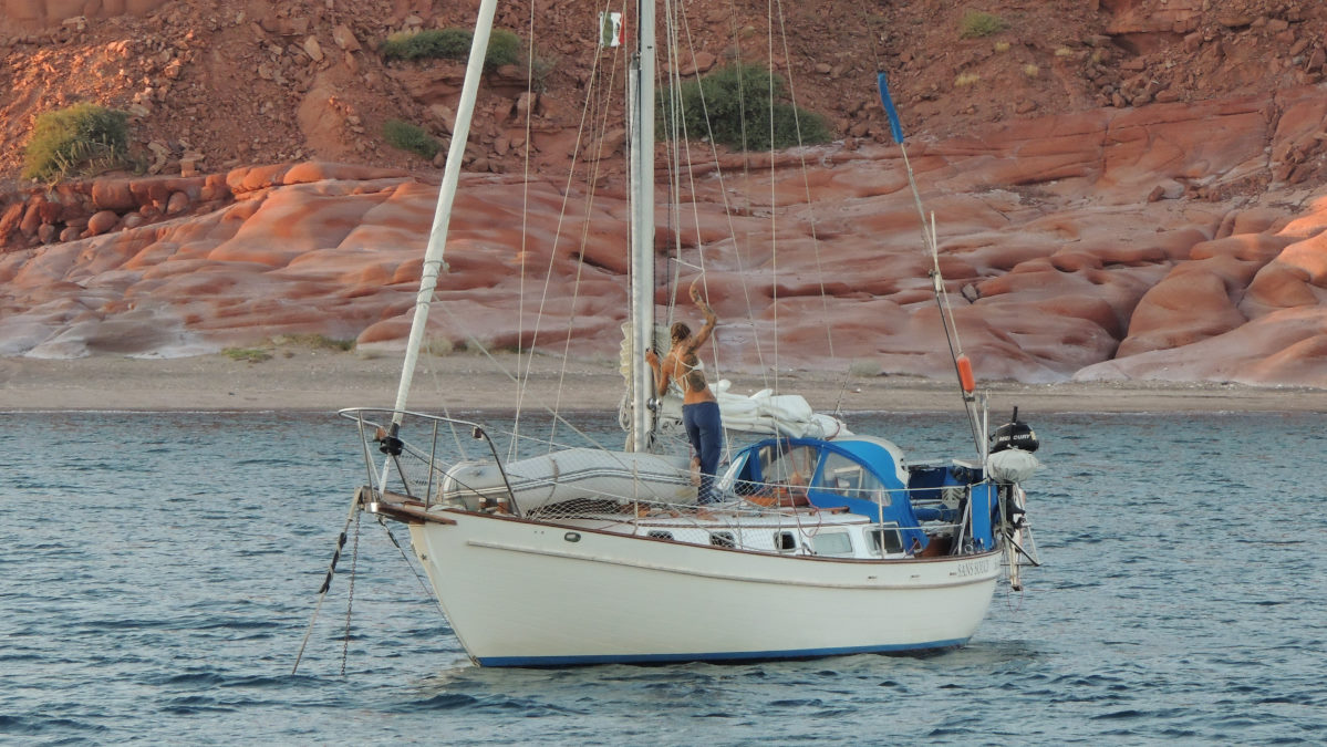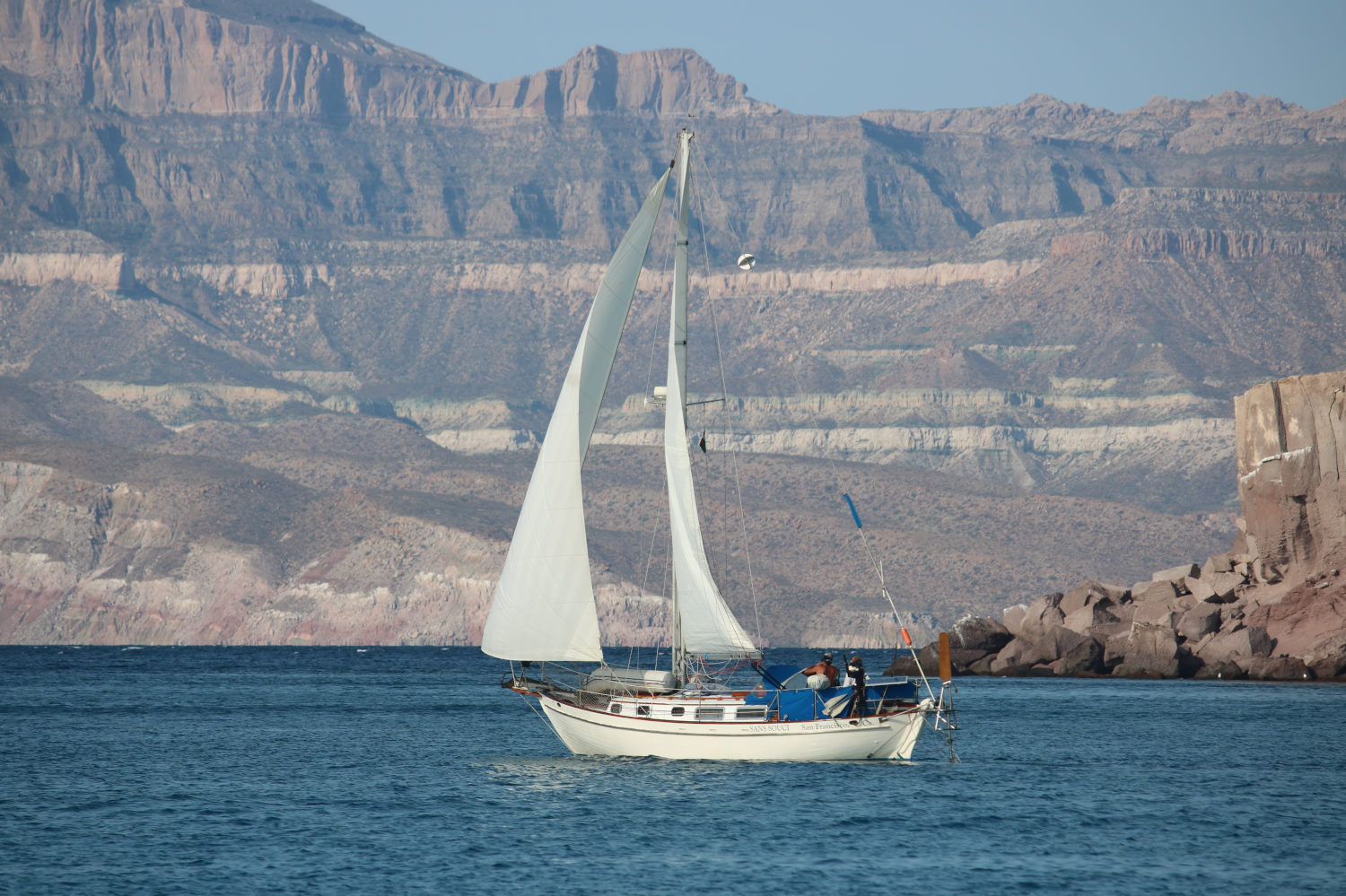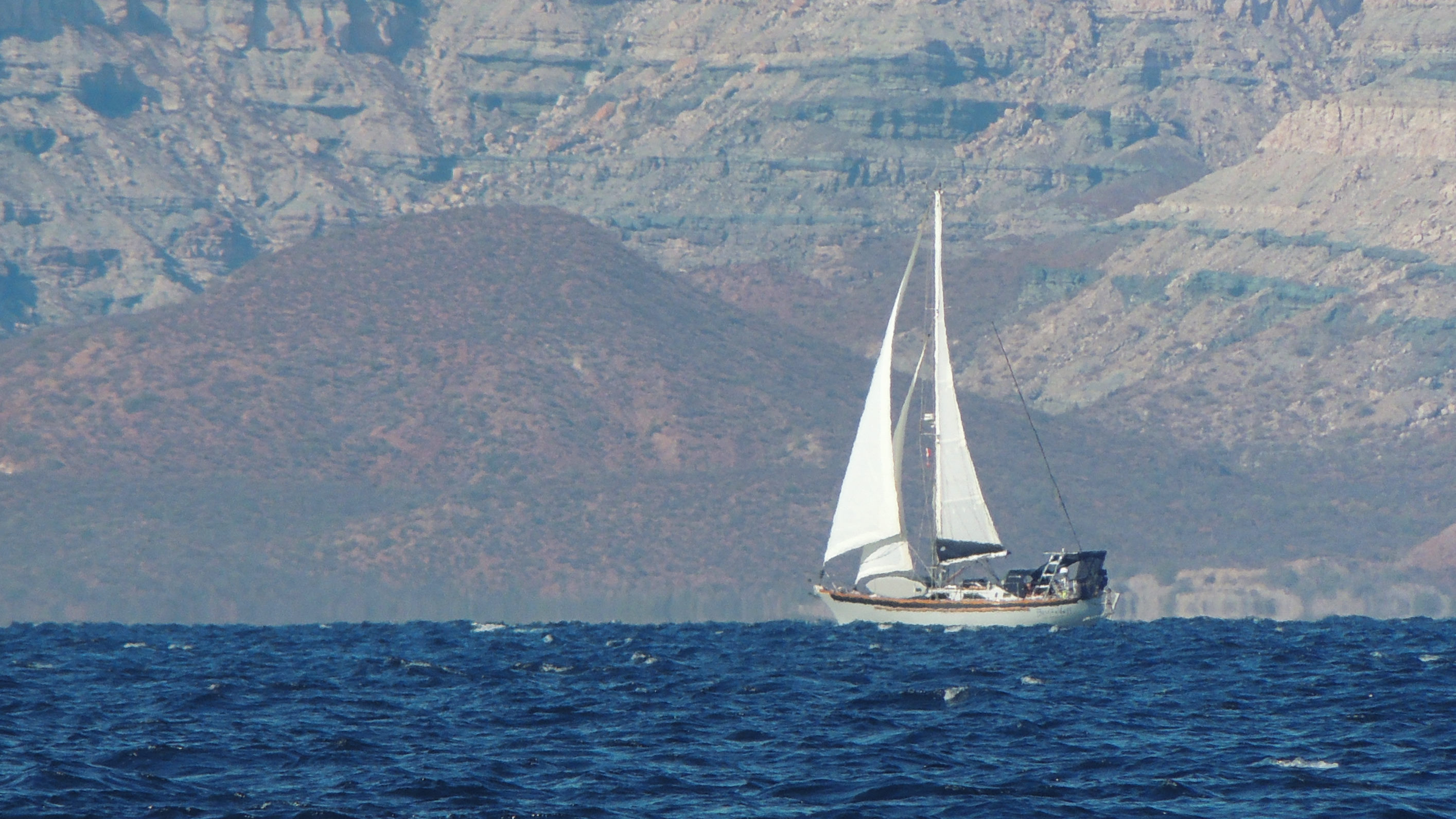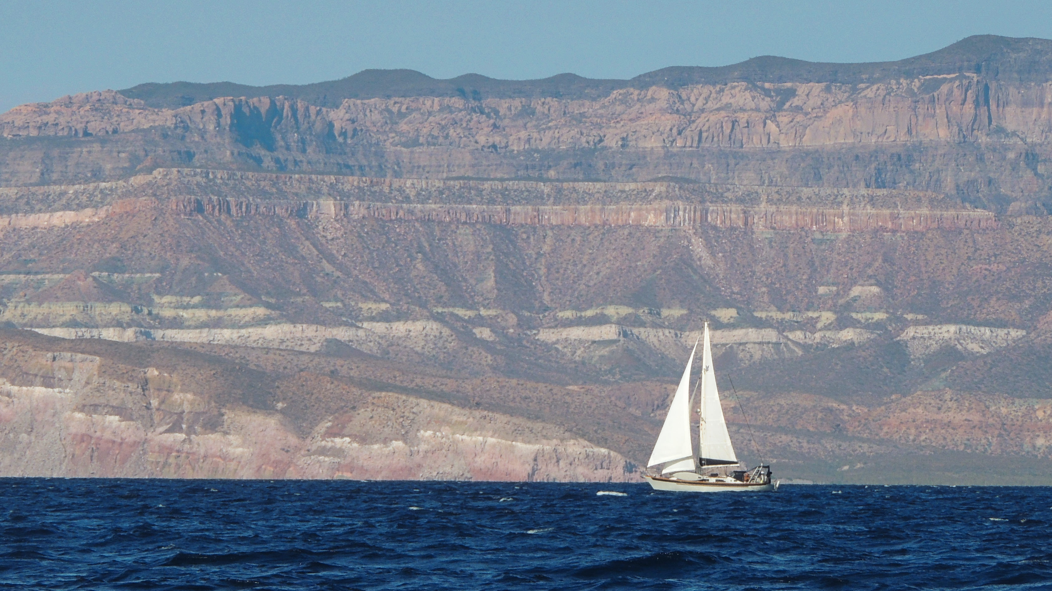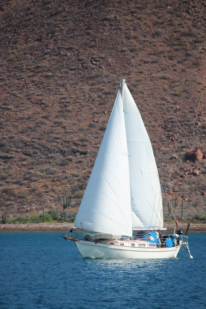 The Defender package on board, we motored out around the north reef off of San Marcos and then enjoyed a pleasant sail south. We had bought a few new fishing lures in Santa Rosalía, and had three lines out. The only excitement from those lines however was one bite from something very large, that flipped out of the water behind us, and then disappeared, taking our new lure with it. While we could your this as the loss of a massive catch, it was more likely the result of a poor knot attaching the lure to the line than the size of the fish. Live and learn!