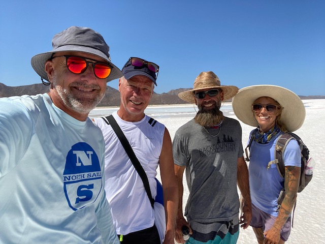 On shore, we walked throughout the village and over to the salt flats, accompanied by the reliable canine tour guide who had taken us on the same trip the last time we were here. He was rewarded with a whole can of tuna in oil (all I could find in the tienda), and although I worried about the oil, we had just witnessed him eating a fish head on the beach, so I think his stomach could take it. We also enjoyed a dinner at Lupe’s bar, chatting with a charter group at the next table.