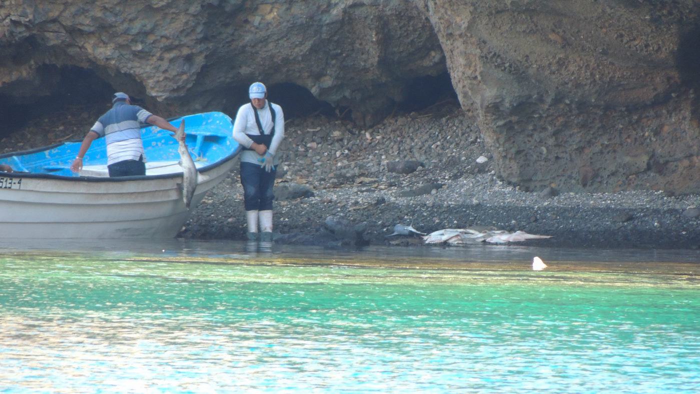 We enjoyed the super clear water, swimming though the ever present sardine bait ball under the cliffs close to the boat and the shoals of rooster fish feeding on them, as well as watching the local fisherman coming by to take live bait, which they used further out to catch the rooster fish. We watched two particular boats doing this, one of which was a teenage boy who expertly snagged quite a haul of rooster fish, and we later chatted briefly with him and his father as they were cleaning the fish on the beach.