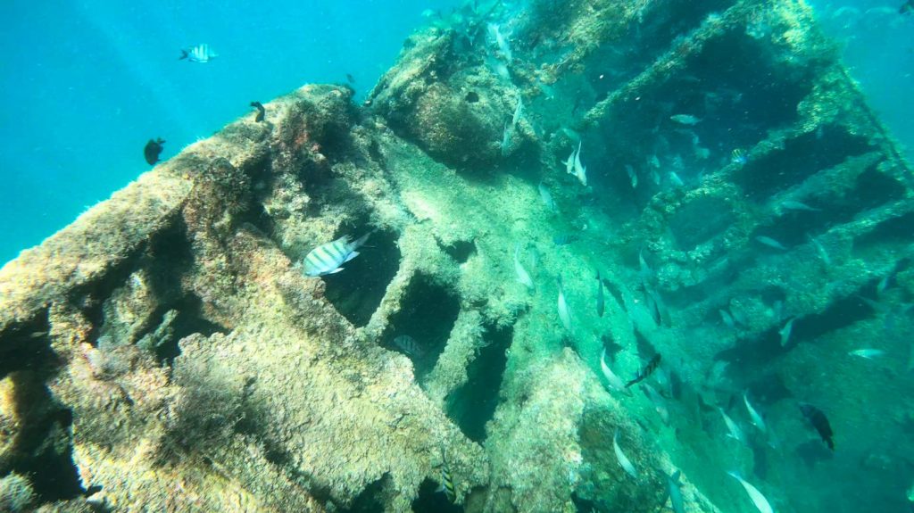 Our friends on CAVU had recommended we go around to the east side of Isla Carmen to explore the abandoned salt flats and sunken reef of Puerto Salinas. The sail there was excellent, passing dramatic rocks and rounding two points to our new destination. In the center of the bay is a large sunken tuna fishing boat, and despite less than perfect visibility, the snorkel over the top of this wreck was a great experience. It was a real treat to see the amazing amount of life that had made this old ship its home.