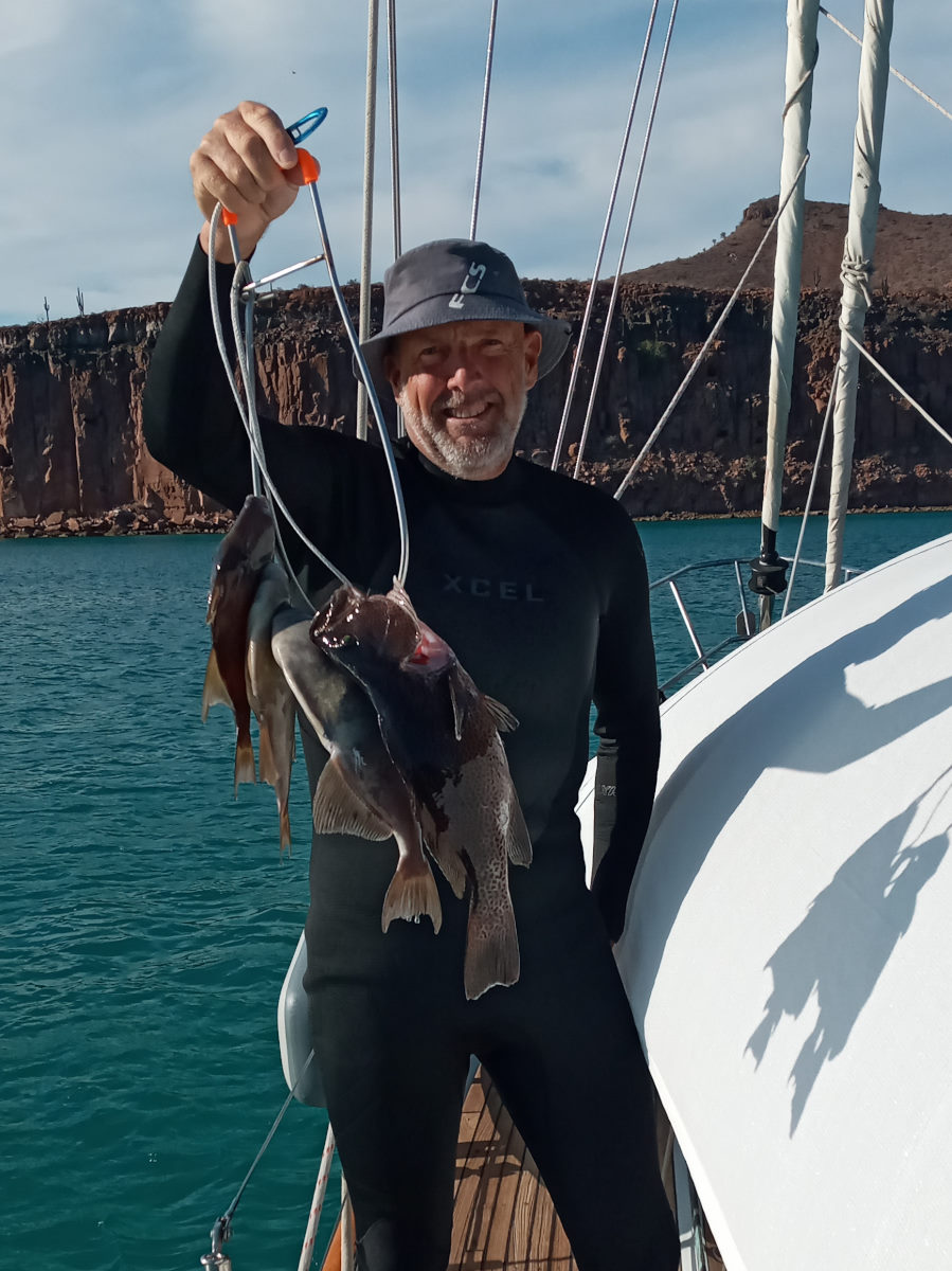 We went spear fishing off the reef at the north entrance to Caleta Partida which is actually detached from the land, and felt quite exposed, but totally worth it. I came up short, but Baron hauled in a large snapper and two good sized cabrilla. Having more than we could eat, Baron went over to a sailboat we had seen tacking all the way down the Caleta (as had Baron and Heather when they arrived), and gave them a Cabrilla as well as some heck for giving up their sailing and turning on their engine to anchor (“I haven’t turned on my engine in 10 days”). This was something Baron was to regret the next morning when he was forced to tack out of the caleta in very light wind to save face with the training crew, who fortunately for Baron, motored out of the anchorage shortly after, allowing San Souci to respectfully proceed under power.