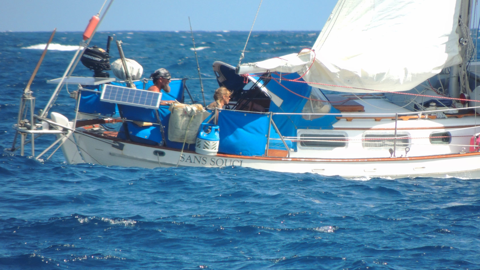 We had a delayed departure – I had gone over to say hello to a solo sailor on a Tayana Vancouver, but it appeared he had not had the opportunity to talk to anyone for a while, and was reluctant to let me go, despite San Souci weighing anchor sailing by (me: “Oh, I gotta go!”, him: “Don’t worry, you’ll catch them … as I was saying …”), and so we arrived at the same time as Sans Souci, and for once, a photo finish!