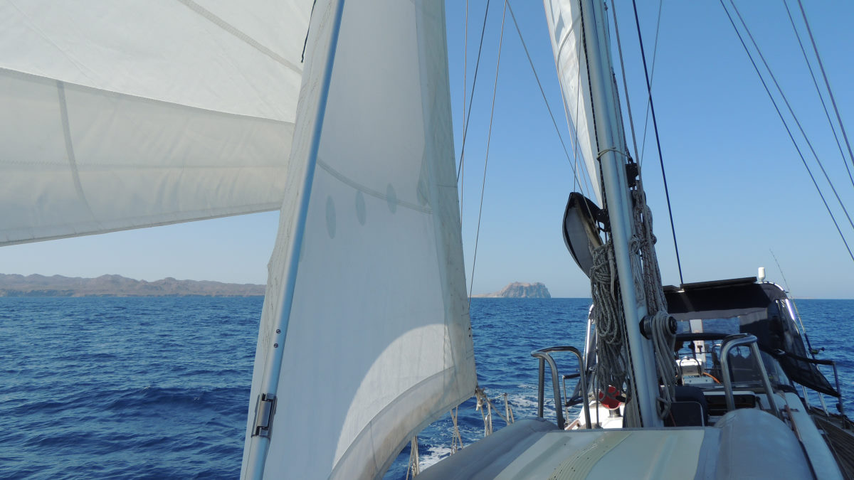 We left San Juanico in a nice breeze, sailing off the anchor and passed San Souci on the way out, just as they were putting in what turned out to be an overly optimistic reef. The wind got lighter and then all but died and it was a slow sail, then motor to Las Coronados.