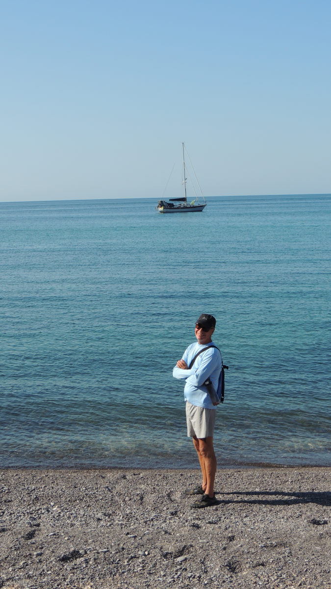 Relaxing with our hot feet in the water back at the beach we spotted Baron in his dinghy being towed back to San Souci, the result of a a fouled prop on his outboard. Not a good day for Baron!