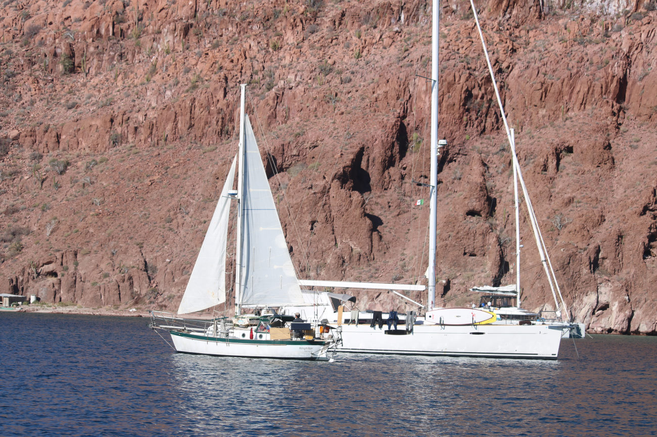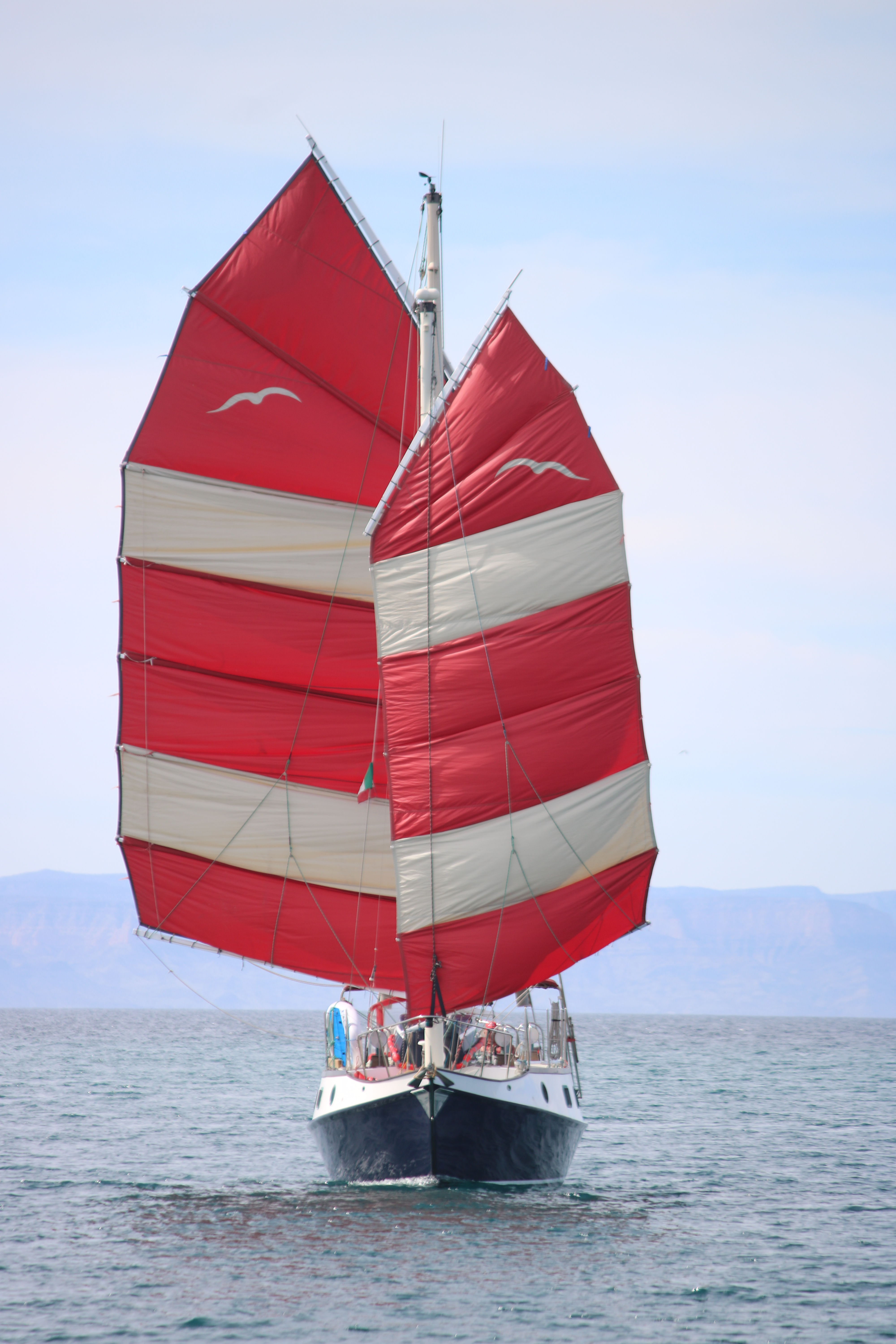 Said Goodbye to John Muir as they headed to enjoy Kristen’s birthday tucked into the tiny bay immediately north of Caleta Partida and we raised the anchor, heading off in pursuit of Taiko … an easy spot with their unmistakable red sails and junk rig as they sailed past the entrance to Caleta Partida.