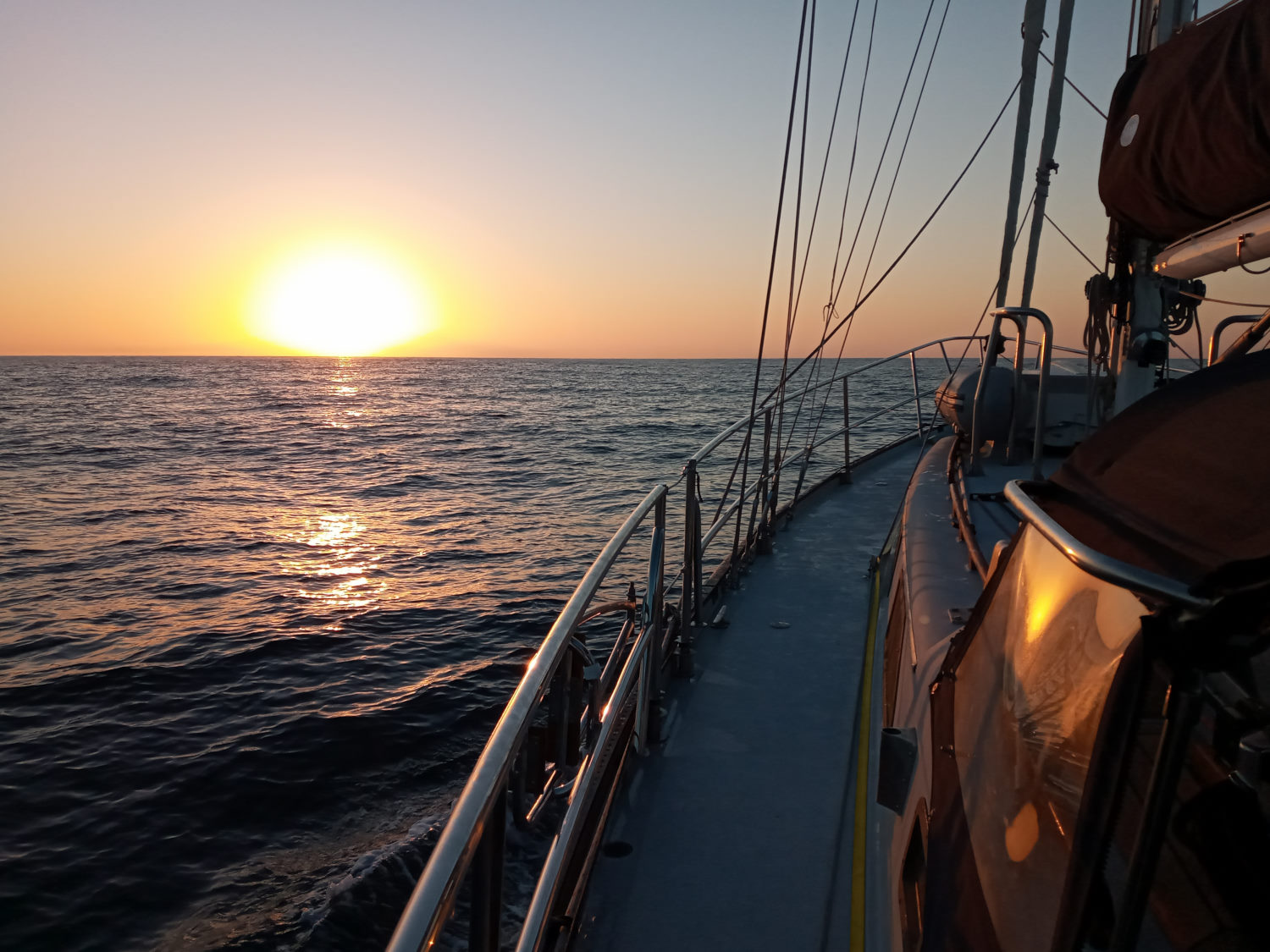 Early morning, in the darkness, with Julian on watch, and Juliet (with LeeAnn at the helm) following, we had an interesting encounter with a large fishing vessel that decided to pass between our two boats. This was unsettling to say the least!