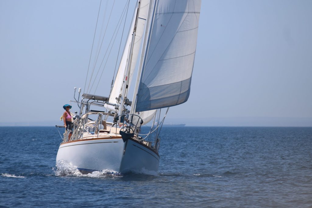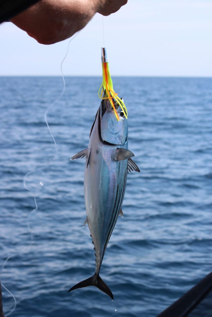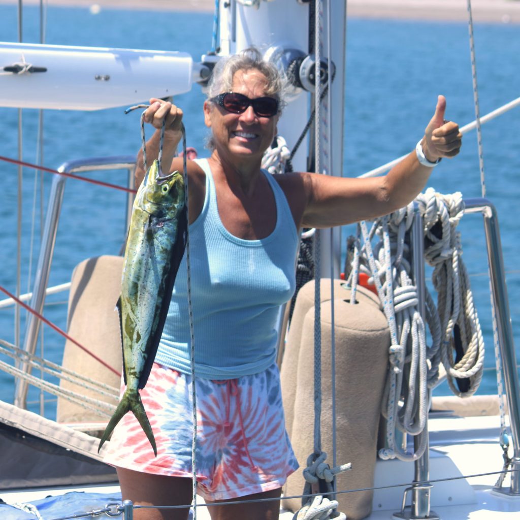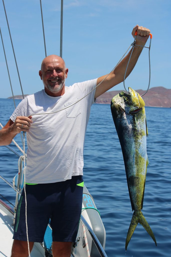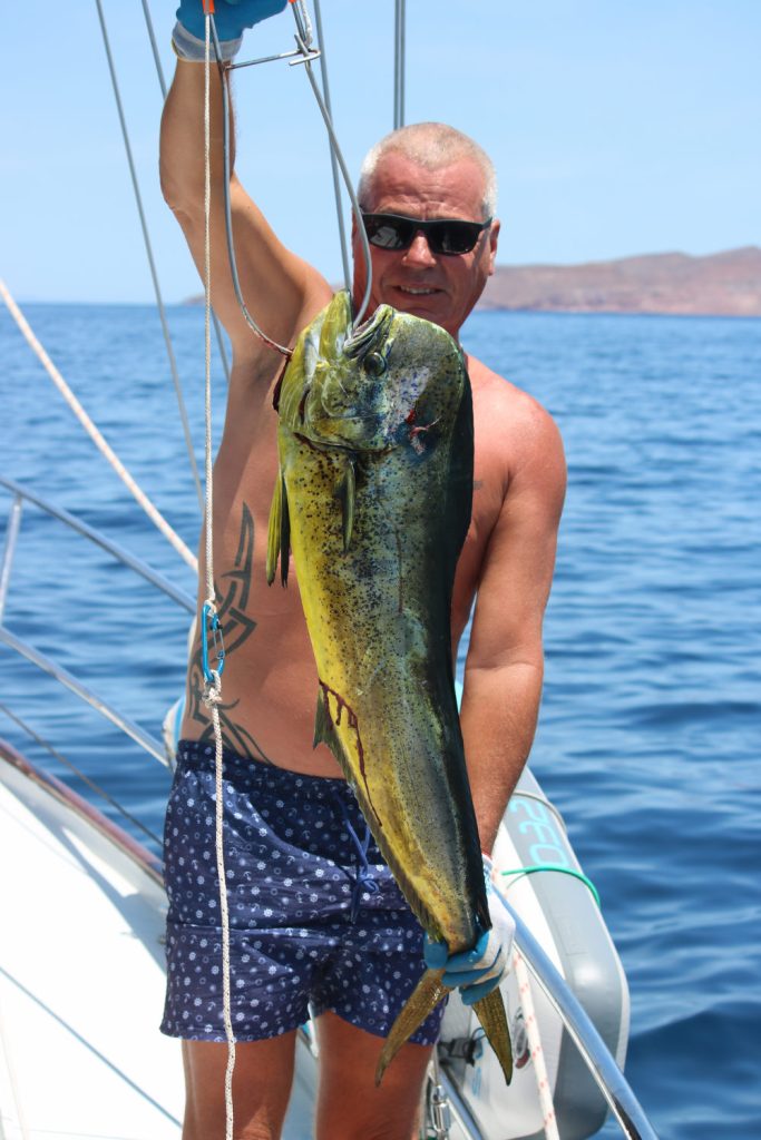 We had decided to try our our new fishing lures on the trip up to San Francisco, and caught two smaller bonitas in the first hour of the trip, throwing them back. And nothing more until …. a big yank and a jingle of the bell, on one of the handlines, and as we carefully pulled in the line, we saw a big dorado flip out the water a few times. Having lost a few dorado in the past, we resolved to be patient, and wait this one out. The recovery went as planned and after the fish was tired, we bought it alongside and Colin managed to gaff it. Success! This was a super big dorado, and it fed both Juliet and ourselves with plenty of meat for two nights (8 big servings).