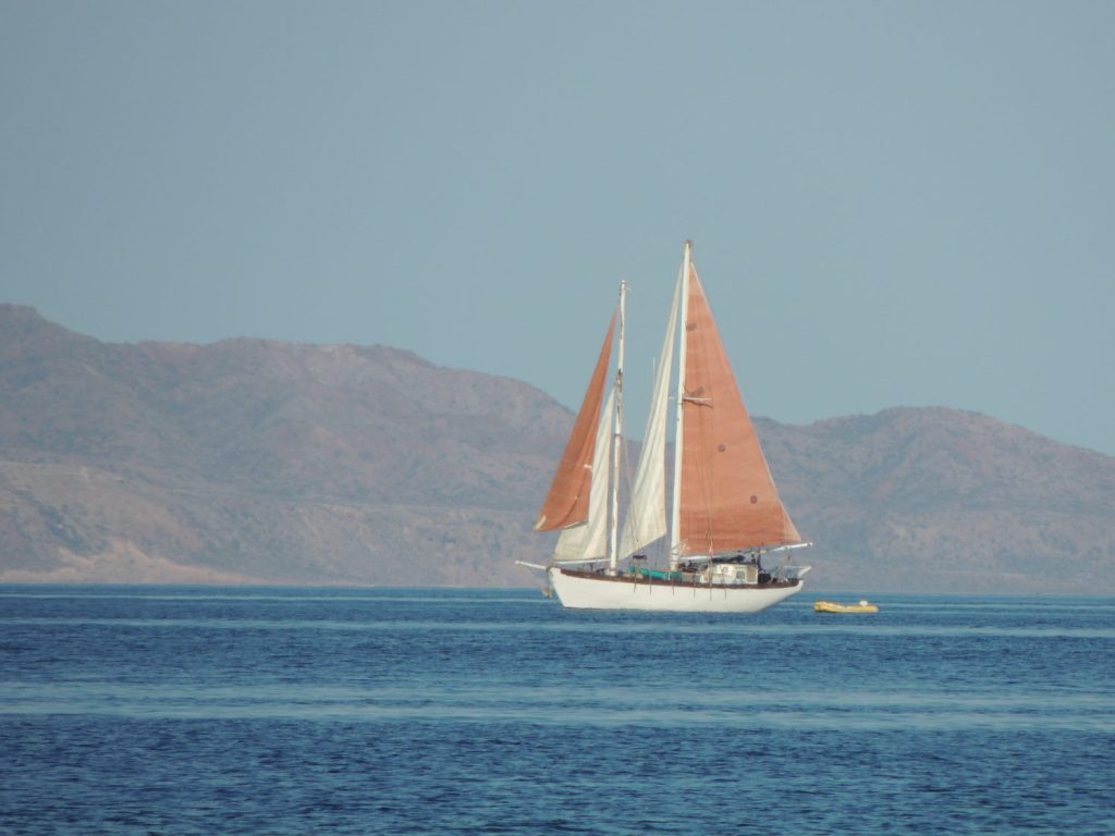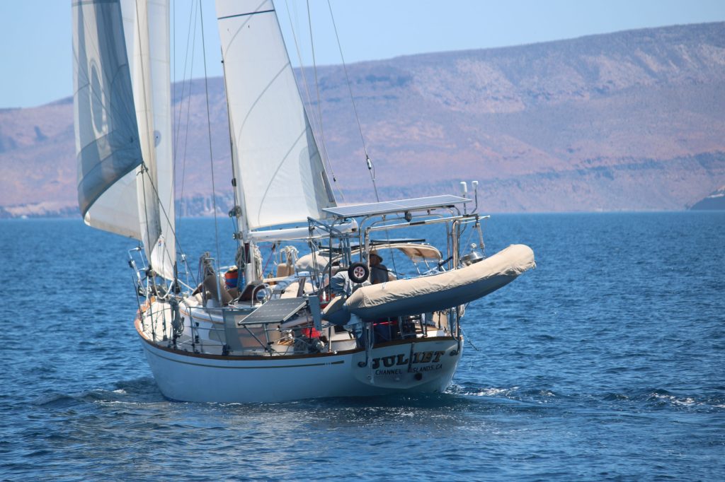 With good wind, we raised the mainsail before weighing anchor and sailed out of San Evaristo. Immediately around the point, we set a course north and put up the spinnaker, running for a long time wing-on-wing up the San Jose Channel. Juliet left after us, but caught up under power, and set about putting up their spinnaker, which they had not used for a few years. We watched, knowing that it was likely twisted in the bag and sure enough it took some sorting, but eventually it was flying nicely.