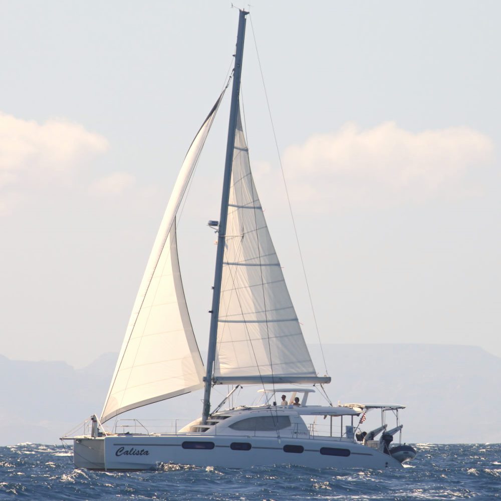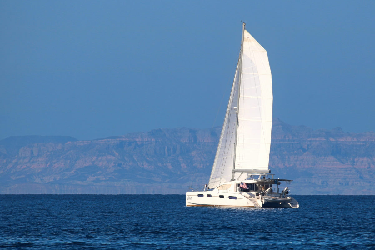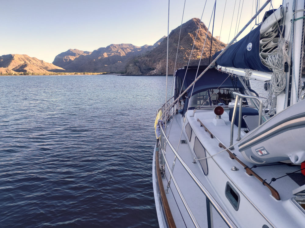 With the wind already blowing and expected to increase, we left fairly early, but seeing Calista leave just 30 minutes behind us, the pressure was on, and we were doing all we could to get Boundless moving as fast as possible. The sailing was great and sure enough, the wind did pipe up to over 20knots as we passed Isla San Francisco, and the boat was loving the sporty conditions. Approaching Isla Partida, and the entrance to El Cardonel which is a deep cut that we thought may give us a bit of respite from the breeze, we could see Calista just about to catch us. Regardless, we were pretty pleased with the day’s performance given the difference in the two boats.