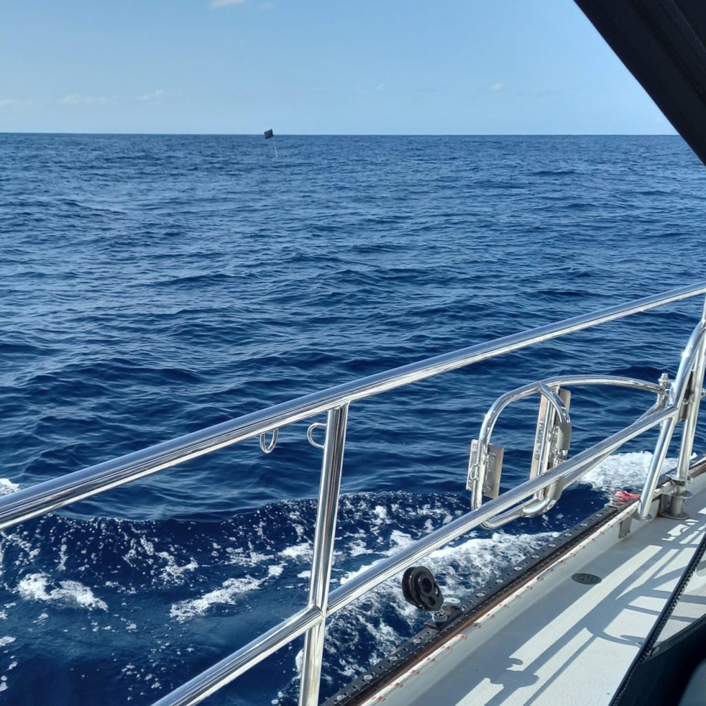 Just a short while later we realized we were trailing some line from our rudder, but despite getting ready to dive down and remove it, it sank away on its own once we came to a stop. Minutes later we came across another seemingly endless line, and passing one of the soda bottle floats, noticed that below the float was a bated hook. Not knowing how long the line was, and given JULIET had made it over the line safely, we motored towards a gap between floats, dropped into neutral, and made it across without getting tangled.