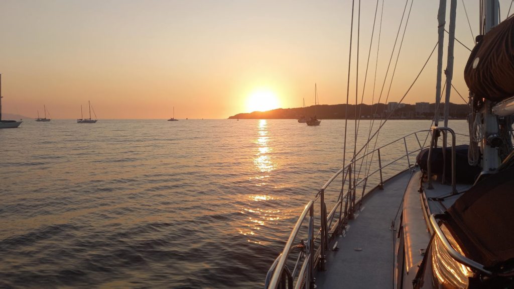 The current was against us at the start of the day, but turned favorable later on and the trip turned out to be a quick one, averaging 6.2knots for the day, which is pretty quick for us for a day under power. Anchored in Frailes with JULIET and one other boat that arrived from the south, we remembered that the fishing fleet in Frailes launch their boats by pushing them off the beach with trucks. We assume there’s not much growth on the bottom of those boats, and even less gelcoat, nevertheless, it was a pleasure to see the fleet head out at sunset.