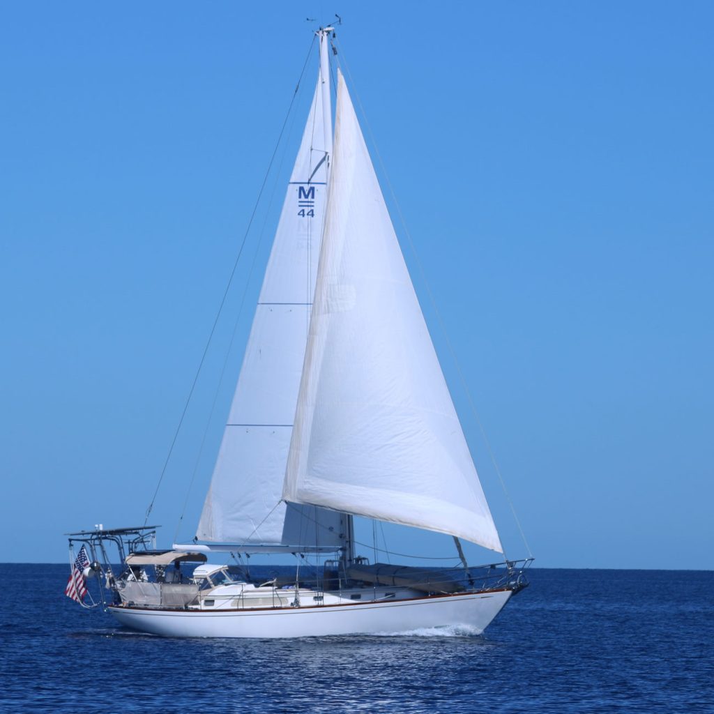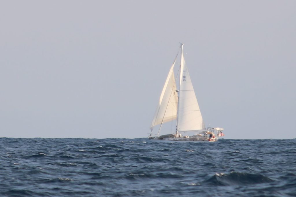 We sailed the first night with just the main, as the wind had built slightly and was now off the aft quarter, and by the morning with less wind and the main was flogging occasionally in the swell, we converted to a poled out jib. This lost us a knot or less, but as JULIET had dropped a few miles behind during the night, this sail set up was both very comfortable, and allowed them to catch up. Now going pretty much dead downwind, at one point, we pulled out the staysail in an effort to sail wing-on-wing, but it really needed a pole to work effectively, but, when poled out with the boathook did seem to give us a nice boost, and it would appear that getting a smaller pole for the staysail might be a useful tool for a double foresail downwind setup.