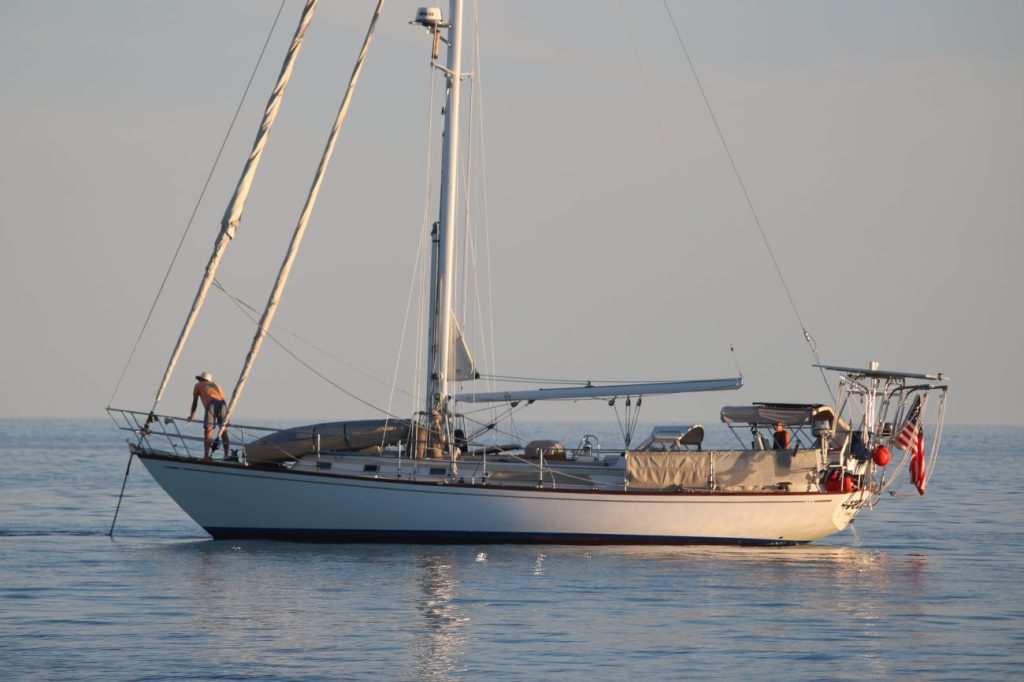 The second evening the wind was forecast to die around 8pm, but we managed to continue sailing until 11:00pm, when the motor came on. During the night we experienced one of our intermittent ‘high voltage;’ alarms, proving that the replacement of the starter battery was indeed a wasted effort, and Colin fixed this by creating a constant load on the system with lights turned on below. Something to be solved in due course.