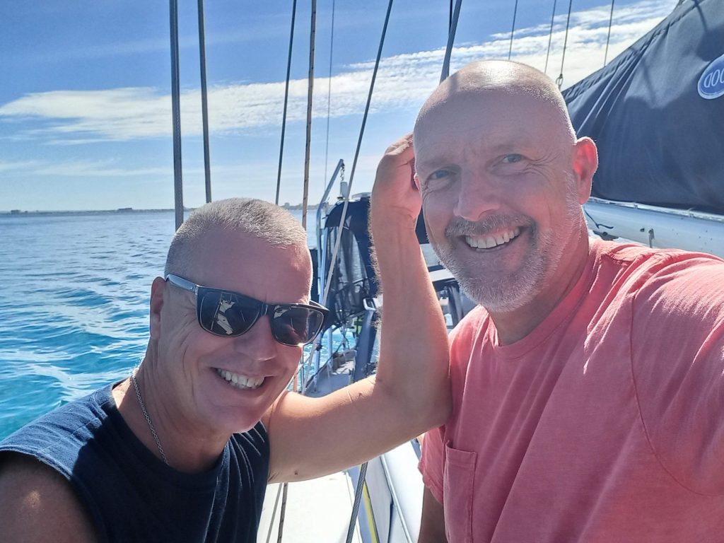 We stowed the bicycles away in the morning, and did the last jobs on the list; arranging the lazarettes, filling with water in the starboard tank, and handing the keys back to the marina office. We went up the dock to say goodbye to John and Kay on PAPAHOBO, sorry they were not coming with us, and they came to cast us off.