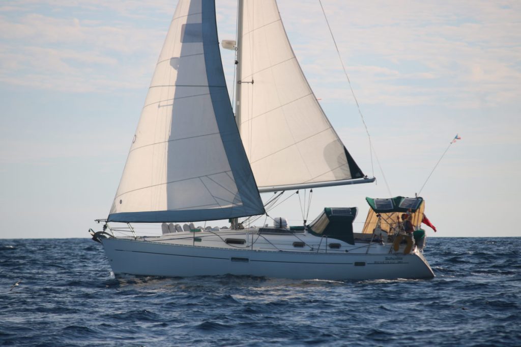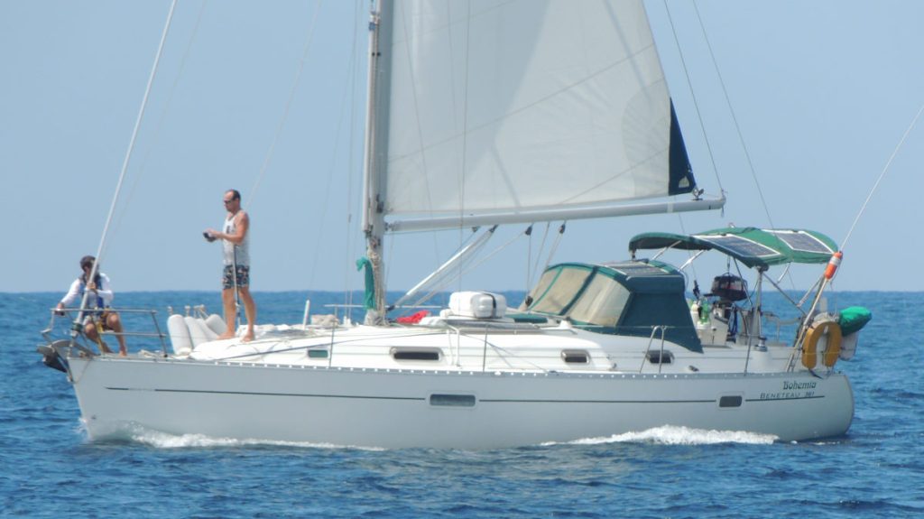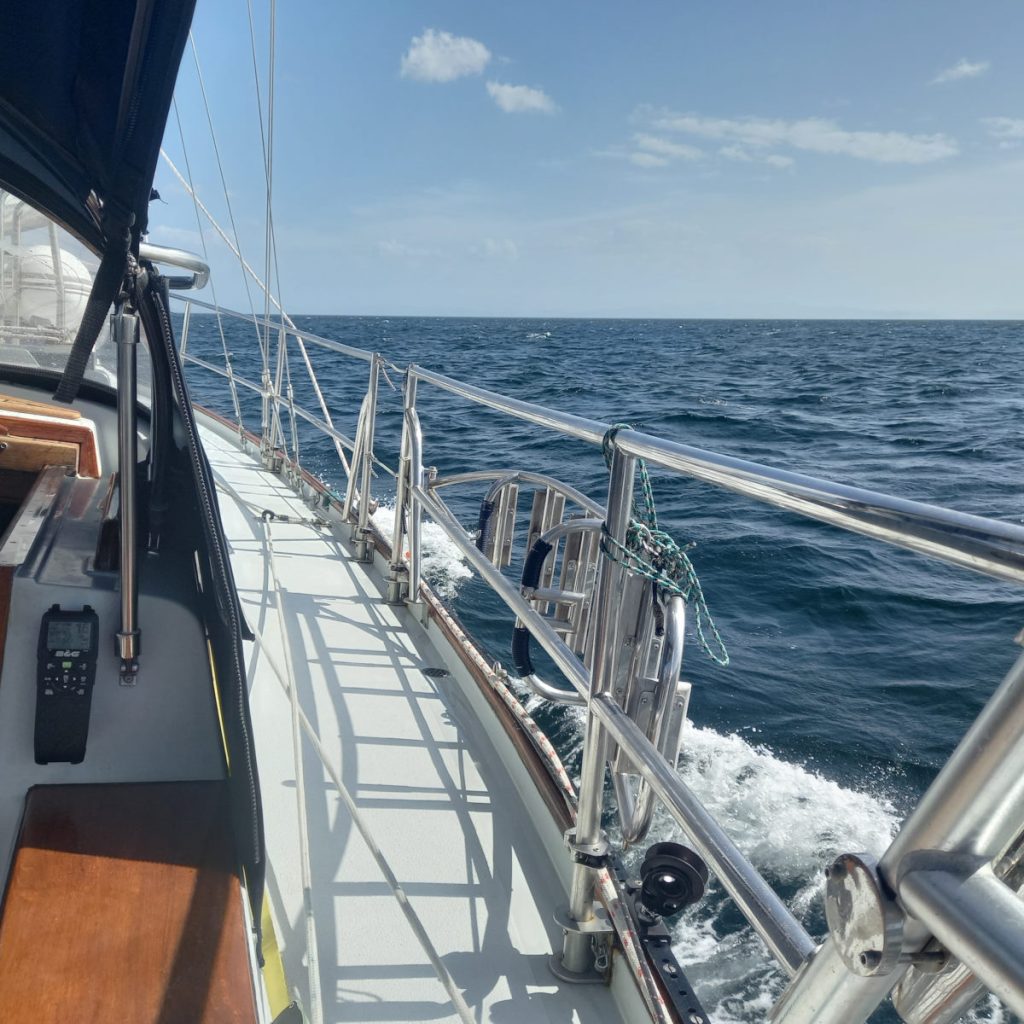 About 9:30 am, after passing the point and feeling like we were making good progress with very pleasant wind and great conditions, Bohemia’s foresail head failed, and they were forced to pull it to the deck. While they sorted out the mess, we hove-to to wait for them. They had changed out the headsail from their usual genoa to the rarely used smaller jib in anticipation of the Papagayo winds and once it was on deck, they could see that the webbing loop that attaches the sail to the furler head had failed, and there was also a 9-inch rip down the luff tape. This left the halyard attached to the furler head at the top of the mast and resulted in a good hour for Tom trying to retrieve it. Finally, based on a photo of the setup at their masthead taken with our zoom camera, and a suggestion of using their fishing gaff, they managed to snag the halyard and retrieve the furler head. With the larger genoa back on the furler, they were back on their way.