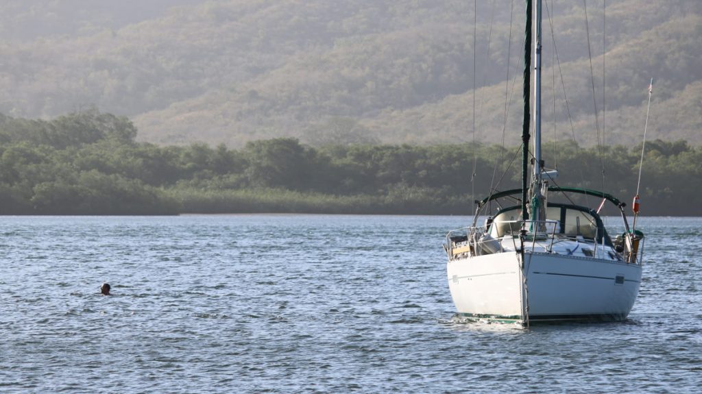 We raised the anchor and motored, dinghy still hanging on the side of the boat, around to Playa Grande, the boat healing in the wind as we went beam-on. Anchoring at Playa Grande was again anchoring in soft mud, but now refining our technique, it took only two tries (and a bunch of scope) to make us happy. The following morning however, a fishing boat threw a net out close to us, and by the look of all the pulling on the net by the two guys, then a second boat, it was clear they had snagged our anchor, and we suspect at that point, we were really just sitting on the chain.