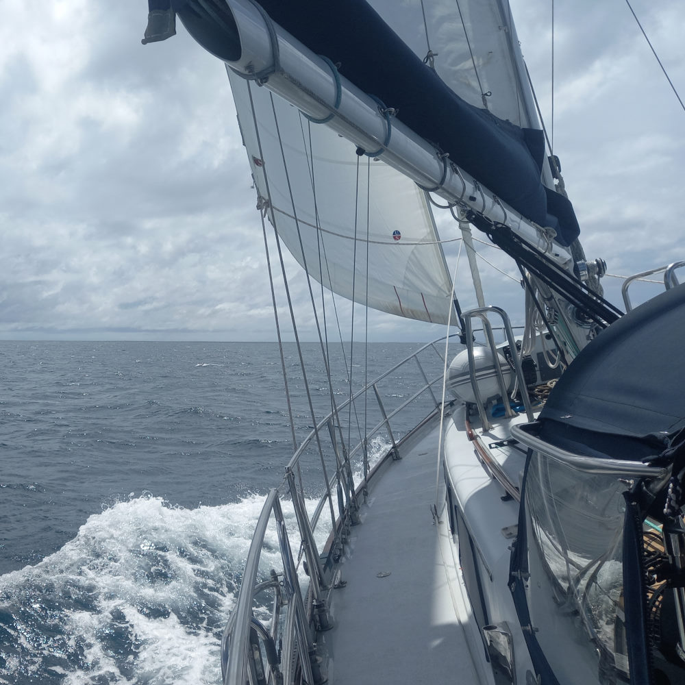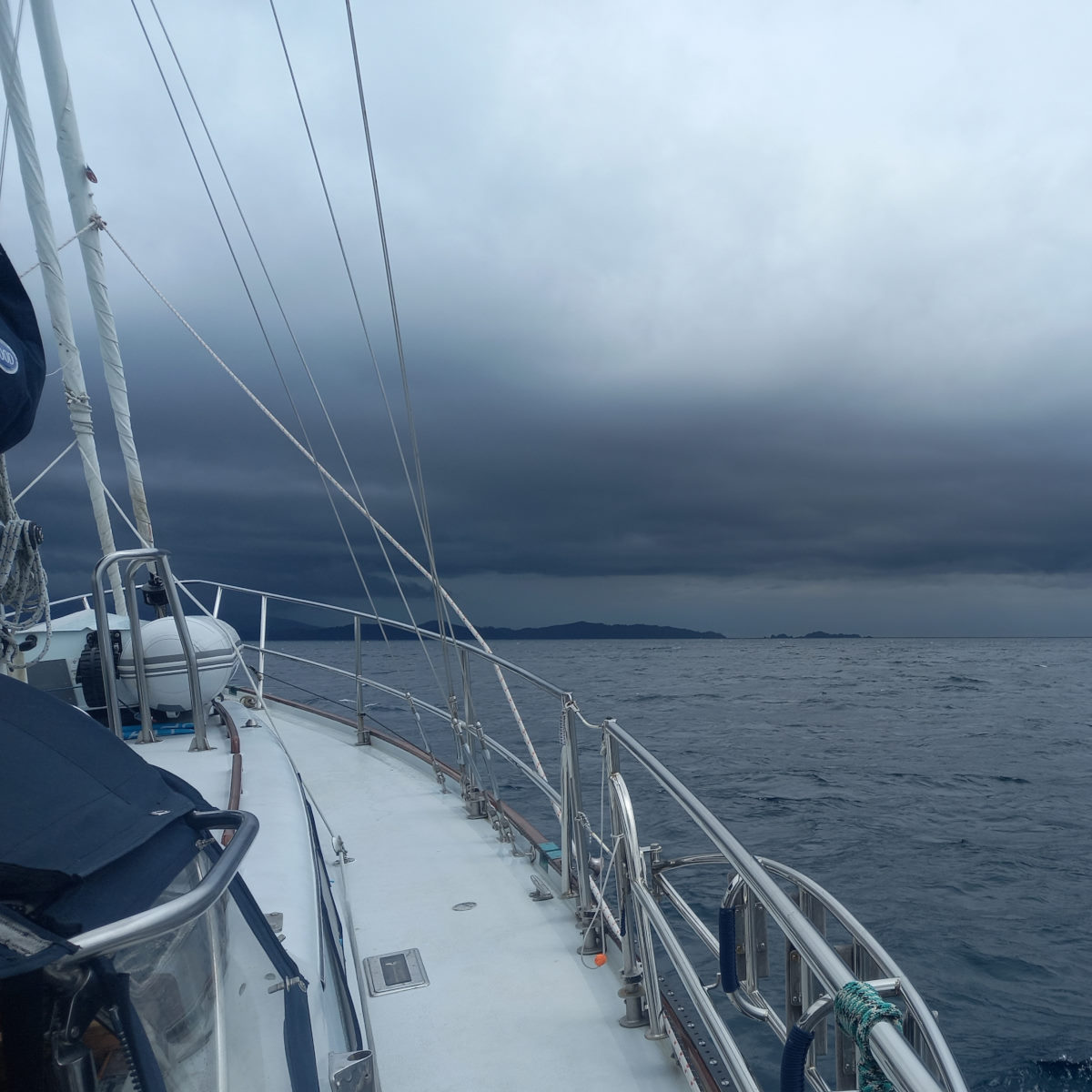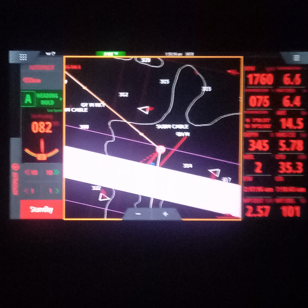 We left around 2pm looking to round the point in the dark and planning our arrival for the following day, with lots of margin in the anticipated trip time for current and wind conditions. The conditions were excellent as we left, and the sails were up within five minutes of departure. It was a pleasant reach off to Punta Mala, and upon rounding, we flew the spinnaker as the wind backed behind us. The wind strengthened throughout the evening and the sailing was very good as we made our way over towards our anticipated point of intersection with the shipping channel. There was almost no moon, and the visibility was nil, other than the occasional flash of lightning that gave us a momentary glimpse of the world around. It was apparent there was some dark clouds and stormy conditions ahead, and on radar a dark cell was visible in our path. A quick call with BOHEMIA and we decided to make a sharp right to avoid the storm, and make an earlier than expected dash across the shipping channel. We turned on the engine to give us maximum and consistent speed as we crossed the three miles wide two-lane shipping highway. We crossed the outbound lane with about 4 miles between us and the next ship and on approaching the inbound lane, Tom called a ship we intended to pass in front of which gave us a sense of comfort that, despite the projected mile between us at our closest point, he was at least aware we were there.