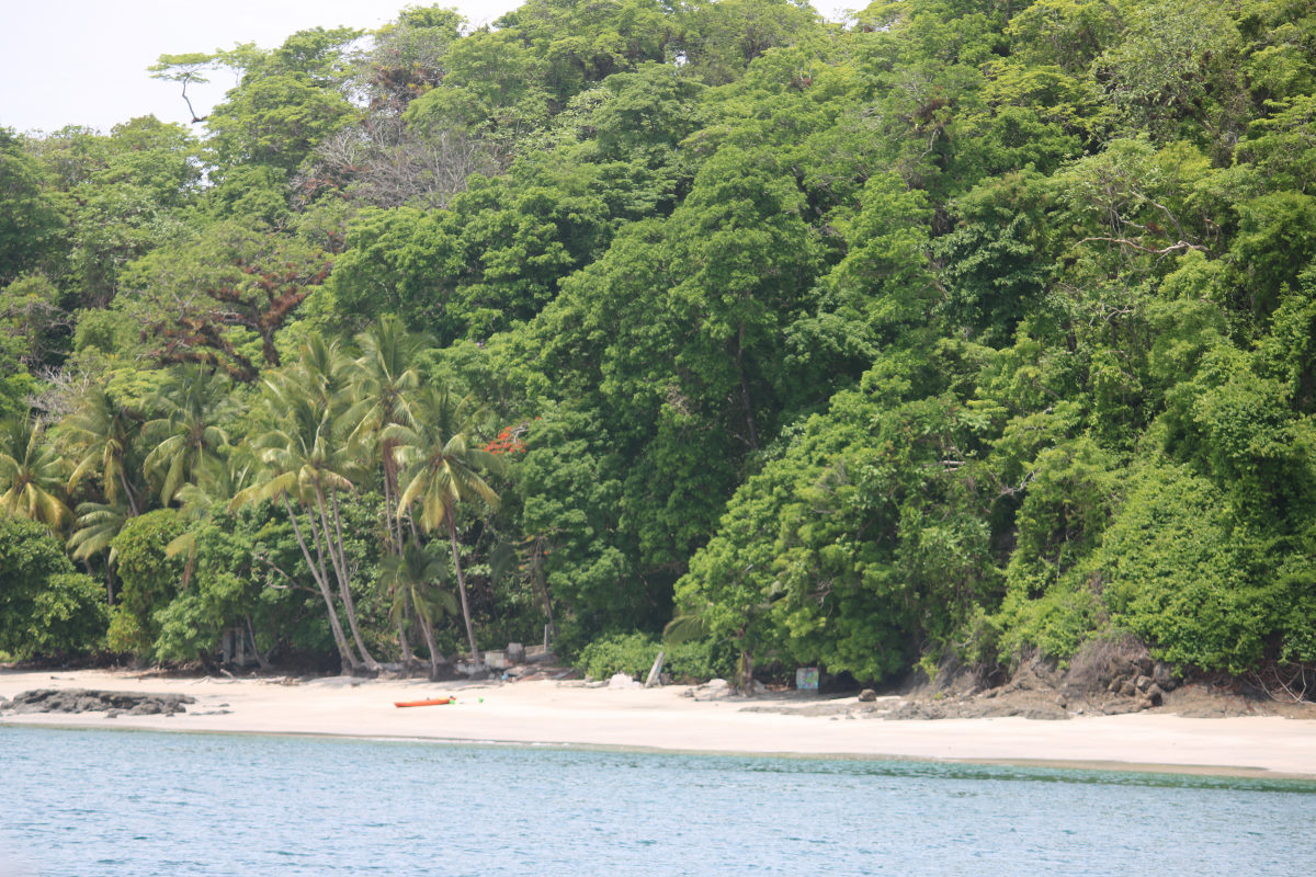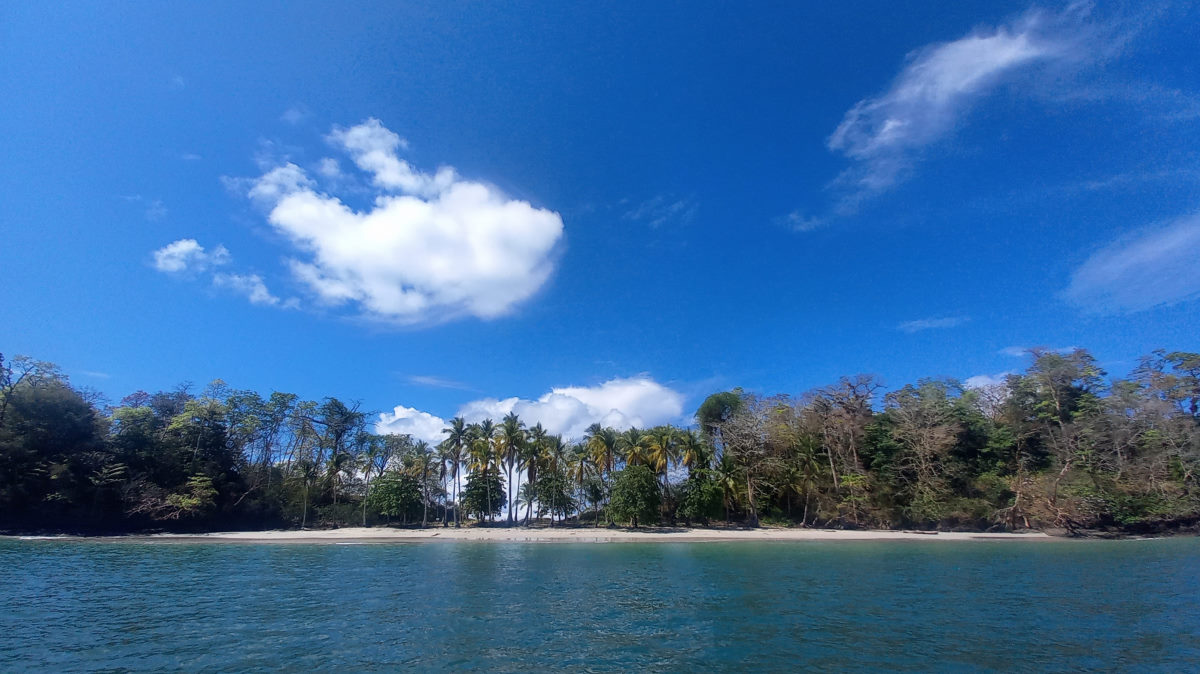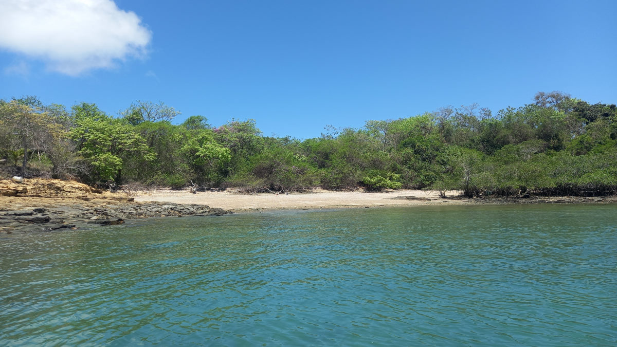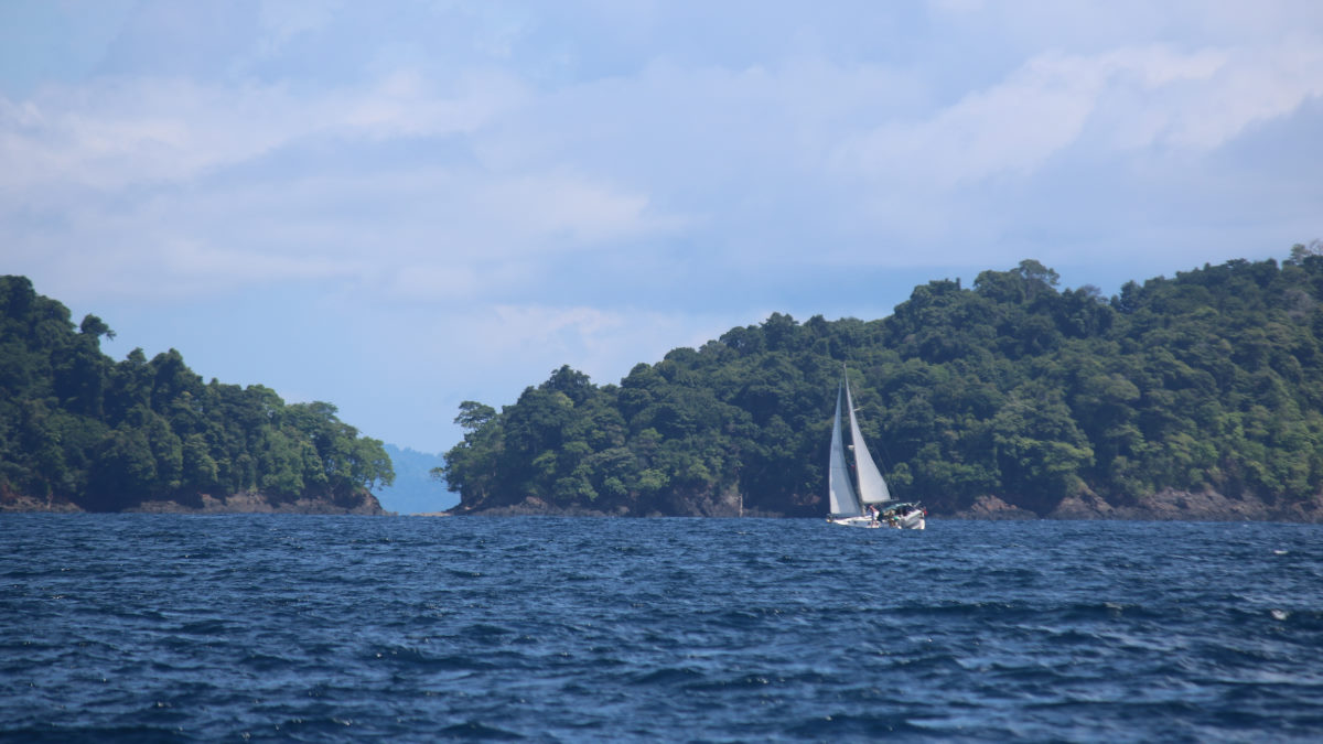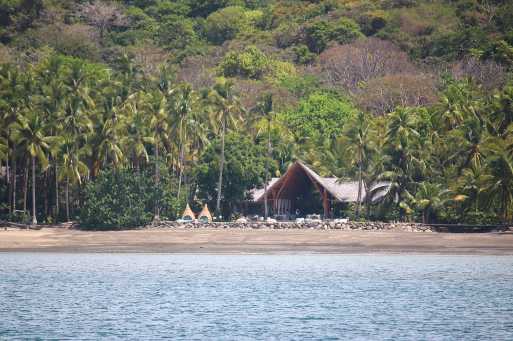 We retraced our track between the islands and rocks to make our way out to open water, and by the time we got there the wind was filling in nicely. We raised the sails, turned off the engine and had a lively sail in 14 to 20 knots of wind, the boat averaging close to 7 knots the whole way over. Despite the choppy swell that left a few splashes falling in the cockpit, it was an unusual feeling to have the boat galloping along under sail. This is probably the best sailing we have experienced since way back in Mexico. We made the short 22 miles in great time and negotiated the entrance to the anchorage area on the north side of Isla Cavada. We had read in the Sarana guide that the reported depths were inaccurate and sure enough, the passage in between Cavada and little Isla Tortuga were not 40-50 feet as reported but as little as 19. We dropped the anchor in 35ft in very calm conditions, well protected from the swell and wind waves we had experienced on the other side. From the anchorage we can see the exclusive eco-glamping resort on shore – reportedly we would be turned away if we try to land on the beach in front. We could also see a swimming platform, folks on hover-boards and other comings-and goings associated with the resort.