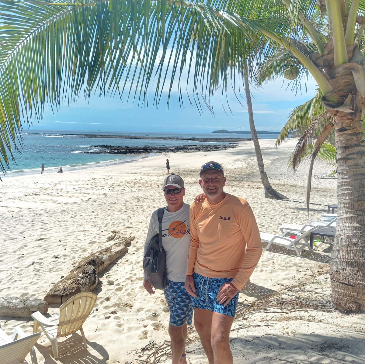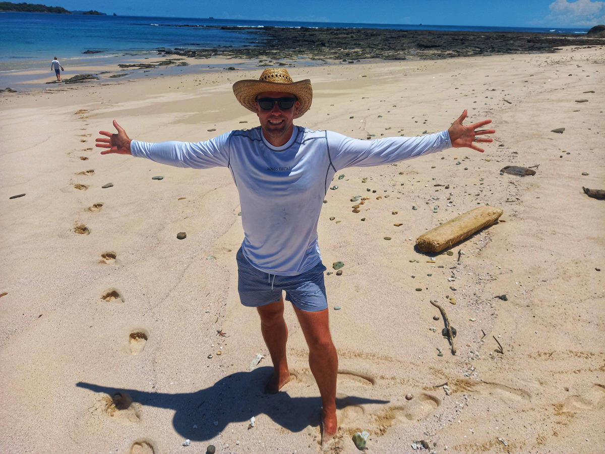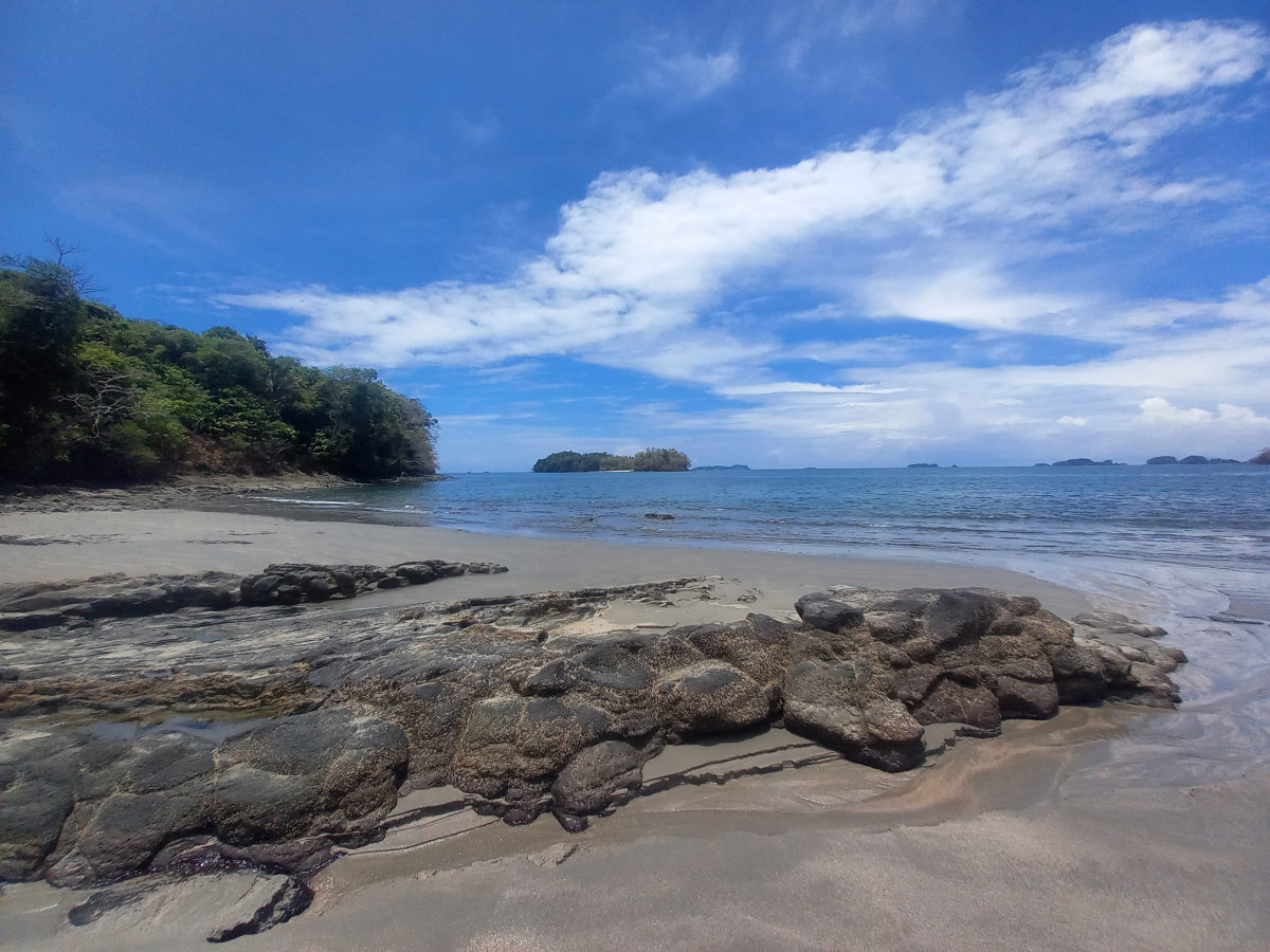 We retraced our track between the islands and rocks to make our way out to open water, and by the time we got there the wind was filling in nicely. We raised the sails, turned off the engine and had a lively sail in 14 to 20 knots of wind, the boat averaging close to 7 knots the whole way over. Despite the choppy swell that left a few splashes falling in the cockpit, it was an unusual feeling to have the boat galloping along under sail. This is probably the best sailing we have experienced since way back in Mexico. We made the short 22 miles in great time and negotiated the entrance to the anchorage area on the north side of Isla Cavada. We had read in the Sarana guide that the reported depths were inaccurate and sure enough, the passage in between Cavada and little Isla Tortuga were not 40-50 feet as reported but as little as 19. We dropped the anchor in 35ft in very calm conditions, well protected from the swell and wind waves we had experienced on the other side. From the anchorage we can see the exclusive eco-glamping resort on shore – reportedly we would be turned away if we try to land on the beach in front. We could also see a swimming platform, folks on hover-boards and other comings-and goings associated with the resort.