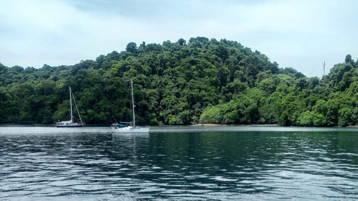 With the traffic lanes crossed, it should have just been plain sailing to the Las Perlas, however, we then faced a strange encounter with a fishing vessel that appeared determined to run us down. The fishing boat clear behind us, the rain started, fairly light at first, but increasingly heavy and by first light, it was torrential with no signs of letting up. With some fairly squally conditions and choppy seas, limited visibility and rain working its way around the cockpit screens, the going was fairly miserable. Things did not improve much after it got light, and we approach Isla Pedro Gonzales in effective white-out conditions, rounding the island to anchor in a wide bay with almost no sense of the surrounding environment. After hanging everything to ‘dry’ in the cockpit, we headed below for a sleep, and an afternoon relaxing watching TV (very unusual behavior for us).