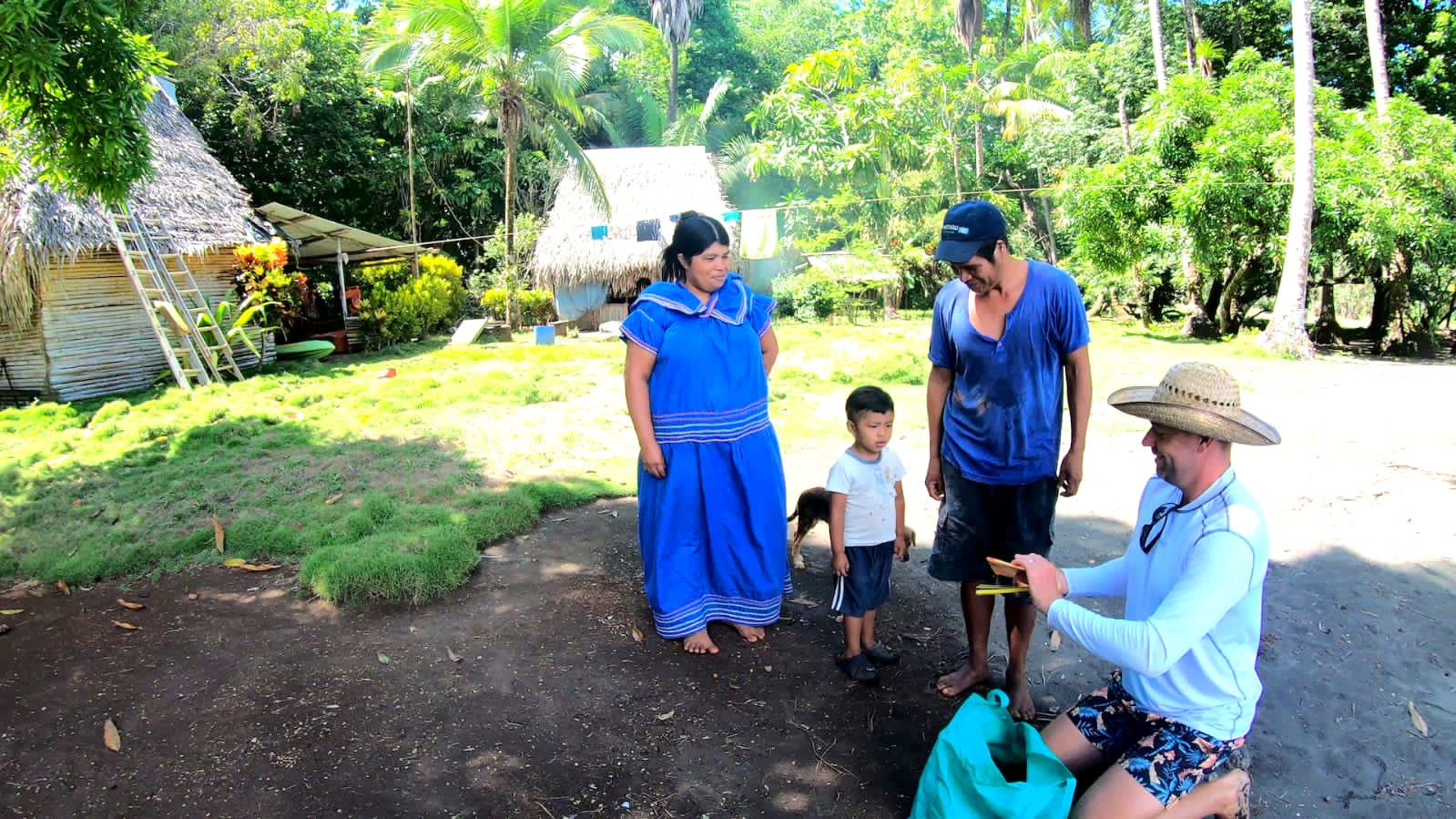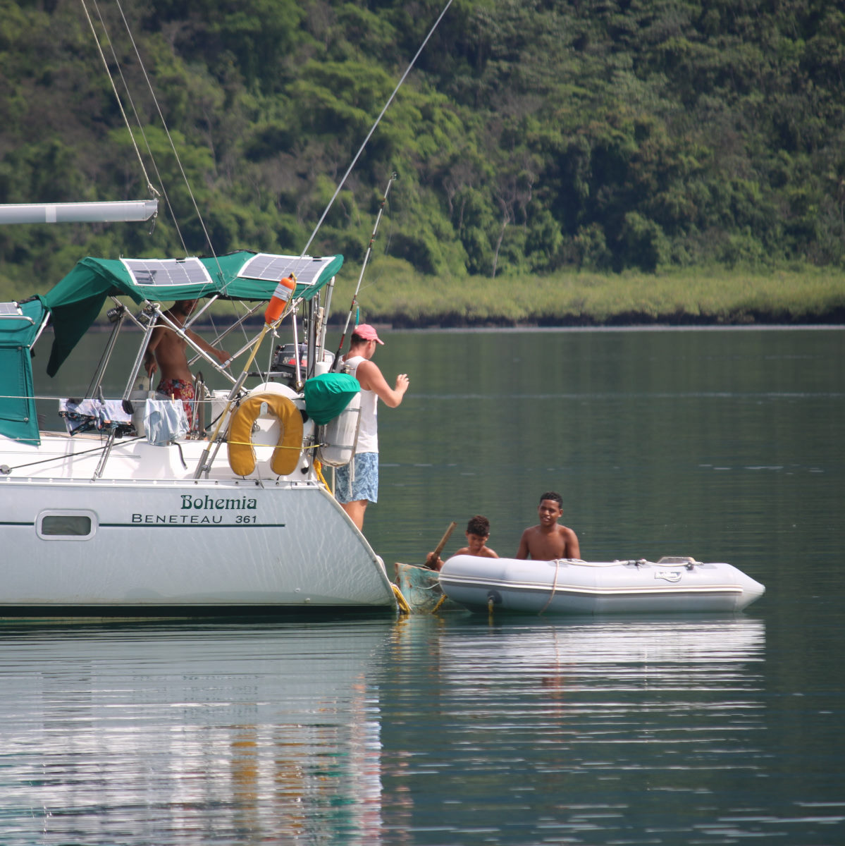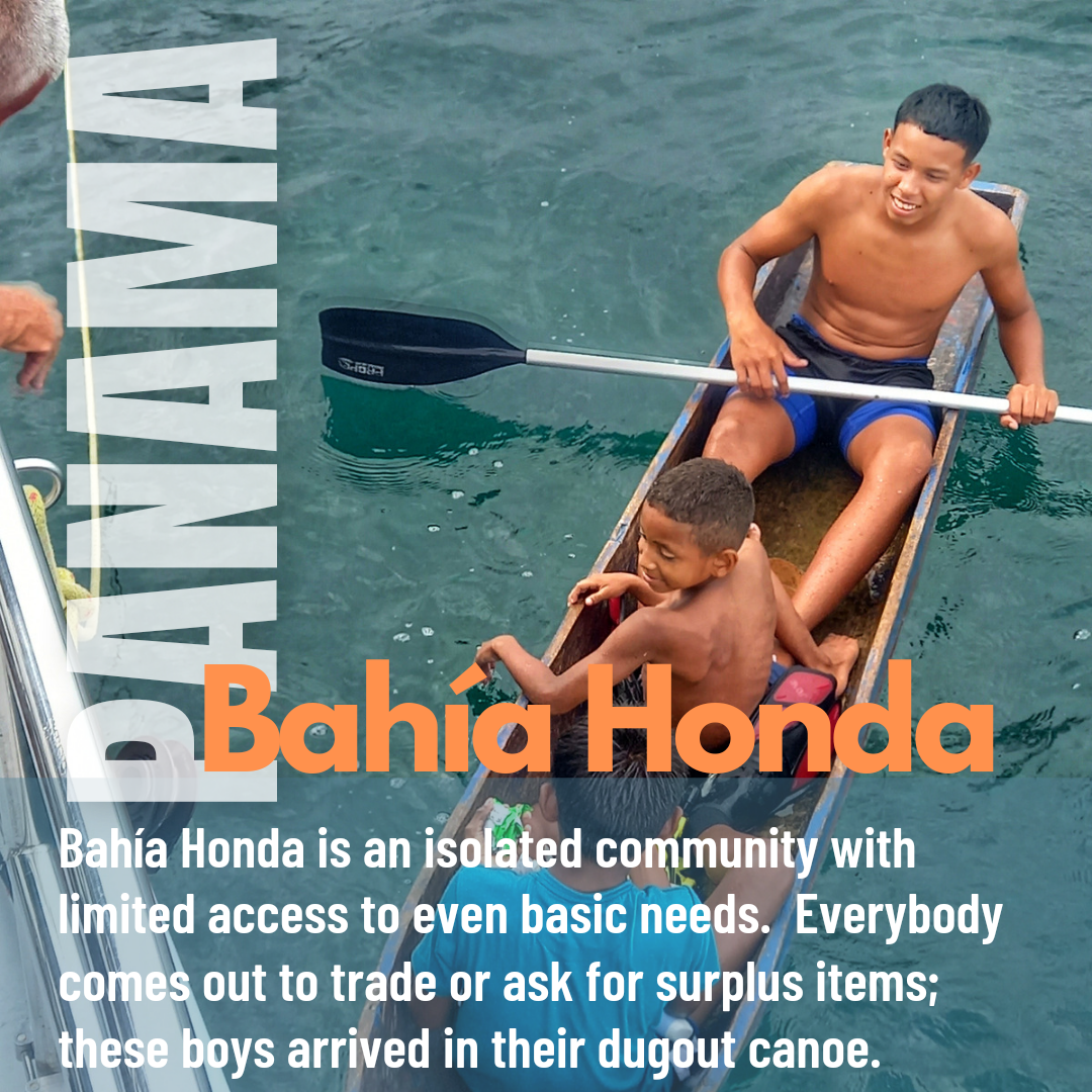 Bahía Honda is a remote community with very few resources. We had been advised to collect surplus clothing, batteries and food that we had on board and be prepared to give them or barter for anything offered by the locals. During our couple of days we had numerous visitors, including two sets of boys in dug-out canoes. One couple of brother we saw knocking mangos off a tree close by on shore. After some time, they gathered enough that were in presentable shape and launched their painted dug-out canoe to come out and trade. We gave the older one some clothes and the younger one some coloring pencils, a book, and some candy. We had a variety of other visitors including an older couple who came with on egg and a mango for trading, likely all they had, and we were happy to give them some of our surplus canned food and some clothes.