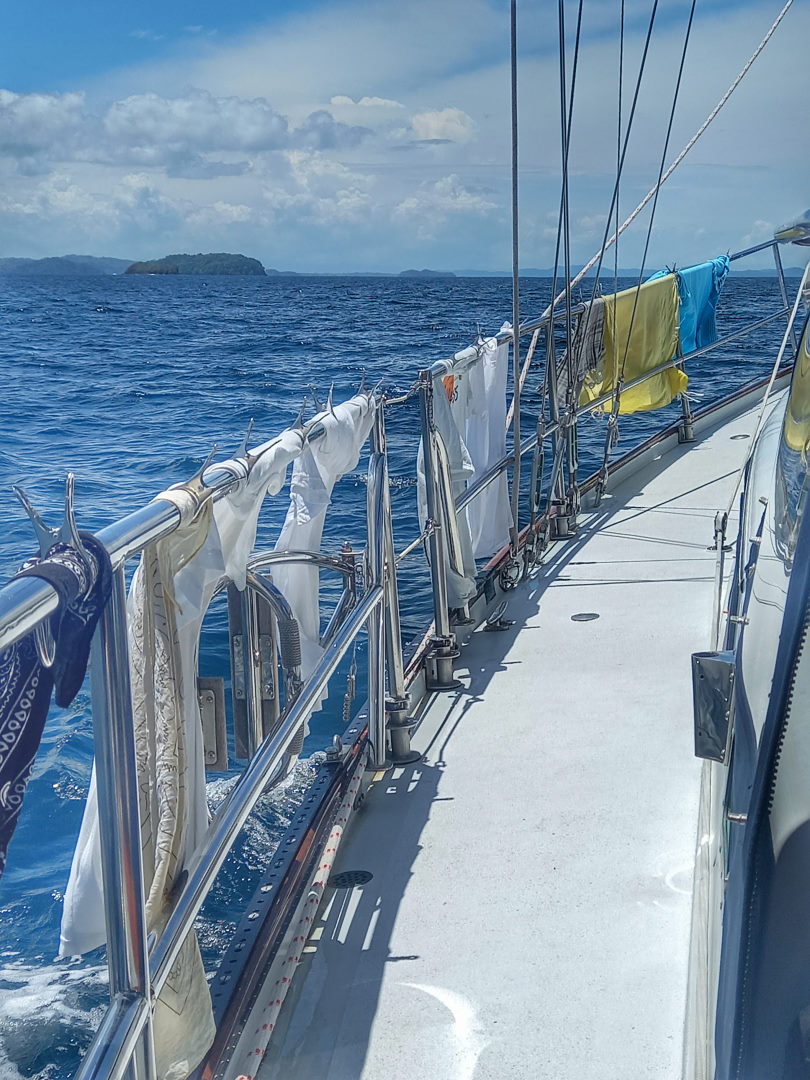 After a rolly night, the decision was easily made to move on. We stopped by BOHEMIA to give them the news and hand over shorts and a tee shirt for Jose, the caretaker on Isla Pardidita, and also coloring pencils and notebook for his small son, Diego, so that Tom and Peter could deliver them later.