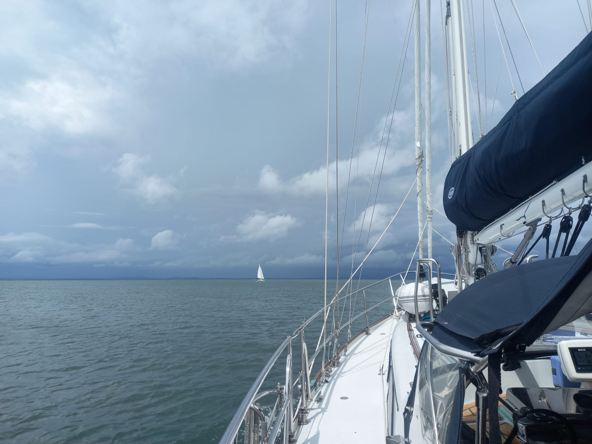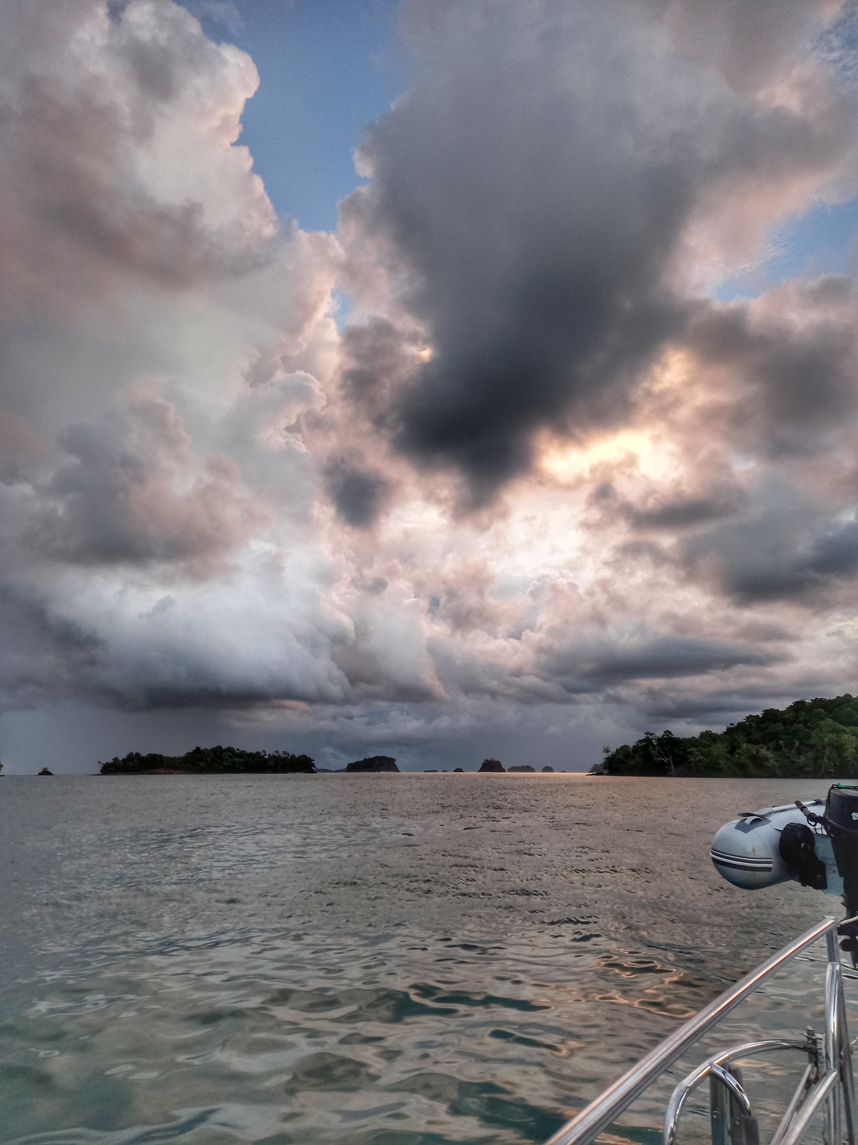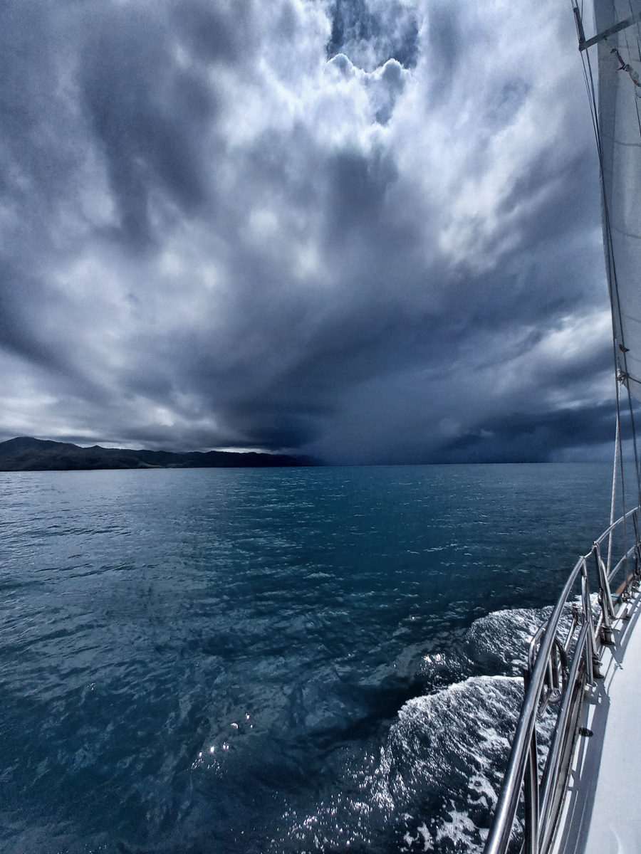 We woke up to a spectacular sky and sun combination and set off for a motor/ motor-sail around to Benau given not much in the way of favorable wind. At one point we had a downpour to contend with, the pounding rain flattening any wind waves there were.