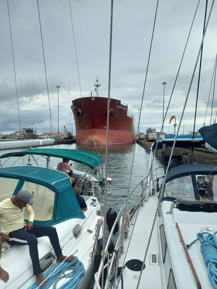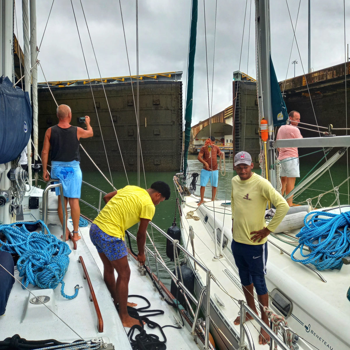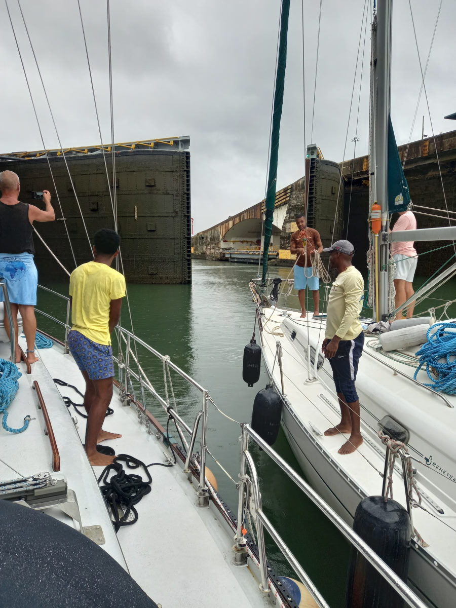 The advisors announced the process for the down locks would be different. A condition of our being permitted to exit the canal system in the one day was that we would be tied to the wall of the locks, as opposed to the center-chamber position we enjoyed in the ‘up’ locks. This is a very unfavorable situation for the ‘up’ process as the swell can cause damage to sailboat spreaders hitting the lock wall as the boat rocks around in the turbulence, however the ’down’ process, requiring only that water be drained out of the lock, is a calmer experience. Critically for the Canal Authority, being center-chamber requires four men on the side of the locks to progress the lines along as the rafted boats move through the locks, but the side wall tie requires only one canal employee on the wall.