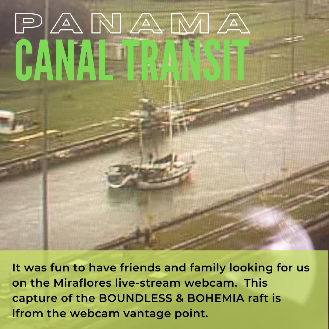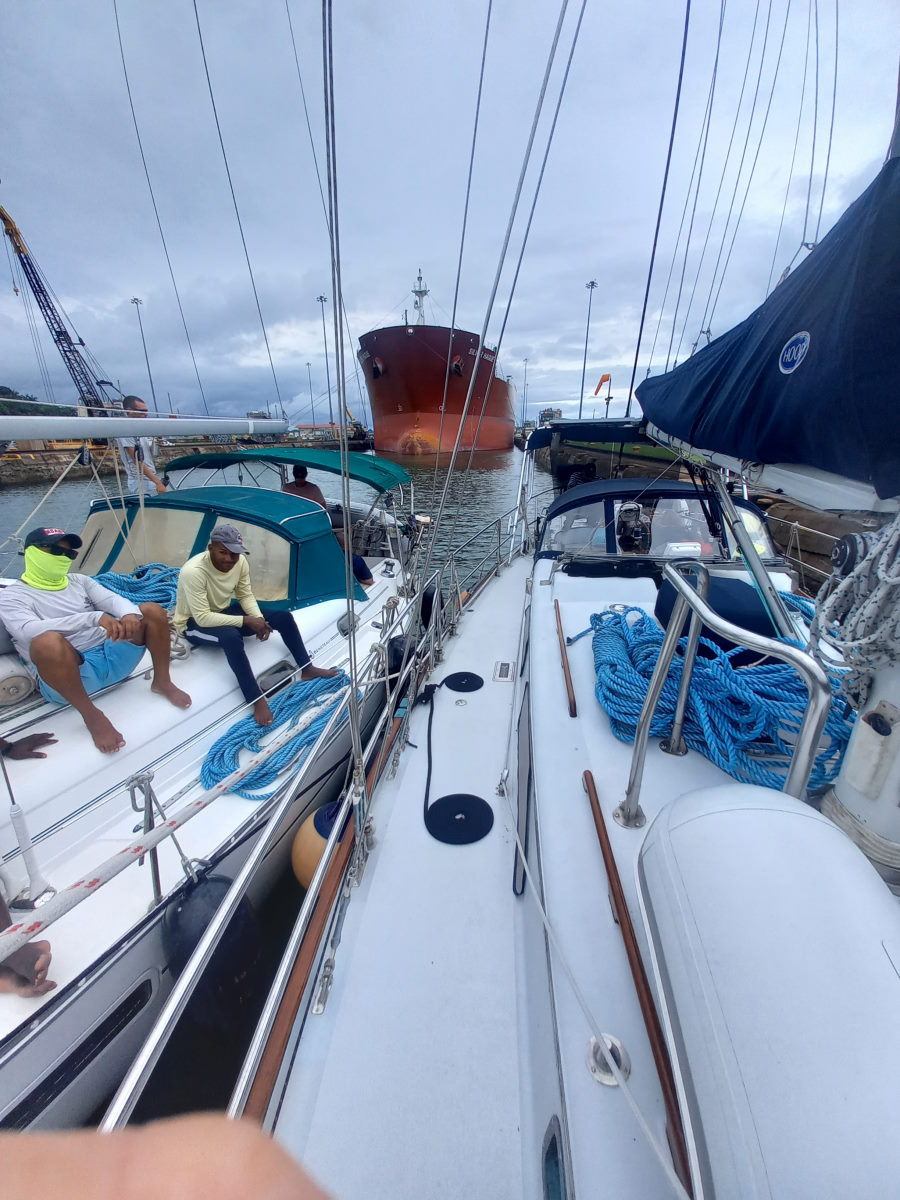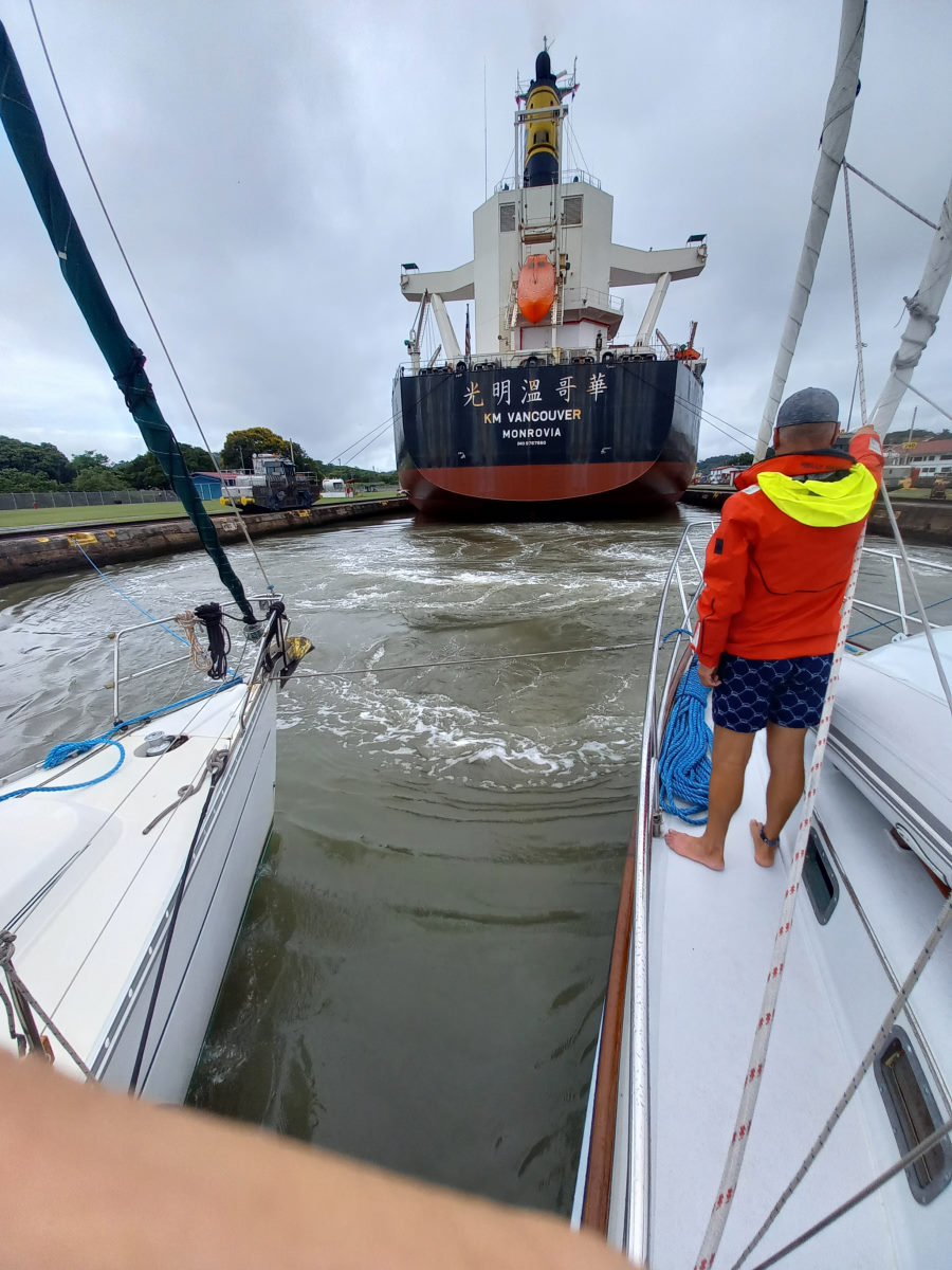 The Miraflores locks are a set of two locks and to get to the third, and final ‘up’ lock, the Pedro Miguel Lock, we traveled across the one mile of Miraflores Lake, being careful to maintain no more than a couple of knots. With the two of us still rafted together, and Boundless being the bigger of the two, Bohemia rudder was centered and was put into forward idle, while I did the steering of the rafted pair and monitored the speed. This certainly required a level of concentration that was made more acute by the 2:30am wake-up.