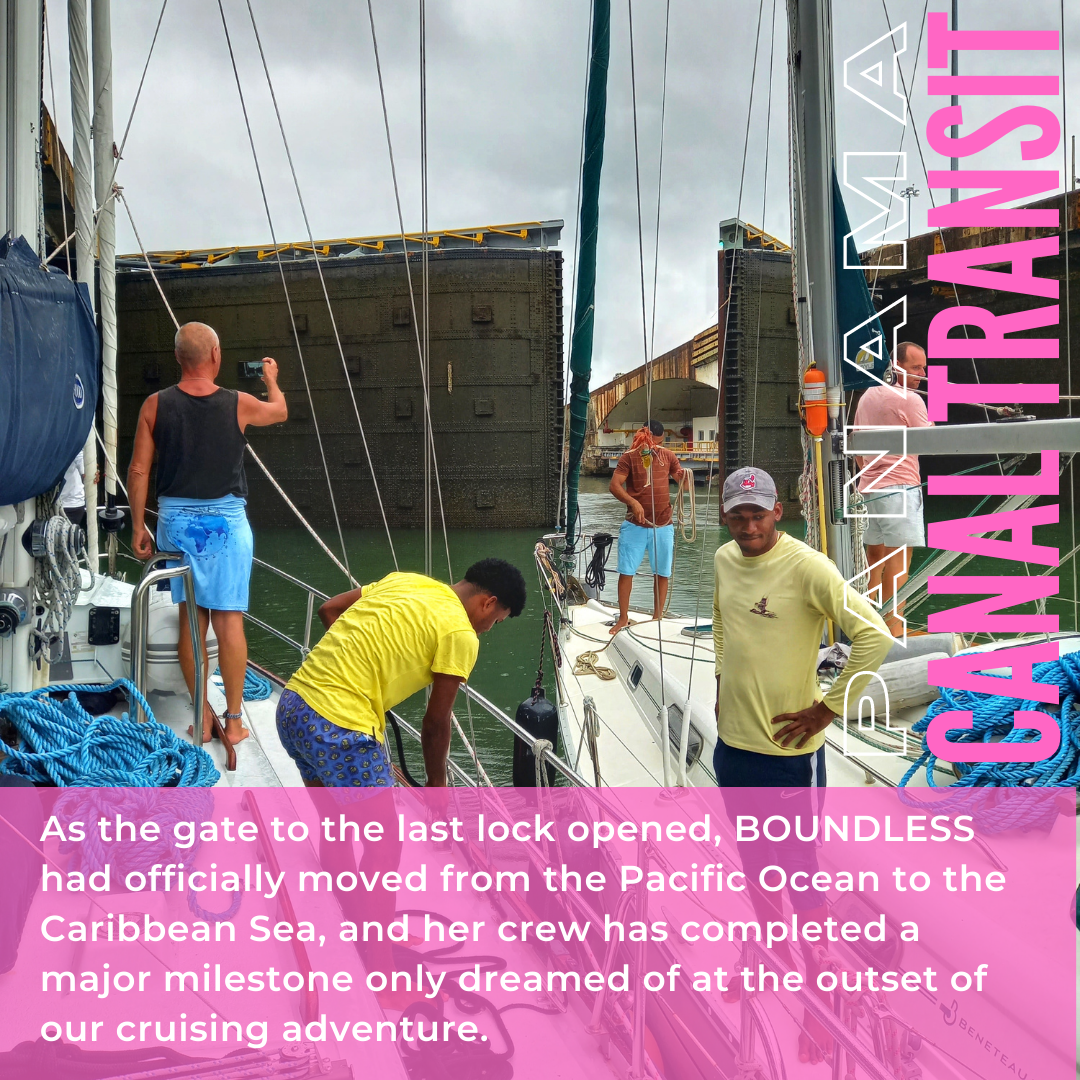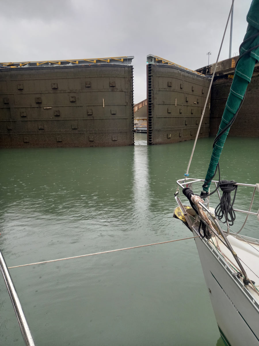 As the final lock emptied, the sky that had looked ominous for a while final gave in to light rain, which did little to hamper our enthusiasm as the forbidding steel gates opened ahead of us to reveal the Caribbean Sea, albeit murky, grey, and pelted with the persistent rain.